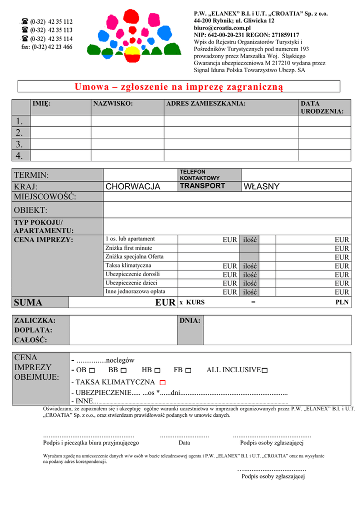 P.W. „ELANEX” B.I. i U.T. „CROATIA” Sp. z o.o. 44-200 Rybnik; ul. Gliwicka 12 [email protected] NIP: 642-00-20-231 REGON: 271859117 Wpis do Rejestru Organizatorów Turystyki i Pośredników Turystycznych pod numerem 193 prowadzony przez Marszałka Woj. Śląskiego Gwarancja ubezpieczeniowa M 217210 wydana przez Signal Iduna Polska Towarzystwo Ubezp. SA Umowa – zgłoszenie na imprezę zagraniczną IMIĘ: NAZWISKO: ADRES ZAMIESZKANIA: DATA URODZENIA: 1. 2. 3. 4. TERMIN: KRAJ: MIEJSCOWOŚĆ: TELEFON KONTAKTOWY TRANSPORT CHORWACJA WŁASNY OBIEKT: TYP POKOJU/ APARTAMENTU: CENA IMPREZY: 1 os. lub apartament EUR ilość Zniżka first minute Zniżka specjalna Oferta Taksa klimatyczna Ubezpieczenie dorośli Ubezpieczenie dzieci Inne jednorazowa opłata EUR EUR EUR EUR SUMA EUR ZALICZKA: DOPLATA: CAŁOŚĆ: CENA IMPREZY OBEJMUJE: x KURS ilość ilość ilość ilość EUR EUR EUR EUR EUR EUR EUR = PLN DNIA: - ..............noclegów - OB BB HB FB ALL INCLUSIVE - TAKSA KLIMATYCZNA - UBEZPIECZENIE..... ...os *......dni........................................................... - INNE.............................................................................................................................................. Oświadczam, że zapoznałem się i akceptuję ogólne warunki uczestnictwa w imprezach organizowanych przez P.W. „ELANEX” B.I. i U.T. „CROATIA” Sp. z o.o., oraz stwierdzam prawidłowość podanych w umowie danych. .................................................. Podpis i pieczątka biura przyjmującego ........................... ........................................... Data Podpis osoby zgłaszającej Wyrażam zgodę na umieszczenie danych w/w osób w bazie teleadresowej agenta i P.W. „ELANEX” B.I. i U.T. „CROATIA” oraz na wysyłanie na podany adres korespondencji. ….................................. Podpis osoby zgłaszającej