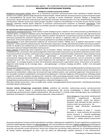 Laboratorium - biotechnologia ogólna - dla studentów kierunku biotechnologia od 2014/2015 BIOLOGICZNE OCZYSZCZANIE ŚCIEKÓW Biologiczne metody oczyszczania ścieków Biologiczne oczyszczanie ścieków opiera się na naturalnych procesach samooczyszczania, które zachodzą w każdym zbiorniku wodnym oraz w glebie, głównie dzięki aktywności drobnoustrojów. Jednak zdolności samooczyszczania są często niewystarczające do unieszkodliwienia tak dużych ilości ścieków, jakie powstają w wyniku działalności człowieka. Dlatego w biologicznym oczyszczaniu dużych ładunków zanieczyszczeń intensywność procesów samooczyszczania musi być zwielokrotniona metodami inżynieryjnymi. Metody oczyszczania wykorzystujące specjalne urządzenia intensyfikujące te naturalne procesy określa się jako sztuczne, natomiast metody oparte wyłącznie na procesach samooczyszczania nazywane są metodami naturalnymi. Część naturalnych sposobów oczyszczania ścieków ma charakter pośredni ze względu na pewien stopień ingerencji człowieka w proces. Do naturalnych metod oczyszczania należą min.: Nawadnianie szerokoprzestrzenne. Ścieki wylane na pola wsiąkają w grunt i zawarte w nich zanieczyszczenia są adsorbowane na cząstkach gleby, a następnie rozkładane przez mikroorganizmy glebowe. W ten sposób można oczyszczać tylko ograniczoną ilość ścieków, aby nie dopuścić do przeciążenia pola. Wówczas bowiem dochodzi do uruchomienia procesów beztlenowych, którym towarzyszy powstawanie substancji toksycznych i uwalnianie się odorów, a wegetacja roślin jest zahamowana. Ze względów sanitarnych, ścieki przed wylaniem na pola muszą być pozbawione czynników chorobotwórczych. Filtry gruntowe to pola wykorzystywane wyłącznie do oczyszczania ścieków. Zakłada się je na glebach piaszczystych o dużej miąższości i niskim poziomie wód gruntowych. Pola filtracyjne mają postać szeregu zdrenowanych poletek otoczonych groblami. Zasada ich działania jest podobna jak przy nawadnianiu szerokoprzestrzennym, jednak brak rolniczego użytkowania umożliwia stosowanie większych obciążeń ładunkiem zanieczyszczeń. Stawy ściekowe przypominają stawy hodowlane, lecz są mniejsze i płytsze. Stosowane są one do oczyszczania ścieków łatwo rozkładalnych (np. z przemysłu rolno-spożywczego) lub w końcowym etapie oczyszczania, po uprzednim stosowaniu innych metod. Przed wpuszczeniem do stawów, ścieki powinny być wstępnie pozbawione zawiesin (osadnik, piaskownik). Stawy ściekowe tworzą zwykle szereg złożony ze stawu : „bakteryjnego”, „glonowego” i „skorupiakowego”. W pierwszym zachodzi utlenianie zanieczyszczeń organicznych przez bakterie, co prowadzi do mineralizacji tych zanieczyszczeń, czyli ich przemiany w związki nieorganiczne (min. NO3-, PO4-), zwane też solami biogennymi lub użyźniającymi. Tak oczyszczone ścieki wpuszcza się do stawu „glonowego”. Tu rozwijają się glony na bazie soli mineralnych wytworzonych w poprzednim stawie. Oczyszczona w ten sposób z biogenów woda dostaje się do trzeciego stawu - „skorupiakowego”, w którym rozwijają się dafnie , oczliki i inne skorupiaki zajadające glony. Oczyszczalnie hydrobotaniczne (zwane też korzeniowymi lub trzcinowymi) stają się coraz bardziej popularną metodą oczyszczania ścieków, ze względu na prostotę i niskie koszty. Opierają się one na wykorzystaniu procesów samooczyszczania zachodzących w ekosystemach podmokłych, należą więc do oczyszczalni typu wetland systems, czyli systemów bagiennych. Oczyszczanie jest w tym przypadku wynikiem współdziałania mikroorganizmów glebowych i roślinności bagiennej. Mikroorganizmy rozkładają związki organiczne ścieków do związków nieorganicznych, natomiast rośliny przyswajają powstałe związki mineralne tworząc biomasę roślinną. Na oczyszczanie hydrobotaniczne składają się więc trzy zasadnicze procesy: adsorpcja zanieczyszczeń na cząstkach gleby, biodegradacja przeprowadzana przez mikroorganizmy i aktywność biologiczna roślin. Naturalne metody oczyszczania , choć są zwykle tanie i proste, wymagają jednak dużych powierzchni i neutralizują stosunkowo niewielkie ładunki zanieczyszczeń. Sztuczne metody biologicznego oczyszczania ścieków, podobnie jak naturalne, wykorzystują procesy samooczyszczania zachodzące w naturze, jednak ze zwielokrotnioną intensywnością. Np. procesy przebiegające w złożach biologicznych przypominają samooczyszczanie w glebie (udoskonalone „filtry gruntowe”), a metoda osadu czynnego opiera się na podobnych zjawiskach zachodzących w środowisku wodnym (ulepszone „stawy ściekowe”). Złoża biologiczne mają postać cylindrycznych konstrukcji wypełnionych tłuczonym kamieniem (granit), żużlem lub koksem.. Wysokość złoża dochodzi do kilku metrów, a średnica mieści się w granicach 6 - 20. Schemat takiej konstrukcji przedstawia rysunek: 1 - dopływ ścieków na złoże, 2 - zraszacz obrotowy, 3 - otwór kontrolny do czyszczenia ramion zraszacza, 4 - materiał wypełniający złoże, 5 - warstwa podtrzymująca, 6 - drenaż i wentylacja, 7 - odpływ ścieków oczyszczonych Za pomocą specjalnych zraszaczy ścieki rozpryskiwane są od góry i spływają przez wypełnienie. Po paru tygodniach na powierzchni materiału wypełniającego wytwarza się błona biologiczna. Jest ona początkowo utworzona z bakterii zooglealnych produkujących śluzowate otoczki. Z czasem skład gatunkowy błony zmienia się w wyniku procesu sukcesji. Obok różnych typów bakterii pojawiają się grzyby, pierwotniaki, wrotki, pierścienice i larwy much. Ostatecznie, po miesiącu, błona dojrzewa, tzn. jej skład dopasowuje się do rodzaju ścieków spływających po złożu i jest ona zdolna do efektywnego rozkładu zawartych w nich zanieczyszczeń. Prowadzący: dr Sławomir Wierzba Laboratorium - biotechnologia ogólna - dla studentów kierunku biotechnologia od 2014/