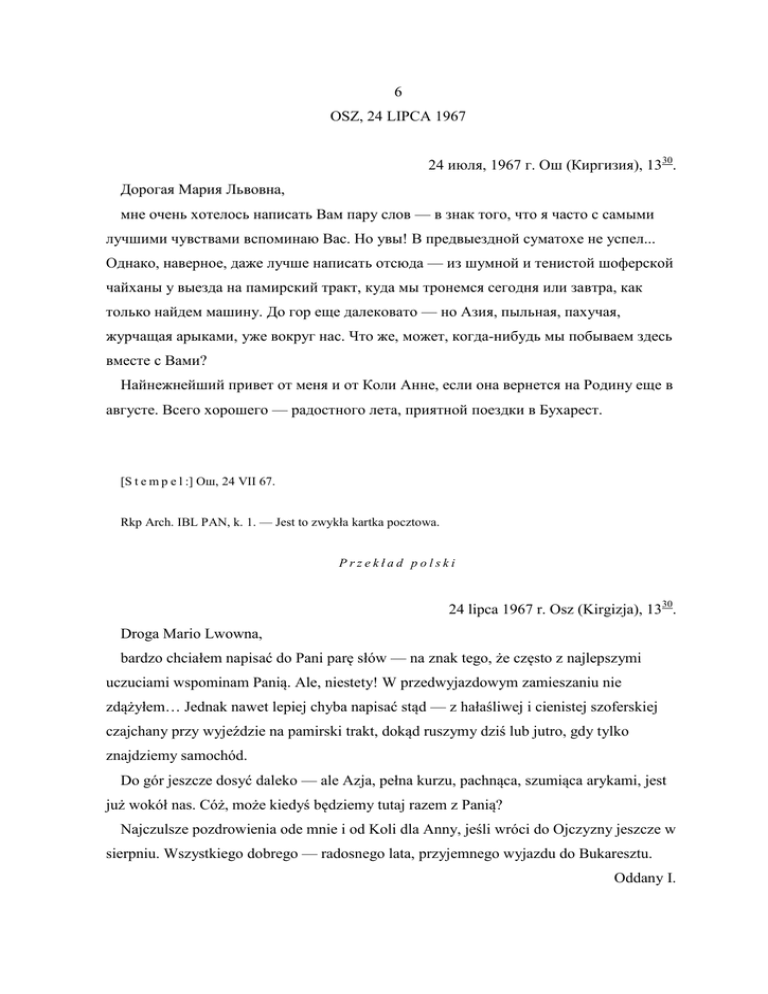 6 OSZ, 24 LIPCA 1967 24 июля, 1967 г. Ош (Киргизия), 1330. Дорогая Мария Львовна, мне очень хотелось написать Вам пару слов — в знак того, что я часто с самыми лучшими чувствами вспоминаю Вас. Но увы! В предвыездной суматохе не успел... Однако, наверное, даже лучше написать отсюда — из шумной и тенистой шоферской чайханы у выезда на памирский тракт, куда мы тронемся сегодня или завтра, как только найдем машину. До гор еще далековато — но Азия, пыльная, пахучая, журчащая арыками, уже вокруг нас. Что же, может, когда-нибудь мы побываем здесь вместе с Вами? Найнежнейший привет от меня и от Коли Анне, если она вернется на Родину еще в августе. Всего хорошего — радостного лета, приятной поездки в Бухарест. [S t e m p e l :] Ош, 24 VII 67. Rkp Arch. IBL PAN, k. 1. — Jest to zwykła kartka pocztowa. Przekład polski 24 lipca 1967 r. Osz (Kirgizja), 1330. Droga Mario Lwowna, bardzo chciałem napisać do Pani parę słów — na znak tego, że często z najlepszymi uczuciami wspominam Panią. Ale, niestety! W przedwyjazdowym zamieszaniu nie zdążyłem… Jednak nawet lepiej chyba napisać stąd — z hałaśliwej i cienistej szoferskiej czajchany przy wyjeździe na pamirski trakt, dokąd ruszymy dziś lub jutro, gdy tylko znajdziemy samochód. Do gór jeszcze dosyć daleko — ale Azja, pełna kurzu, pachnąca, szumiąca arykami, jest już wokół nas. Cóż, może kiedyś będziemy tutaj razem z Panią? Najczulsze pozdrowienia ode mnie i od Koli dla Anny, jeśli wróci do Ojczyzny jeszcze w sierpniu. Wszystkiego dobrego — radosnego lata, przyjemnego wyjazdu do Bukaresztu. Oddany I.