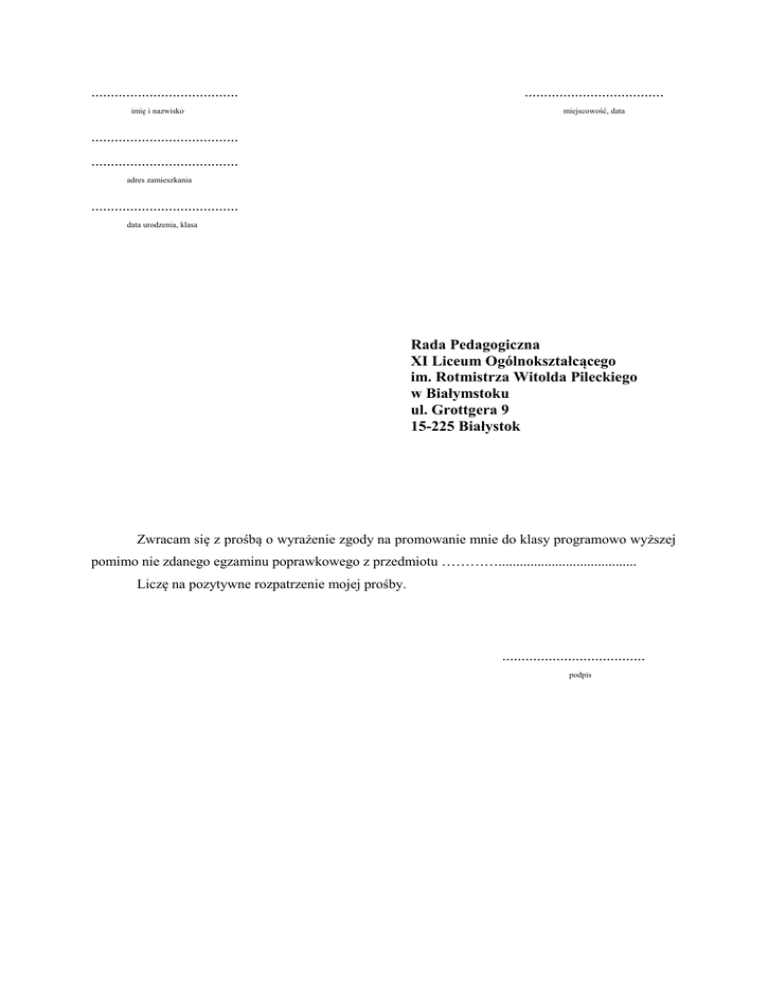 ...................................... imię i nazwisko .................................... miejscowość, data ...................................... ...................................... adres zamieszkania ...................................... data urodzenia, klasa Rada Pedagogiczna XI Liceum Ogólnokształcącego im. Rotmistrza Witolda Pileckiego w Białymstoku ul. Grottgera 9 15-225 Białystok Zwracam się z prośbą o wyrażenie zgody na promowanie mnie do klasy programowo wyższej pomimo nie zdanego egzaminu poprawkowego z przedmiotu …………....................................... Liczę na pozytywne rozpatrzenie mojej prośby. ..................................... podpis
