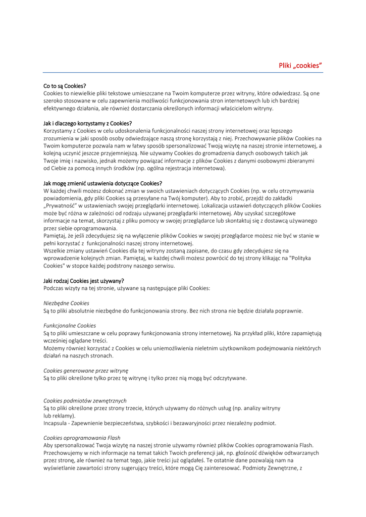 Pliki „cookies” Co to są Cookies? Cookies to niewielkie pliki tekstowe umieszczane na Twoim komputerze przez witryny, które odwiedzasz. Są one szeroko stosowane w celu zapewnienia możliwości funkcjonowania stron internetowych lub ich bardziej efektywnego działania, ale również dostarczania określonych informacji właścicielom witryny. Jak i dlaczego korzystamy z Cookies? Korzystamy z Cookies w celu udoskonalenia funkcjonalności naszej strony internetowej oraz lepszego zrozumienia w jaki sposób osoby odwiedzające naszą stronę korzystają z niej. Przechowywanie plików Cookies na Twoim komputerze pozwala nam w łatwy sposób spersonalizować Twoją wizytę na naszej stronie internetowej, a kolejną uczynić jeszcze przyjemniejszą. Nie używamy Cookies do gromadzenia danych osobowych takich jak Twoje imię i nazwisko, jednak możemy powiązać informacje z plików Cookies z danymi osobowymi zbieranymi od Ciebie za pomocą innych środków (np. ogólna rejestracja internetowa). Jak mogę zmienić ustawienia dotyczące Cookies? W każdej chwili możesz dokonać zmian w swoich ustawieniach dotyczących Cookies (np. w celu otrzymywania powiadomienia, gdy pliki Cookies są przesyłane na Twój komputer). Aby to zrobić, przejdź do zakładki „Prywatność” w ustawieniach swojej przeglądarki internetowej. Lokalizacja ustawień dotyczących plików Cookies może być różna w zależności od rodzaju używanej przeglądarki internetowej. Aby uzyskać szczegółowe informacje na temat, skorzystaj z pliku pomocy w swojej przeglądarce lub skontaktuj się z dostawcą używanego przez siebie oprogramowania. Pamiętaj, że jeśli zdecydujesz się na wyłączenie plików Cookies w swojej przeglądarce możesz nie być w stanie w pełni korzystać z funkcjonalności naszej strony internetowej. Wszelkie zmiany ustawień Cookies dla tej witryny zostaną zapisane, do czasu gdy zdecydujesz się na wprowadzenie kolejnych zmian. Pamiętaj, w każdej chwili możesz powrócić do tej strony klikając na "Polityka Cookies" w stopce każdej podstrony naszego serwisu. Jaki rodzaj Cookies jest używany? Podczas wizyty na tej stronie, używane są następujące pliki Cookies: Niezbędne Cookies Są to pliki absolutnie niezbędne do funkcjonowania strony. Bez nich strona nie będzie działała poprawnie. Funkcjonalne Cookies Są to pliki umieszczane w celu poprawy funkcjonowania strony internetowej. Na przykład pliki, które zapamiętują wcześniej oglądane treści. Możemy również korzystać z Cookies w celu uniemożliwienia nieletnim użytkownikom podejmowania niektórych działań na naszych stronach. Cookies generowane przez witrynę Są to pliki określone tylko przez tę witrynę i tylko przez nią mogą być odczytywane. Cookies podmiotów zewnętrznych Są to pliki określone przez strony trzecie, których używamy do różnych usług (np. analizy witryny lub reklamy). Incapsula - Zapewnienie bezpieczeństwa, szybkości i bezawaryjności przez niezależny podmiot. Cookies oprogramowania Flash Aby spersonalizować Twoja wizytę na naszej stronie używamy również plików Cookies oprogramowania Flash. Przechowujemy w nich informacje na temat takich Twoich preferencji jak, np. głośność dźwięków odtwarzanych przez stronę, ale również na temat tego, jakie treści już oglądałeś. Te ostatnie dane pozwalają nam na wyświetlanie zawartości strony sugerujący treści, które mogą Cię zainteresować. Podmioty Zewnętrzne, z którymi współpracujemy, aby zapewnić działanie pewnych funkcji na naszych stronach korzystają z Cookies oprogramowania Flash do gromadzenia i przechowywania informacji nie zawierających danych osobowych. Flash Cookies różnią się od innych plików używanych na tej stronie z powodu ilości, rodzaju oraz sposobu, w jaki dane są przechowywane. Narzędzia zarządzania plikami Cookies w Twojej przeglądarce nie usuną Cookies oprogramowania Flash. Aby dowiedzieć się jak zarządzać prywatnością oraz ustawieniami przechowywania Cookies w oprogramowaniu Flash kliknij tutaj: http://www.macromedia.com/support/documentation/en/flashplayer/help/settings_manager.html#117118 Lista plików Cookies używanych na tej stronie Poniższe tabele kategoryzują i opisują różne pliki Cookies używane na tej stronie: I. Ze względu na niezbędność do realizacji usługi Rodzaj Opis Niezbędne są absolutnie niezbędne do prawidłowego funkcjonowania witryny lub funkcjonalności z których użytkownik chce skorzystać Funkcjonalne Są ważne dla działania serwisu: Biznesowe II. służą wzbogaceniu funkcjonalności serwisu, bez nich serwis będzie działał poprawnie, jednak nie będzie dostosowany do preferencji użytkownika, służą zapewnieniu wysokiego poziomu funkcjonalności serwisu, bez ustawień zapisanych w plikach cookies może obniżyć się poziom funkcjonalności witryny, ale nie powinna uniemożliwić zupełnego korzystania z niej, służą bardzo ważnym funkcjonalnościom serwisu, ich zablokowanie spowoduje, że wybrane funkcje nie będą działać prawidłowo. Umożliwiają realizację modelu biznesowego w oparciu o który udostępniona jest witryna, ich zablokowanie nie spowoduje niedostępności całości funkcjonalności serwisu ale może obniżyć poziom świadczenia usługi ze względu na brak możliwości realizacji przez właściciela witryny przychodów subsydiujących działanie serwisu. Do tej kategorii należą np. cookies reklamowe. Ze względu na czas przez jaki cookies będą umieszczone w urządzeniu końcowym użytkownika Rodzaj Opis Cookies tymczasowe(session cookies) cookies umieszczone na czas korzystania z przeglądarki (sesji), zostają wykasowane po jej zamknięciu Cookies stałe (persistent cookies) nie są kasowane po zamknięciu przeglądarki i pozostają w urządzeniu użytkownika na określony czas lub bez okresu ważności w zależności od ustawień właściciela witryny III. Ze względu na pochodzenie – admi