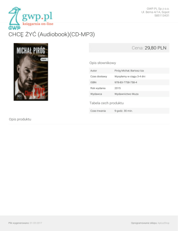 GWP.PL Sp z o.o. Ul. Bema 4/1A, Sopot 585113431 CHCĘ ŻYĆ (Audiobook)(CD-MP3) Cena: 29,80 PLN Opis słownikowy Autor Piróg Michał, Bartosz Iza Czas dostawy Wysyłamy w ciągu 3-4 dni ISBN 978-83-7758-758-4 Rok wydania 2015 Wydawca Wydawnictwo Muza Tabela cech produktu Czas trwania 9 godz. 30 min. Opis produktu Plik wygenerowano: 01-03-2017 Powered by TCPDF (www.tcpdf.org) Oprogramowanie sklepu: AptusShop
