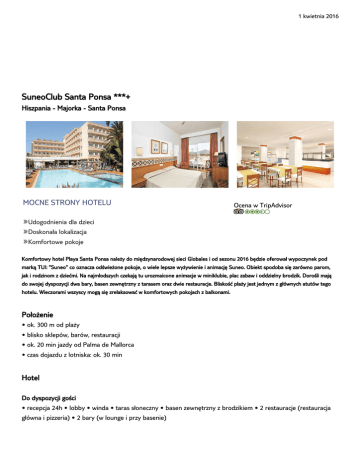 1 kwietnia 2016 Biuro Podrozy TU I TAM ul. Odrodzenia 3a 59-300 Lubin [email protected] 76 846 18 02 SuneoClub Santa Ponsa ***+ Państwa konsultant: Krzysztof Raczkowiak e-mail: [email protected] Hiszpania - Majorka - Santa Ponsa MOCNE STRONY HOTELU Ocena w TripAdvisor »Udogodnienia dla dzieci »Doskonała lokalizacja »Komfortowe pokoje Komfortowy hotel Playa Santa Ponsa należy do międzynarodowej sieci Globales i od sezonu 2016 będzie oferował wypoczynek pod marką TUI: "Suneo" co oznacza odświeżone pokoje, o wiele lepsze wyżywienie i animację Suneo. Obiekt spodoba się zarówno parom, jak i rodzinom z dziećmi. Na najmłodszych czekają tu urozmaicone animacje w miniklubie, plac zabaw i oddzielny brodzik. Dorośli mają do swojej dyspozycji dwa bary, basen zewnętrzny z tarasem oraz dwie restauracje. Bliskość plaży jest jednym z głównych atutów tego hotelu. Wieczorami wszyscy mogą się zrelaksować w komfortowych pokojach z balkonami. Położenie • ok. 300 m od plaży • blisko sklepów, barów, restauracji • ok. 20 min jazdy od Palma de Mallorca • czas dojazdu z lotniska: ok. 30 min Hotel Do dyspozycji gości • recepcja 24h • lobby • winda • taras słoneczny • basen zewnętrzny z brodzikiem • 2 restauracje (restauracja główna i pizzeria) • 2 bary (w lounge i przy basenie) Wyposażenie • leżaki, parasole (przy basenie, w cenie) • Wi-Fi (płatne) Dodatkowe udogodnienia • parking • sala konferencyjna • wymiana walut • pralnia Karty Visa, MasterCard Kategoria lokalna 3,5 gwiazdki Liczba pokojów 319 Pokoje Pokój 2-osobowy (DZX1) • 1-3 os. • klimatyzacja • balkon • wanna • WC • sejf • TV sat. • suszarka do włosów • tel. Pokój 2-osobowy (DZX2) • 2-4 os. • klimatyzacja • balkon • wanna • WC • sejf • TV sat. • suszarka do włosów • tel. Pokój rodzinny (FZX1) • 4-6 os. • 2 oddzielne pokoje (bez drzwi łączących) • klimatyzacja • balkon • wanna • WC • sejf • TV sat. • suszarka do włosów • tel. Wyżywienie All inclusive • śniadanie • obiad • kolacja • posiłki w formie bufetu • przekąski • napoje bezalkoholowe i lokalne napoje alkoholowe (10.00-24.00) • lody dla dzieci Dla dzieci • brodzik • miniklub dla dzieci 4-12 lat • minidyskoteka • plac zabaw • pokój zabaw • łóżeczko dziecięce (na zapytanie, za kaucją) Sport i Wellness W cenie • tenis stołowy Płatne • bilard • korty tenisowe