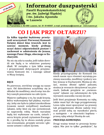 CO I JAK PRZY OŁTARZU? Za kilka tygodni będziemy przeżywali uroczystość Pierwszej Komunii Świętej dzieci klas trzecich. Jest to zawsze moment, kiedy próbuję uczyć dzieci odpowiednich postaw i zachowań w odniesieniu do Jezusa, naszego Pana i Boga, obecnego w Eucharystii. Na nic się zda ta nauka, jeśli także dorośli nie będą o te właściwe postawy dbali. W związku z tym kilka uwag i przypomnień dotyczących przyjmowania Komunii św. i naszego udział w Mszy świętej. RĘCE Po pierwsze, zwróćmy uwagę na nasze ręce. Od dzieciństwa uczyliśmy się je składać do modlitwy, niech więc ten dobry nawyk pozostanie na całe życie. Wpierw zadbajmy o to, by znak krzyża, który wykonujemy był piękny, wyrazisty; żeby nie było to jakieś nieokreślone (czasem nawet wstydliwe) machanie rękami, żeby ktoś się nie zorientował, co naprawdę robię. Niech wyraźnie będą też wykonane na czole, ustach i sercu krzyże przed czytaniem Ewangelii, z prośbą by te słowa zostały przez nas zrozumiane, przyjęte sercem i głoszone ustami i całym życiem. Kiedy przystępujemy do Komunii św. niech nasze ręce również wyrażają postawę szacunku, modlitwy i pokory wobec Jezusa w Eucharystii. Można je złożyć, można dłonie spleść palcami, można je wreszcie skrzyżować na piersiach. Jednak przyjście ze „zwieszonymi” rękami czy założonymi do tyłu wyrazem szacunku raczej nie jest. Jeśli ktoś przyjmuje Komunię na rękę, także musi być do tego przygotowany. Lewa ręka musi spoczywać na prawej; tak przygotowane dłonie należy trzymać przed sobą na wysokości piersi, a następnie – w obecności kapłana – prawą ręką włożyć Hostię do ust. PROCESJA KOMUNIJNA Drugi ważny temat to procesja komunijna. Nie jest to tylko „podejście”, by przyjąć Komunię. Ta procesja jest naszą modlitewną drogą na spotkanie z Jezusem. Trzeba ją przeżyć w spokoju, z myślą o tym, co się ma za chwilę wydarzyć. Podchodźmy do Komunii św., zwłaszcza w niedzielę, w dwóch rzędach (także wtedy, gdy jest jeden kapłan), jedna osoba za drugą, bez zbędnego przechodzenia na drogą stronę, z myślą, że wtedy „będzie szybciej”. Zanim przyjmiemy Jezusa powinniśmy Mu oddać cześć poprzez przyklęknięcie. Jeśli nie ma przeszkody związanej ze zdrowiem lub wiekiem, niech to przyklęknięcia czyni zawsze osoba stojąca za tą, która akurat przyjmuje Komunię. Osoby, które nie mogą przyklęknąć, niech w miarę możliwości skłonią się ku Jezusowie w Najświętszym Sakramencie. Gdy już przyjmiemy Komunię, odchodzimy zawsze na zewnątrz – nigdy do środka! Absolutnie nie wolno przecinać sąsiedniego rzędu lub przechodzić przed księdzem udzielającym Komunii świętej. Jeśli ktoś zmienił stronę, musi wrócić na swoje miejsce cofając się i obchodząc ludzi idących w procesji. Także do szafarzy rozdających Komunię z tyłu kościoła (zazwyczaj o g. 10.30), starajmy się podchodzić w dwóch rzędach. Nie próbujmy wymuszać rozdawania Komunii na wszystkie możliwe strony. W nawie Matki Bożej podchodzimy w trzech rzędach. STRÓJ Stały (albo raczej powracający) problem to strój w okresie letnim. Pamiętajmy, żeby był on godny miejsca świętego. Gdy zwiedzamy kościoły w innych krajach, rzeczą oczywistą jest, że nie wchodzi się do nich z odkrytymi ramionami czy w krótkich spodniach. Kiedy z młodzieżą jesteśmy w Taizé, również tam w czasie modlitwy zakrywa się ramiona i nikogo to nie dziwi. Dla ludzi dobrze wychowanych, a przede wszystkim mających pewną wrażliwość A propos stroju. Oto religijną, zdjęcie wykonane szacunek w naszym kościele dla miejsc i przesłane na adres parafii… świętych wyraża się także w stroju. Jak na określone spotkania trzeba się odpowiednio ubrać, tak i do kościoła trzeba włożyć odpowiednie ubranie… Nic dodać, nic ująć. OGŁOSZENIA DUSZPASTERSKIE 1. Msza św. dla młodzieży dziś o godz. 18.00, potem comiesięczne spotkanie dla studentów, młodzieży pracującej i uczniów szkół średnich. Serdecznie zapraszamy. 2. Msza św. w intencji próśb i podziękowań za wstawiennictwem św. Jana Pawła II będzie w piątek o godz. 18.00. Intencje można składać do skarbony w Kaplicy Patronów, gdzie są też wyłożone kartki do intencji. 3. Spotkanie wspólnoty Żywego Różańca w przyszłą niedzielę po Mszy św. o godz. 9.00. 4. Dziś kończymy zapisy na wyjazd na Światowe Dni Młodzieży w Krakowie. Deklaracje można jeszcze składać w zakrystii. 5. Brakuje nam jeszcze miejsc noclegowych dla ok. 10 os. spośród młodzieży, która odwiedzi naszą parafię w drodze na Światowe Dni Młodzieży w Krakowie. Proszę o zgłaszanie się rodzin gotowych przyjąć młodzież do swoich domów w dniach 23-25 lipca oraz pobranie w zakrystii specjalnej deklaracji wraz z informacjami. 6. W zakrystii proszę odbierać karty uczestnictwa w pielgrzymce do sanktuariów Mazur i Podlasia. Jest jeszcze kilka wolnych miejsc. 7. Po 27 kwietnia mamy trochę wolnych intencji mszalnych. Można je zamawiać w zakrystii. 8. W najbliższym tygodniu w sprawach biura parafialnego proszę się zwracać do ks. Ignacego. 1050 LAT MUZYKI W POLSCE Serdecznie zapraszamy na pierwszy koncert z cyklu „1050 lat muzyki w Polsce” obchodzony w ramach jubileuszu Chrztu Polski. Projekt ten to muzyczny szlak przez epoki i wybrane gminy powiatu poznańskiego. Pierwszy Koncert „Renesans na głosy i smyczki” odbędzie się w sobotę, 23 kwietnia o godz. 18 w kościele pw. św. Jadwigi i św. Jakuba Apostoła w Lusowie i przeniesie nas w klimat chorału gregoriańskiego i najstarszych pieśni w języku polskim. Organizator koncertów: Fundacja Europejskiego Dziedzictwa Kulturowego Europejczyk. Wstęp na wszystkie koncerty jest wolny. Serdecznie zapraszamy. INTENCJE MSZY ŚWIĘTYCH PONIEDZIAŁEK 18.04.2016 r. 18.00 – WTOREK 19.04.2016 r. 18.00 – śp. Antoniego Bura ŚRODA 20.04.2016 r. 20