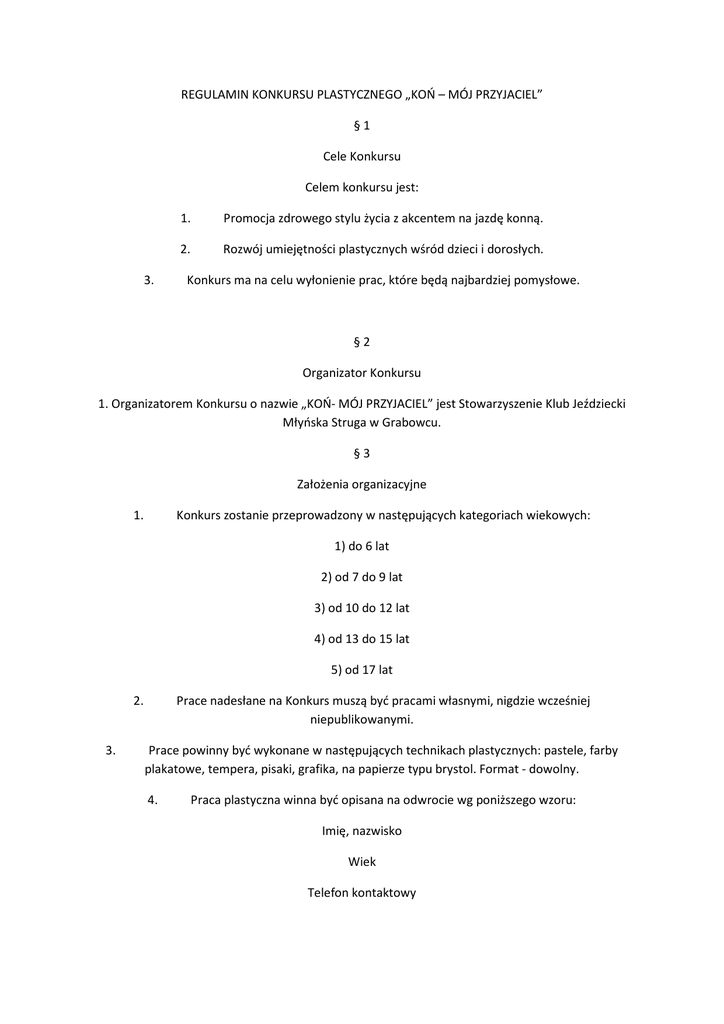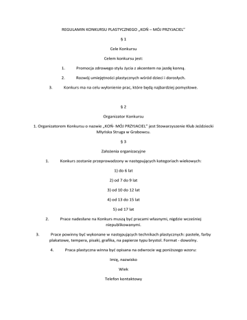 REGULAMIN KONKURSU PLASTYCZNEGO „KOŃ – MÓJ PRZYJACIEL” §1 Cele Konkursu Celem konkursu jest: 3. 1. Promocja zdrowego stylu życia z akcentem na jazdę konną. 2. Rozwój umiejętności plastycznych wśród dzieci i dorosłych. Konkurs ma na celu wyłonienie prac, które będą najbardziej pomysłowe. §2 Organizator Konkursu 1. Organizatorem Konkursu o nazwie „KOŃ- MÓJ PRZYJACIEL” jest Stowarzyszenie Klub Jeździecki Młyńska Struga w Grabowcu. §3 Założenia organizacyjne 1. Konkurs zostanie przeprowadzony w następujących kategoriach wiekowych: 1) do 6 lat 2) od 7 do 9 lat 3) od 10 do 12 lat 4) od 13 do 15 lat 5) od 17 lat 2. 3. Prace nadesłane na Konkurs muszą być pracami własnymi, nigdzie wcześniej niepublikowanymi. Prace powinny być wykonane w następujących technikach plastycznych: pastele, farby plakatowe, tempera, pisaki, grafika, na papierze typu brystol. Format - dowolny. 4. Praca plastyczna winna być opisana na odwrocie wg poniższego wzoru: Imię, nazwisko Wiek Telefon kontaktowy 5. 6. Motywem przewodnim prac jest – koń, oraz jazda konna. Udział w Konkursie jest jednoznaczny z nieodpłatnym udzieleniem praw autorskich, na wykorzystanie prac w celach promocyjnych Konkursu. 7. Osoby nadsyłające prace konkursowe wyrażają zgodę na przetwarzanie przez Organizatora Konkursu swoich danych osobowych (Ustawa o ochronie danych Osobowych z dnia 29 sierpnia 1997 roku, Dz. U. Nr 133, poz. 833, z późn. zm). 8. Prace nie spełniające zasad uczestnictwa nie będą podlegały ocenie konkursowej. §4 Ocena prac konkursowych 1. Prace należy składać do 19 grudnia 2015 r. do godz. 18.00, na adres: Klub Jeździecki Młyńska Struga Ul. Nad Rzeczką 7, Grabowiec, 87-162 Lubicz 2. O wyłonieniu laureatów Konkursu decyduje jury powołane przez Organizatora. 3. Jury pod uwagę weźmie: • zgodność tematu pracy, • jakość wykonania, • 4. oryginalność. Decyzje Komisji Konkursowej są ostateczne. §5 Ogłoszenie wyników Konkursu 1. 2. Ogłoszenie wyników nastąpi w dniu 19.12.2015 Laureaci konkursu zostaną nagrodzeni podczas wigilii, która odbędzie się 19.12.2015 w siedzibie Klubu Młyńska Struga 19.12.2015r. §6 Nagrody 1. Organizator przyzna nagrody rzeczowe dla laureatów w każdej kategorii wiekowej. ZAPRASZAMY!