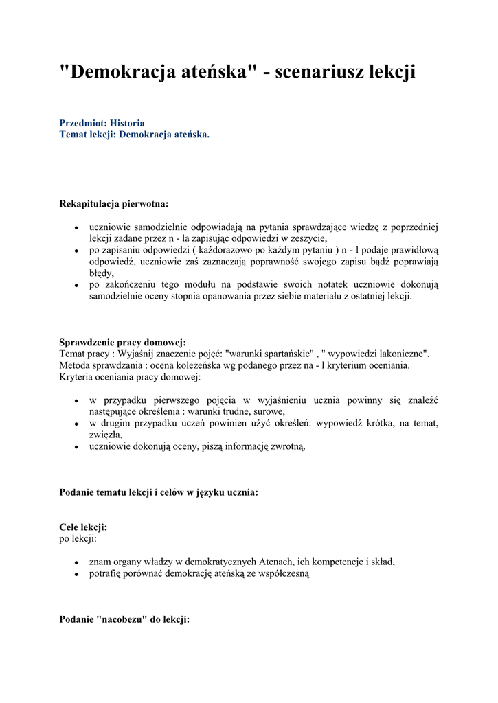 "Demokracja ateńska" - scenariusz lekcji Przedmiot: Historia Temat lekcji: Demokracja ateńska. Rekapitulacja pierwotna: uczniowie samodzielnie odpowiadają na pytania sprawdzające wiedzę z poprzedniej lekcji zadane przez n - la zapisując odpowiedzi w zeszycie, po zapisaniu odpowiedzi ( każdorazowo po każdym pytaniu ) n - l podaje prawidłową odpowiedź, uczniowie zaś zaznaczają poprawność swojego zapisu bądź poprawiają błędy, po zakończeniu tego modułu na podstawie swoich notatek uczniowie dokonują samodzielnie oceny stopnia opanowania przez siebie materiału z ostatniej lekcji. Sprawdzenie pracy domowej: Temat pracy : Wyjaśnij znaczenie pojęć: "warunki spartańskie" , " wypowiedzi lakoniczne". Metoda sprawdzania : ocena koleżeńska wg podanego przez na - l kryterium oceniania. Kryteria oceniania pracy domowej: w przypadku pierwszego pojęcia w wyjaśnieniu ucznia powinny się znaleźć następujące określenia : warunki trudne, surowe, w drugim przypadku uczeń powinien użyć określeń: wypowiedź krótka, na temat, zwięzła, uczniowie dokonują oceny, piszą informację zwrotną. Podanie tematu lekcji i celów w języku ucznia: Cele lekcji: po lekcji: znam organy władzy w demokratycznych Atenach, ich kompetencje i skład, potrafię porównać demokrację ateńską ze współczesną Podanie "nacobezu" do lekcji: musisz znać znaczenie pojęć: demokracja, tyrania, ostracyzm, wiedzieć kim byli : Solon, Klejstenes i Perykles,, umieć wymienić wszystkie organy władzy w demokratycznych Atenach ich skład i kompetencje, wskazać różnice i podobieństwa demokracji ateńskiej i współczesnej Podanie pytania kluczowego: Jak narodziła się demokracja? - wyjaśnienie uczniom powodów realizacji tego tematu. Realizacja tematu z wykorzystaniem następujących metod: - rozmowa nauczająca z elementami wykładu - praca z podręcznikiem wg podanego schematu: ewolucja ustroju Aten charakterystyka działalności ateńskich polityków: Solona, Klejstenes i Peryklesa przedstawienie organów władzy, sposobu wyboru urzędników i ich kompetencje - porównanie demokracji ateńskiej ze współczesną: metody : praca w parach i wspólne ustalenie różnic i podobieństw obu demokracji, prezentacja wyników prac. Podsumowanie lekcji: - dokończenie zdań: dziś nauczyłem się........, dowiedziałem się............. zaskoczyło mnie........ - odpowiedź na pytanie : Czy warto żyć w państwie demokratycznym? Zakończenie lekcji : - odpowiedź na pytania uczniów. . Zastosowałam następujące elementy OK : cele w języku ucznia, nacobezu, pytanie kluczowe, samoocena i ocena koleżeńska, ustalenie kryteriów oceniania pracy domowej, podsumowanie lekcji, rozmowy nauczające w parach. Realizacja tego scenariusza z zastosowaniem podanych elementów OK jest jednak niemożliwa na jednej jednostce lekcyjnej i to jest trudność z jaką muszą się liczyć nauczyciele.