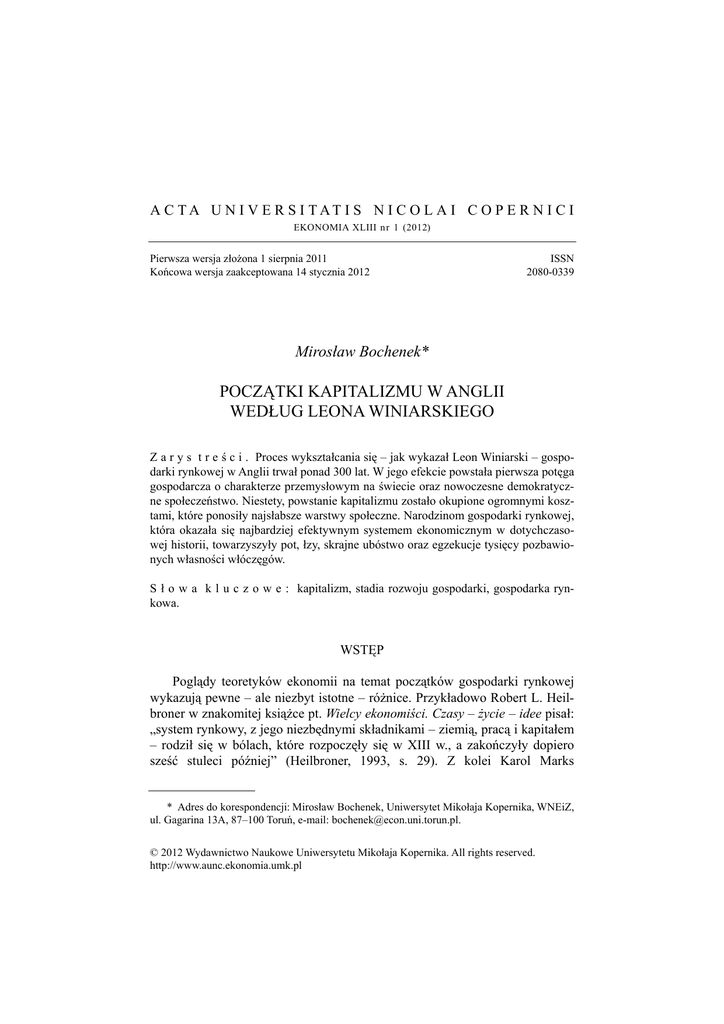 A C TA U N I V E R S I TAT I S N I C O L A I C O P E R N I C I EKONOMIA XLIII n r 1 (2012) Pierwsza wersja złożona 1 sierpnia 2011 Końcowa wersja zaakceptowana 14 stycznia 2012 ISSN 2080-0339 Mirosław Bochenek* POCZĄTKI KAPITALIZMU W ANGLII WEDŁUG LEONA WINIARSKIEGO Z a r y s t r e ś c i . Proces wykształcania się – jak wykazał Leon Winiarski – gospodarki rynkowej w Anglii trwał ponad 300 lat. W jego efekcie powstała pierwsza potęga gospodarcza o charakterze przemysłowym na świecie oraz nowoczesne demokratyczne społeczeństwo. Niestety, powstanie kapitalizmu zostało okupione ogromnymi kosztami, które ponosiły najsłabsze warstwy społeczne. Narodzinom gospodarki rynkowej, która okazała się najbardziej efektywnym systemem ekonomicznym w dotychczasowej historii, towarzyszyły pot, łzy, skrajne ubóstwo oraz egzekucje tysięcy pozbawionych własności włóczęgów. S ł o w a k l u c z o w e : kapitalizm, stadia rozwoju gospodarki, gospodarka rynkowa. WSTĘP Poglądy teoretyków ekonomii na temat początków gospodarki rynkowej wykazują pewne – ale niezbyt istotne – różnice. Przykładowo Robert L. Heilbroner w znakomitej książce pt. Wielcy ekonomiści. Czasy – życie – idee pisał: „system rynkowy, z jego niezbędnymi składnikami – ziemią, pracą i kapitałem – rodził się w bólach, które rozpoczęły się w XIII w., a zakończyły dopiero sześć stuleci później” (Heilbroner, 1993, s. 29). Z kolei Karol Marks * Adres do korespondencji: Mirosław Bochenek, Uniwersytet Mikołaja Kopernika, WNEiZ, ul. Gagarina 13A, 87–100 Toruń, e-mail: [email protected]. © 2012 Wydawnictwo Naukowe Uniwersytetu Mikołaja Kopernika. All rights reserved. http://www.aunc.ekonomia.umk.pl 92 Mirosław Bochenek utrzymywał, że „pierwsze zaczątki produkcji kapitalistycznej sporadycznie występują w niektórych miastach śródziemnomorskich już w wieku XIV i XV, to jednak era kapitalizmu datuje się dopiero od XVI wieku” (Marks, 1970, s. 514). Pogląd Marksa akceptował Paul M. Sweezy. Uważał on, że rozwój produkcji towarowej w Europie Zachodniej nastąpił w XV i XVI wieku. Rozwój kapitalizmu poprzedziła więc przedkapitalistyczna produkcja towarowa (Sweezy, 1964, s. 417). Zdaniem Mieczysława Mieszczankowskiego tezy Marksa o początkach produkcji kapitalistycznej, datowanych na drugą połowę XVI wieku, znajdują potwierdzenie w badaniach historycznych (Mieszczankowski, 1982, s. 406–407). Na narodziny kapitalizmu w łonie zachodnioeuropejskiego feudalizmu wskazywał również Józef Zawadzki. Twierdził, że zjawisko to wystąpiło w XV–XVI wieku (Zawadzki, 1974, s. 330). W wydanej w 1993 roku książce pt. 200 lat gospodarki rynkowej Wiesław Sadzikowski stał na stanowisku, że wyłanianie się gospodarki rynkowej z feudalizmu następowało w Europie Zachodniej od schyłku XVI do połowy XVIII wieku. Było to stadium pierwocin tej gospodarki (Sadzikowski, 1993, s. 14). Zapatrywanie ekonomistów w tej sprawie nie odbiega od opinii historyków gospodarczych. Jerzy Ciepielewski, Irena Kostrowicka, Zbigniew Landau i Jerzy Tomaszewski uważali, że układ kapitalistyczny wykształcał się na zachodzie Europy w XV–XVIII wieku wraz z powstawaniem manufaktur. W swym pomnikowym dziele pt. Dzieje gospodarcze świata do roku 1975 pisali: „Należy pamiętać, że powstanie kapitalizmu było wcześniejsze od narodzin nowoczesnego przemysłu fabrycznego. Elementy układu kapitalistycznego tworzyły się jeszcze w okresie, gdy dominowała gospodarka feudalna” (Ciepielewski i in., 1977, s. 34). Niestety, dostrzegalny jest jednak brak – z nielicznymi wyjątkami – pogłębionych studiów na temat społeczno-ekonomicznych koszów tworzenia się gospodarki rynkowej. Uważa się, że wiarygodny opis okropności wolnokonkurencyjnej gospodarki kapitalistycznej w postaci robotniczej nędzy, brudu, rozpaczy i beznadziejności przedstawił Fryderyk Engels w pracy Położenie klasy robotniczej w Anglii. Jednakże „obraz” Engelsa dotyczył pierwszej połowy XIX wieku, czyli ukształtowanej gospodarki rynkowej (Engels, 1952, s. 70 i n.), a nie okresu jej postawania. W 1889 roku, a więc ponad 120 lat temu, w Paryżu ukazała się interesująca rozprawa – przebywającego na emigracji – Leona Winiarskiego pt. Stosunki społeczne w Anglii. Autor zawarł w niej wnikliwą analizę kształtowania się kapitalistycznych stosunków produkcji na Wyspach Brytyjskich. Ponieważ dorobek Winiarskiego jest często pomijany w historii polskiej ekonomii, celem niniejszego opracowania jest jego przypomnienie oraz wskazanie na walory wspomnianej rozprawy. ACTA UNIVERSITATIS NICOLAI COPERNICI, EKONOMIA XLIII nr 1 (2012) 91–103 Początki kapitalizmu w Anglii według Leona Winiarskiego 93 Rozważania Winiarskiego okazują się niezmiernie ciekawe i aktualne w związku z toczącymi się od kilkudziesięciu lat dyskusjami na temat przekształceń systemowych (społeczno-ekonomicznych), które dokonują się w różnych zakątkach naszego globu. 1. ŻYCIE I TWÓRCZOŚĆ LEONA WINIARSKIEGO Leon Winiarski1 urodził się 15 lutego 1865 roku w Warszawie w żydowskiej rodzinie mieszczańskiej. Po ukończeniu V Gimnazjum zapisał się na studia prawnicze w Cesarskim Uniwersytecie Warszawskim w roku akademickim 1884–1885. Związany z Socjalno-Rewolucyjną Partią Proletariat, zwaną Wielkim Proletariatem, prowadził działalność oświatową, publicystyczną i popularyzatorską, m.in. przygotował streszczenie pierwszego tomu Kapitału Karola Marksa pt. Kapitał, towar i pieniądz. Aresztowany z innymi działaczami partii przebywał w X Pawilonie Cytadeli Aleksandrowskiej w Warszawie. Po dwunastu miesiącach (we wrześniu 1886 roku) został wypuszczony za kaucją i natychmiast opuścił rodzinną Warszawę na zawsze. Na paryskiej Sorbonie podjął studia prawnicze i ekonomiczne. Aktywnie współpracował z paryskim „Przedświtem” oraz z wydawaną w Genewie „Walką 