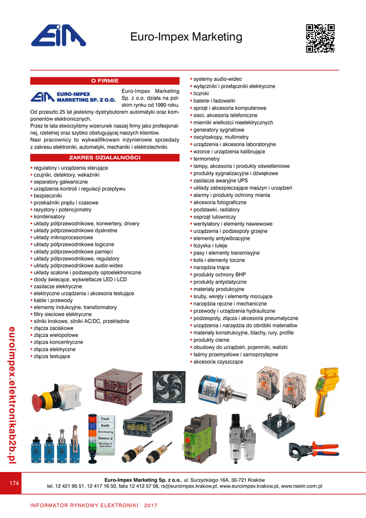 Euro-Impex Marketing O FIRMIE Euro-Impex Marketing Sp. z o.o. działa na polskim rynku od 1990 roku. Od przeszło 25 lat jesteśmy dystrybutorem automatyki oraz komponentów elektronicznych. Przez te lata stworzyliśmy wizerunek naszej firmy jako profesjonalnej, rzetelnej oraz szybko obsługującej naszych klientów. Nasi pracownicy to wykwalifikowani inżynierowie sprzedaży z zakresu elektroniki, automatyki, mechaniki i elektrotechniki. ZAKRES DZIAŁALNOŚCI euroimpex.elektronikab2b.pl 174 regulatory i urządzenia sterujące czujniki, detektory, wskaźniki separatory galwaniczne urządzenia kontroli i regulacji przepływu bezpieczniki przekaźniki prądu i czasowe rezystory i potencjometry kondensatory układy półprzewodnikowe, konwertery, drivery układy półprzewodnikowe dyskretne układy mikroprocesorowe układy półprzewodnikowe logiczne układy półprzewodnikowe pamięci układy półprzewodnikowe, regulatory układy półprzewodnikowe audio-wideo układy scalone i podzespoły optoelektroniczne diody świecące, wyświetlacze LED i LCD zasilacze elektryczne elektryczne urządzenia i akcesoria testujące kable i przewody elementy indukcyjne, transformatory filtry sieciowe elektryczne silniki krokowe, silniki AC/DC, przekładnie złącza zaciskowe złącza wielopolowe złącza koncentryczne złącza elektryczne złącza testujące systemy audio-wideo wyłączniki i przełączniki elektryczne liczniki baterie i ładowarki sprzęt i akcesoria komputerowe sieci, akcesoria telefoniczne mierniki wielkości nieelektrycznych generatory sygnałowe oscyloskopy, multimetry urządzenia i akcesoria laboratoryjne wzorce i urządzenia kalibrujące termometry lampy, akcesoria i produkty oświetleniowe produkty sygnalizacyjne i dźwiękowe zasilacze awaryjne UPS układy zabezpieczające maszyn i urządzeń alarmy i produkty ochrony mienia akcesoria fotograficzne podstawki, radiatory osprzęt lutowniczy wentylatory i elementy nawiewowe urządzenia i podzespoły grzejne elementy antywibracyjne łożyska i tuleje pasy i elementy transmisyjne koła i elementy toczne narzędzia tnące produkty ochrony BHP produkty antystatyczne materiały produkcyjne śruby, wkręty i elementy mocujące narzędzia ręczne i mechaniczne przewody i urządzenia hydrauliczne podzespoły, złącza i akcesoria pneumatyczne urządzenia i narzędzia do obróbki materiałów materiały konstrukcyjne, blachy, rury, profile produkty cierne obudowy do urządzeń, pojemniki, walizki taśmy przemysłowe i samoprzylepne akcesoria czyszczące Euro-Impex Marketing Sp. z o.o., ul. Surzyckiego 16A, 30-721 Kraków tel. 12 421 95 51, 12 417 16 50, faks 12 412 57 06, [email protected], www.euroimpex.krakow.pl, www.rseim.com.pl I N F O R M AT O R R Y N KO W Y E L E K T R O N I K I 2017 OFEROWANE PRODUKTY Nasza oferta obejmuje szeroki zakres produktów ponad 2000 firm z całego świata (obecnie ponad 700 000 pozycji katalogowych), szczególnie produktów trudno dostępnych i nietypowych. Od 10 lat specjalizujemy się także w zaopatrywaniu odbiorców przemysłowych w stałe dostawy komponentów do produkcji oraz ich konfekcjonowanie wg specyfikacji klientów. Prowadzimy także specjalistyczny montaż. W 2009 roku otrzymaliśmy NATOWSKI KOD Podmiotu Gospodarki Narodowej, co pozwala nam nieustannie poszerzać grono klientów wśród wojskowych zakładów produkcyjnych. Z myślą o naszym rozwoju i podniesieniu jakości świadczonych usług w 2012 roku wdrożyliśmy system zarządzania ISO 9001:2008 wraz z niektórymi elementami systemu TS16949. Wprowadziliśmy także dodatkowy standard – bezpośrednią konsultację inżynierską. Będzie nam zatem bardzo miło sprostać Państwa wymaganiom i oczekiwaniom. Chętnie także przyjmiemy wszelkie spostrzeżenia naszych klientów, w jaki sposób możemy polepszyć wzajemną komunikację. OBSŁUGA KLIENTA Świadczymy obsługę przede wszystkim na terenie Polski, lecz wśród naszych odbiorców znajdziecie Państwo także firmy z Europy, Japonii, Chin i USA. W zależności od Państwa potrzeb dysponujemy czasem, który przy wzajemnych kontaktach pozwoli lepiej i wydajniej sprecyzować oczekiwania i wymagania naszych klientów oraz szybko znaleźć rozwiązanie. Staramy się w miarę naszych możliwości sprostać wszystkim wymaganiom w zakresie oferty, informacji technicznych o produktach oraz całej obsługi handlowej. W związku z powyższym dbamy w szczególny sposób o terminy dostaw, które w chwili obecnej nie przekraczają 1-3 dni roboczych. Wszelkie dodatkowe informacje dotyczące naszej działalności można uzyskać w naszym dziale handlowym. Serdecznie zapraszamy. NASI PARTNERZY euroimpex.elektronikab2b.pl Miło nam poinformować, że jesteśmy wyłącznym dystrybutorem marki ATAM (złącza produkcyjne). Ponadto współpracujemy z czołowymi dostawcami z Europy i Stanów Zjednoczonych. W naszej ofercie znajdziecie Państwo także produkty z katalogu RS Components, Farnell oraz HI-TECH RESISTORS. Szczegółowe informacje dotyczące dostępności znajdują się na naszych stronach: www.rseim.com.pl oraz www.euroimpex.krakow.pl lub telefonicznie w dziale handlowym. Euro-Impex Marketing Sp. z o.o., ul. Surzyckiego 16A, 30-721 Kraków tel. 12 421 95 51, 12 417 16 50, faks 12 412 57 06, [email protected], www.euroimpex.krakow.pl, www.rseim.com.pl I N F O R M AT O R R Y N KO W Y E L E K T R O N I K I 175 2017