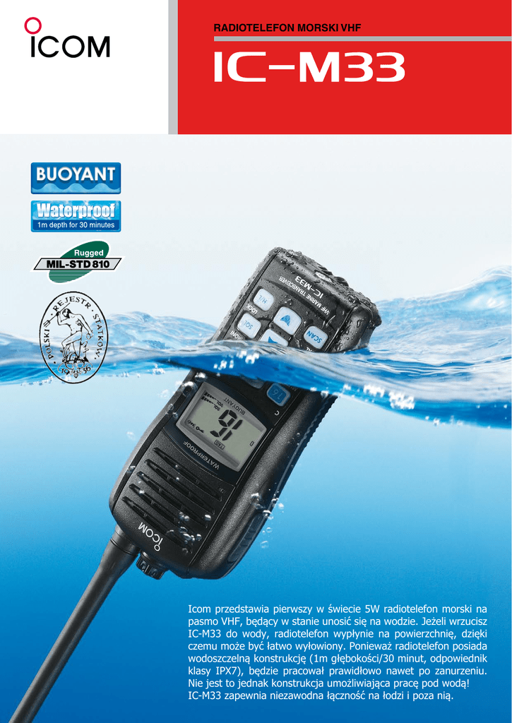 RADIOTELEFON MORSKI VHF Icom przedstawia pierwszy w świecie 5W radiotelefon morski na pasmo VHF, będący w stanie unosić się na wodzie. Jeżeli wrzucisz IC-M33 do wody, radiotelefon wypłynie na powierzchnię, dzięki czemu może być łatwo wyłowiony. Ponieważ radiotelefon posiada wodoszczelną konstrukcję (1m głębokości/30 minut, odpowiednik klasy IPX7), będzie pracował prawidłowo nawet po zanurzeniu. Nie jest to jednak konstrukcja umożliwiająca pracę pod wodą! IC-M33 zapewnia niezawodna łączność na łodzi i poza nią. MORSKI RADIOTELEFON VHF Czytelny wyświetlacz LCD z dużymi numerami kanału IC-M33 posiada czytelny wywietlacz LCD (32x16mm) z dużymi 2-cyfrowymi wskazaniami numeru kanału. Poziomy głośności i blokady szumów są także wyraźnie wyświetlane. Podświetlanie ekranu LCD i przycisków to już standard ułatwiający Rzeczywisty rozmiar wyświetlacza. pracę nocą. Łatwy w obsłudze, wygodnie leżący w dłoni 9 dużych przycisków na panelu przednim oraz pokrętło na szczycie (włączanie, wyłączanie i regulacja głośności) maksymalnie ułatwia obsługę. Radiotelefon wyży tylko 300 gramów a dzięki konstrukcji i kształtowi obudowy idealnie leży w dłoni. Szybki dostp do kanałów dzięki funkcji ULUBIONE Opcjonalny mikrofono-głośnik, HM-165 Akumulator Litowo-Jonowy i ladowarka, jako standard Dodatkowe funkcje Oznacz swoje ulubione lub najczęściej używane kanały, a następnie wciskając przycisk „Fav”, szybko i wygodnie je przywołaj, ignorując kanały nieoznaczone. Akumulator litowo-jonowy i ładowarka stojąca dostarczane są standardowo w zestawie z radiotelefonem. Akumulator litowo-jonowy BP252 zapewnia ok. 9 godzin czasu pracy*. * Tx (Hi): Rx: standby=5:5:90 Funkcja osuszająca AquaQuake Funkcja osuszająca AquaQuake emituje dźwięk wibracyjny i w razie konieczności osusza siatkę głośnika wmontowanego w panel przedni. Nowy wodoszczelny mikrofono-głośnik HM-165, dostępny w wyposażeniu dodatkowym, po podłączeniu do IC-M33 nie zakłóci jego możliwości dryfowania na wodzie. HM-165 dostarczy znakomitej jakości audio, ułatwiając połączenie. • Moc wyjściowa 5W • Funkcje podwójnego/potrójnego nasłuchu • 4-stopniowy wskaźnik żywotności akumulatora • 2-stopniowa energooszczędność • 70 kanałów programowalnych • Funkcja automatycznego skanowania • Natychmiastowy dostęp do kanału 16 i kanału wywoławczego • Dostępny w wyposażeniu dodatkowym pojemnik na baterie alkaliczne (także unosi się na wodzie, gdy podłączony do IC-M33) SPECYFIKACJE NADAJNIK OGÓLNE • Zakres częstotliwości: Morski Tx 156.000–161.450MHz Rx 156.000–163.425MHz • Dostępne kanały: Międzynarodowe, USA* (* Zależne od wersji) • Pobór mocy (przy 7.4V DC): Tx przy 5W 1.5A przy 1W 0.7A Rx max. audio 200mA • Zakres temperatury pracy: –15°C to +55°C • Impedancja anteny: 50Ω (STUD) • Wymiary: 62(szer)×141.5(wys)×43(głęb) mm • Waga: 305g (z BP-252, anteną i klipsem) • • • • • • • Moc wyjściowa: 5/1W wersja FRG 1/0.5W Maksymalna dewiacja: ±5.0kHz Zniekształcenia harmoniczne audio: poniżej 10% Błąd częstotliwości: ±1.5kHz Emisje niepożądane: poniżej 0.25µW Moc w kanale sąsiednim: 70dB Zniekształcenia wewnątrzmodulacyjne: 40dB • • • • Czułość (20dB SINAD): –2dBµ Próg zadziałania blokady szumów: –6dBµ Selektywność międzykanałowa: 70dB Odporność na zakłócenia: 0dB • Odporność na intermodulacje: 68dB • Szumy i zakłócenia w torze audio: 40dB • Moc audio: 0.2W DOSTARCZONE AKCESORIA ODBIORNIK • Akumulator BP-252 • Zasilacz AC BC-174E (zależnie od wersji) • Antena FA-SC58V Pomiary wykonano zgodnie z normą EN301-178-2. Powyższe dane mogą ulec zmianie bez powiadamiania. • Ładowarka BC-173 • Klips aligator MB-109 • Pasek na rękę OPCJE ▲ BC-173 ▲ BP-251 ▲ BP-252 BP-251 pojemnik na baterie (5x AAA) alkaliczne, moc wyjściowa 2W BP-252 akumulator litowo-jonowy (7.4V/ 980mAh), umożliwia ok. 9 godz. czasu pracy (Tx:Rx:Standby=5:5:90) ▲ ▲ BC-162 BC-174E BC-173 ładowarka stojąca + BC-174E zasilacz; do regularnego ładowania BP252 w ok.10 godz. ▲ BC-145E/UK ▲ HM-165 BC-162 ładowarka stojąca + BC-145E zasilacz; do szybkiego ładowania akumulatora, czas ładowania ok. 2 godz. HM-165 mikrofonogłośnik, wodoszczelny (IPX7) CP-17L kabel do zapalniczki samochodowej, dla BC-173 lub BC-162 (12-16V DC) ▲ MB-109 MB-109 klips do paska typu „aligator”, jak w zestawie FA-SC58V antena, jak w zestawie Odwiedź naszą stronę www.icompolska.pl Twój Autoryzowany Partner: ICOM POLSKA Sp. z o.o. 3 Maja 54, 81-850 SOPOT Tel. Fax URL E-mail +48 (58) 551 04 84 +48 (58) 551 04 84 w.21 http://www.icompolska.pl [email protected] © 2009 ICOM POLSKA Wszelkie prawa zastrzeżone. IC-M33 Ver1.0 2009-01-20