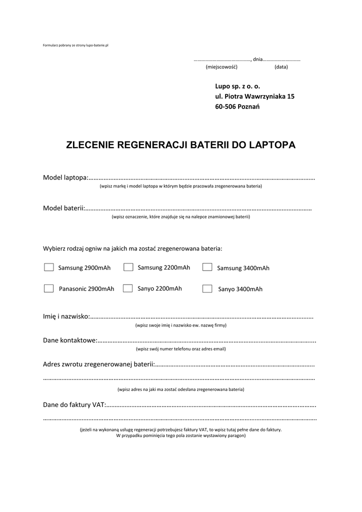 Formularz pobrany ze strony lupo-baterie.pl ………………………………………, dnia………………………… (miejscowość) (data) Lupo sp. z o. o. ul. Piotra Wawrzyniaka 15 60-506 Poznań ZLECENIE REGENERACJI BATERII DO LAPTOPA Model laptopa:……………………………………………………………………………………………………………………… (wpisz markę i model laptopa w którym będzie pracowała zregenerowana bateria) Model baterii:……………………………………………………………………………………………………………………… (wpisz oznaczenie, które znajduje się na nalepce znamionowej baterii) Wybierz rodzaj ogniw na jakich ma zostać zregenerowana bateria: Samsung 2900mAh Samsung 2200mAh Samsung 3400mAh Panasonic 2900mAh Sanyo 2200mAh Sanyo 3400mAh Imię i nazwisko:……………………………………………………………………………………………………………………. (wpisz swoje imię i nazwisko ew. nazwę firmy) Dane kontaktowe:……………………………………………………………………………………………………………….... (wpisz swój numer telefonu oraz adres email) Adres zwrotu zregenerowanej baterii:………………………………………………………………………………….. ……………………………………………………………………………………………………………………………………………… (wpisz adres na jaki ma zostać odesłana zregenerowana bateria) Dane do faktury VAT:…………………………………………………………………………………………………….………. ………………………………………………………………………………………………………………………………………………. (jeżeli na wykonaną usługę regeneracji potrzebujesz faktury VAT, to wpisz tutaj pełne dane do faktury. W przypadku pominięcia tego pola zostanie wystawiony paragon) Preferowana forma kontaktu: kontakt telefoniczny kontakt poprzez email obojętnie przy odbiorze przesyłki obojętnie przesyłka Pocztowa paczkomat Sposób płatności za regenerację: przedpłata Forma wysyłki zregenerowanej baterii: przesyłka kurierska ………………………………………. wpisz numer albo adres paczkomatu Informacje dodatkowe: Wypełniony formularz zlecenia regeneracji baterii do laptopa należy wysłać wraz z baterią na adres siedziby naszej firmy z dopiskiem na przesyłce „regeneracja baterii”. Adres naszej firmy znajdą Państwo w nagłówku powyższego formularza. Po wykonaniu usługi regeneracji przedstawiciel naszej firmy skontaktuje się z Państwem telefonicznie albo mailowo w celu ustalenia szczegółów płatności oraz sposobu odesłania baterii. W przypadku gdyby mieli Państwo jakiekolwiek pytania, bądź wątpliwości dotyczące oferowanej usługi regeneracji baterii do laptopów, to zapraszamy o kontaktu telefonicznego, bądź mailowego z naszą firmą. [email protected] tel. 501 829 067 tel. 61 642 92 82
