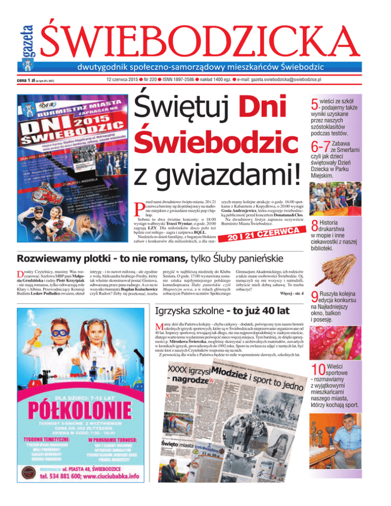 cena 1 zł (w tym 8% VAT) Świętuj Dni Świebodzic 6-7 z gwiazdami! 12 czerwca 2015 G Nr 220 G ISNN 1897−2586 G nakład 1400 egz. G e−mail: [email protected] 5 wieści ze szkół - podajemy także wyniki uzyskane przez naszych szóstoklasitów podczas testów. Zabawa ze Smerfami czyli jak dzieci świętowały Dzień Dziecka w Parku Miejskim. P rzed nami dwudniowe święto miasta. 20 i 21 czerwca bawimy się do późnej nocy na stadionie miejskim z gwiazdami muzyki pop i hiphop. Sobota to dwa świetne koncerty: o 18:00 wystąpi wałbrzyski Trzeci Wymiar, o godz. 20:00 zagrają ŁZY. Dla miłośników disco polo też będzie coś miłego - zagra i zaśpiewa BQLL. Niedziela to dzień familijny, z bogatym blokiem zabaw i konkursów dla milusińskich, a dla star- szych mamy kolejne atrakcje: o godz. 16:00 spotkanie z Kabaretem z Kopydłowa, o 20:00 wystąpi Gosia Andrzejewicz, która rozgrzeje świebodzicką publiczność przed koncertem Donatana&Cleo. Na dwudniowy festyn zaprasza oczywiście Burmistrz Miasta Świebodzice. ERWCA Z C 1 2 I 20 Rozwiewamy plotki - to nie romans, tylko Śluby panieńskie rodzy Czytelnicy, musimy Was rozczarować. Szefowa MBP pani MałgoD sia Grudzińska i radny Piotr Krzyśpiak - nie mają romansu, tylko odtwarzają role Klary i Albina. Przewodniczący Komisji Budżetu Lesław Podhalicz owszem, uknuł intrygę - i to nawet miłosną - ale zgodnie z wolą Aleksandra hrabiego Fredry, który tak właśnie skonstruował postać Gustawa, odtwarzaną przez pana radnego. A co na to wszystko burmistrz Bogdan Kożuchowicz czyli Radost? Żeby się przekonać, trzeba przyjść w najbliższą niedzielę do Klubu Seniora. O godz. 17:00 wystawiona zostanie sztuka najsłynniejszego polskiego komediopisarza Śluby panieńskie czyli Magnetyzm serca, a w rolach głównych zobaczycie Państwo uczniów Społecznego Gimnazjum Akademickiego, ich rodziców a także znane osobowości Świebodzic. Oj, namęczyli się oni wszyscy i natrudzili, żebyście mieli dobrą zabawę. To trzeba zobaczyć! Więcej - str. 4 Igrzyska szkolne - to już 40 lat amy dziś dla Państwa kolejny - chyba ciekawy - dodatek, poświęcony tym razem historii szkolnych igrzysk sportowych, które są w Świebodzicach nieprzerwanie organizowane od M 40 lat. Imprezy sportowej, trwającej tak długo, nie ma najprawdopodobniej w żadnym mieście, 8 Historia drukarstwa w mopie i inne ciekawostki z naszej biblioteki. 9 Ruszyła kolejna edycja konkursu na Najładniejszy okno, balkon i posesję. dlatego warto temu wydarzeniu poświęcić nieco więcej miejsca. Tym bardziej, że dzięki uprzejmości p. Mirosława Świerczka, mogliśmy skorzystać z archiwalnych materiałów, zawartych w kronikach igrzysk, prowadzonych do 1992 roku. Sporo tu zwłaszcza zdjęć z tamtych lat, być może ktoś z naszych Czytelników rozpozna się na nich. Z pewnością dla wielu z Państwa będzie to miłe wspomnienie dawnych, szkolnych lat. 10 Wieści sportowe - rozmawiamy z wyjątkowymi mieszkańcami naszego miasta, którzy kochają sport. 2 ogłoszenia/komunikaty piątek, 12 VI 2015 Gazeta Świebodzicka www.swiebodzice.pl Poseł Annie Zalewskiej Pani Poseł Annie Zalewskiej wyrazy głębokiego współczucia i żalu z powodu śmierci serdeczne wyrazy współczucia i wsparcia z powodu odejścia Pani Poseł Annie Zalewskiej Mamy z powodu śmierci Mamy Najszczersze wyrazy współczucia, żalu i pocieszenia Mamy składa składają składa Przewodniczący Rady Miejskiej w Świebodzicach Łukasz Kwadrans Współpracownicy Burmistrz Miasta Bogdan Kożuchowicz Świebodzice, dnia 21 maja 2015r. KOMUNIKAT Rada Miejska w Świebodzicach zawiadamia, że w nieprzekraczalnym terminie do dnia 30 czerwca 2015 roku (liczy się data wpływu do Urzędu) przyjmuje zgłoszenia kandydatów na ławników do Sądu Okręgowego i do Sądu Rejonowego w Świdnicy - kadencja 2016-2019. Działając na podstawie art. 160 §1 i §2 i art.168 ustawy z dnia 27 lipca 2001r. - Prawo o ustroju sądów powszechnych (Dz. U. z 2015 r. poz. 133), w związku z pismem Prezesa Sądu Okręgowego w Świdnicy z dnia 20 maja 2015r. znak: A.0150-3/15, w którym określono zapotrzebowanie: 1) łącznie na 12 ławników do Sądu Okręgowego w Świdnicy na kadencję 2016-2019 do Wydziału Cywilnego, 2) łącznie na 8 ławników do Sądu Rejonowego w Świdnicy na kadencję 2016-2019 (w tym 4 osoby do Wydziału Rodzinnego i Nieletnich i 4 osoby do Wydziału Pracy) informujemy o procedurze wyboru ławników: Prawo zgłaszania kandydatów na ławników mają: G prezesi właściwych sądów, stowarzyszenia, inne organizacje społeczne i zawodowe, zarejestrowane na podstawie przepisów prawa, z wyłączeniem partii politycznych, G co najmniej 50 obywateli mających czynne prawo wyborcze, zamieszkujących stale na terenie gminy dokonującej wyboru. Zgłoszenia kandydatów na ławników dokonuje się na „karcie zgłoszenia kandydata na ławnika sądowego”. Wzór karty zgłoszenia stanowi załącznik do rozporządzenia Ministra Sprawiedliwości z dnia 9 czerwca 2011r. w sprawie sposobu postępowania z dokumentami złożonymi radom gmin przy zgłaszaniu kandydatów na ławników oraz wzoru karty zgłoszenia (Dz. U. Nr 121 poz. 693). Kartę zgłoszenia udostępnia się nieodpłatnie w budynku Urzędu Miejskiego ul. Rynek l ( pokój nr 8-9) lub wzór karty jest także dostępny za pośrednictwem internetu, na stronie www.bip.swiebodzice.pl. W przypadku dokonania zgłoszenia przez obywateli, do karty zgłoszenia należy dołączyć listę osób, zawierającą imię (imiona), nazwisko, PESEL, miejsce stałego zamieszkani i własnoręczny podpis każdej z 50 osób zgłaszającej kandydata. 1. Do zgłoszenia kandydata na ławnika dokonanego na karcie zgłoszenia dołącza się następujące dokumenty: 1) informację z Krajowego Rejestru Karnego dotyczącą zgłaszanej osoby, 2) oświadczenie kandydata, że nie jest prowadzone przeciwko niemu postępowanie o przestępstwo ścigane z oskarżenia publi