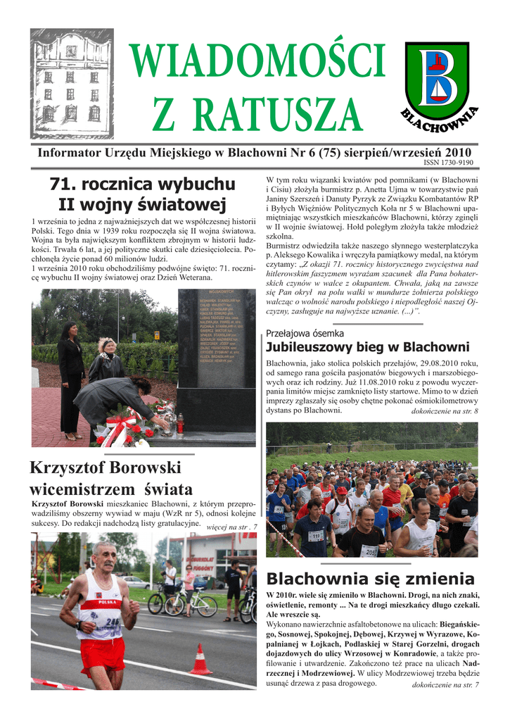 WIADOMOŚCI Z RATUSZA Informator Urzędu Miejskiego w Blachowni Nr 6 (75) sierpień/wrzesień 2010 ISSN 1730-9190 71. rocznica wybuchu II wojny światowej 1 września to jedna z najważniejszych dat we współczesnej historii Polski. Tego dnia w 1939 roku rozpoczęła się II wojna światowa. Wojna ta była największym konfliktem zbrojnym w historii ludzkości. Trwała 6 lat, a jej polityczne skutki całe dziesięciolecia. Pochłonęła życie ponad 60 milionów ludzi. 1 września 2010 roku obchodziliśmy podwójne święto: 71. rocznicę wybuchu II wojny światowej oraz Dzień Weterana. W tym roku wiązanki kwiatów pod pomnikami (w Blachowni i Cisiu) złożyła burmistrz p. Anetta Ujma w towarzystwie pań Janiny Szerszeń i Danuty Pyrzyk ze Związku Kombatantów RP i Byłych Więźniów Politycznych Koła nr 5 w Blachowni upamiętniając wszystkich mieszkańców Blachowni, którzy zginęli w II wojnie światowej. Hołd poległym złożyła także młodzież szkolna. Burmistrz odwiedziła także naszego słynnego westerplatczyka p. Aleksego Kowalika i wręczyła pamiątkowy medal, na którym czytamy: „Z okazji 71. rocznicy historycznego zwycięstwa nad hitlerowskim faszyzmem wyrażam szacunek dla Pana bohaterskich czynów w walce z okupantem. Chwała, jaką na zawsze się Pan okrył na polu walki w mundurze żołnierza polskiego walcząc o wolność narodu polskiego i niepodległość naszej Ojczyzny, zasługuje na najwyższe uznanie. (...)”. Przełajowa ósemka Jubileuszowy bieg w Blachowni Blachownia, jako stolica polskich przełajów, 29.08.2010 roku, od samego rana gościła pasjonatów biegowych i marszobiegowych oraz ich rodziny. Już 11.08.2010 roku z powodu wyczerpania limitów miejsc zamknięto listy startowe. Mimo to w dzień imprezy zgłaszały się osoby chętne pokonać ośmiokilometrowy dystans po Blachowni. dokończenie na str. 8 Krzysztof Borowski wicemistrzem świata Krzysztof Borowski mieszkaniec Blachowni, z którym przeprowadziliśmy obszerny wywiad w maju (WzR nr 5), odnosi kolejne sukcesy. Do redakcji nadchodzą listy gratulacyjne. więcej na str . 7 Blachownia się zmienia W 2010r. wiele się zmieniło w Blachowni. Drogi, na nich znaki, oświetlenie, remonty ... Na te drogi mieszkańcy długo czekali. Ale wreszcie są. Wykonano nawierzchnie asfaltobetonowe na ulicach: Biegańskiego, Sosnowej, Spokojnej, Dębowej, Krzywej w Wyrazowe, Kopalnianej w Łojkach, Podlaskiej w Starej Gorzelni, drogach dojazdowych do ulicy Wrzosowej w Konradowie, a także profilowanie i utwardzenie. Zakończono też prace na ulicach Nadrzecznej i Modrzewiowej. W ulicy Modrzewiowej trzeba będzie usunąć drzewa z pasa drogowego. dokończenie na str. 7 Poświęcenie i nadanie Sztandaru Koła Nr 15 PZER i I w Blachowni Seniorzy mają swój Sztandar W niedzielę 1 sierpnia 2010r. o godz. 9.30 odbyła się w kościele p.w. Matki Bożej Królowej Polski ceremonia poświęcenia i nadania sztandaru PZER i I dla Koła nr 15 w Blachowni. Na uroczystość przybyły delegacje: z Urzędu Miejskiego w Blachowni z p. burmistrz Anettą Ujmą na czele, delegacja Zarządu Okręgu PZER i I w Częstochowie, przedstawiciele zaprzyjaźnionych kół seniorów, delegacja ze starostwa powiatowego, sponsorzy, zaproszeni goście i mieszkańcy blachowniańskich parafii. Msza Święta miała bardzo uroczysty charakter, była celebrowana przez ks. Andrzeja Walaszczyka. Po uroczystości w kościele, pochód ze sztandarem przeszedł ulicą Kubowicza na plac OSP, gdzie świętowano do wieczora ważne dla seniorów wydarzenie. Ze sceny ustawionej przed siedzibą Koła przewodnicząca p. Henryka Ball witała wszystkich gości i w krótkiej mowie wyraziła wdzięczność wszystkim zaangażowanym w jego działalność oraz radość z okazji 40- lecia powstania Koła nr 15 PZER i I w Blachowni: „Jesteśmy dumni z tego, że przetrwaliśmy tak długo i nadal istniejemy, że kilka chwil temu w kościele Matki Bożej Królowej Polski w Blachowni mogliśmy uczestniczyć w ważnym wydarzeniu w dziejach naszego Koła. Od dzisiaj, poświęcony i nadany nam z okazji 40lecia powstania Koła sztandar, przypominać będzie, że dobroć w jedności zwycięża. Sztandar, symbol 40- letniej tradycji Koła, jest uwieńczeniem starań i konsekwentnej realizacji planów ostatnich dwóch lat naszej pracy. Z tego miejsca pragnę serdecznie podziękować obecnym tu dzisiaj byłym Przewodniczącym Koła nr 15 i wspomnieć tych, których już nie ma wśród nas, a którzy zapisali się w historii Koła (...). Pragnę podziękować sponsorom: Dziękuję Pani Burmistrz za ufundowanie drzewca sztandaru, dziękuję wszystkim członkom Koła, bo bez ich zaangażowania sztandaru by nie było, dziękuję wszystkim darczyńcom, którzy wnieśli swój wkład umożliwiając sfinansowanie płata sztandaru. Tradycją naszego Koła jest uhonorowanie osób, które wspierają nasze inicjatywy, służą bezinteresowną pomocą i poświęcają nam swój cenny czas. Proszę więc naszych miłych gości o podejście i wbicie pamiątkowego, imiennego gwoździa oraz wpisanie się do Księgi Pamięci naszego sztandaru. Serdecznie zapraszam: proboszcza parafii p.w. Michała Archanioła - ks. Andrzeja Walaszczyka, Burmistrz Blachownipanią Anettę Ujma, Prezesa Zarządu Okręgu PZER i I w Częstochowie panią Irenę Pianka, Chrzestną i Chrzestnego naszego sztandaru- panią Jadwigę Łysakowską i pana Marka Długosza”. Po części oficjalnej, zaproszonych gości zabawiały swoim repertuarem słowno- muzycznym zespoły folklorystyczne: „Blachowianki”, „Cisianki”, „Złota Jesień” z Herbów, oraz solistka kapeli pana Waldemara - pani Wrońska. Biesiada, śpiew i taniec- w tak miłej, rozrywkowej atmosferze seniorzy spędzili cały dzień do późnego wieczora. Myślikowska Anna Blachownia doczekała się księgarni „Edukacyjna” „Dojazd do księgarni w Częstochowie pociąga za sobą koszty przejazdu, dlatego uważamy, że Blachownia jest na tyle 