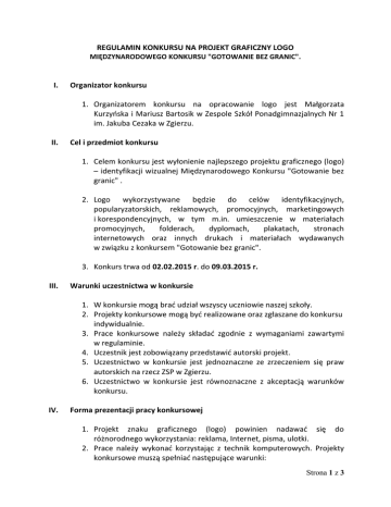 REGULAMIN KONKURSU NA PROJEKT GRAFICZNY LOGO MIĘDZYNARODOWEGO KONKURSU "GOTOWANIE BEZ GRANIC". I. Organizator konkursu 1. Organizatorem konkursu na opracowanie logo jest Małgorzata Kurzyńska i Mariusz Bartosik w Zespole Szkół Ponadgimnazjalnych Nr 1 im. Jakuba Cezaka w Zgierzu. II. Cel i przedmiot konkursu 1. Celem konkursu jest wyłonienie najlepszego projektu graficznego (logo) – identyfikacji wizualnej Międzynarodowego Konkursu "Gotowanie bez granic" . 2. Logo wykorzystywane będzie do celów identyfikacyjnych, popularyzatorskich, reklamowych, promocyjnych, marketingowych i korespondencyjnych, w tym m.in. umieszczenie w materiałach promocyjnych, folderach, dyplomach, plakatach, stronach internetowych oraz innych drukach i materiałach wydawanych w związku z konkursem "Gotowanie bez granic". 3. Konkurs trwa od 02.02.2015 r. do 09.03.2015 r. III. Warunki uczestnictwa w konkursie 1. W konkursie mogą brać udział wszyscy uczniowie naszej szkoły. 2. Projekty konkursowe mogą być realizowane oraz zgłaszane do konkursu indywidualnie. 3. Prace konkursowe należy składać zgodnie z wymaganiami zawartymi w regulaminie. 4. Uczestnik jest zobowiązany przedstawić autorski projekt. 5. Uczestnictwo w konkursie jest jednoznaczne ze zrzeczeniem się praw autorskich na rzecz ZSP w Zgierzu. 6. Uczestnictwo w konkursie jest równoznaczne z akceptacją warunków konkursu. IV. Forma prezentacji pracy konkursowej 1. Projekt znaku graficznego (logo) powinien nadawać się do różnorodnego wykorzystania: reklama, Internet, pisma, ulotki. 2. Prace należy wykonać korzystając z technik komputerowych. Projekty konkursowe muszą spełniać następujące warunki: Strona 1 z 3 Na formacie A4 należy przedstawić znak mieszczący się w polu 15 cm x 15 cm. Wykonane projekty mają mieć postać wektorową. W swej treści projekt nie może zawierać elementów obraźliwych. Każdy projekt powinien być przedstawiony w wersji kolorowej i czarnobiałej. 3. Logo winno charakteryzować się następującymi cechami; być czytelne i łatwe do zapamiętania, być łatwo identyfikowane z konkursem międzynarodowym "Gotowanie bez granic" (edycje cykliczne). wzbudzać pozytywne emocje, składać się : ✔ z logotypu (stylizacji literowej) i z elementu graficznego będącego symbolem czyli połączenia obu tych elementów. 7. Logo nie powinno być skomplikowane pod względem graficznym i kolorystycznym. 8. Prace należy składać w estetycznej formie, w kopercie opatrzonej hasłem KONKURS NA PROJEKT GRAFICZNY LOGO MIĘDZYNARODOWEGO KONKURSU "GOTOWANIE BEZ GRANIC": ✔ imię i nazwisko, ✔ klasę, ✔ płytę lub inny nośnik z wykonanym projektem w oryginalnym formacie wektorowym wraz z nazwą programu, w którym projekt został wykonany np. (Adobe Ilustrator CS6 - Ai, CorelDraw X5 - cdr). V. Miejsce i termin składania prac konkursowych 1. Prace należy składać do dnia 09.03.2015 r. do p. Małgorzaty Kurzyńskiej lub p. Mariusza Bartosika lub p. Wiolety Gabary – kierownika szkolenia praktycznego. 2. Prace konkursowe, nie spełniające wymagań, o których mowa w regulaminie konkursu, nie będą podlegały ocenie Komisji Konkursowej. 3. Prace dostarczone po terminie nie będą oceniane. 4. Organizator nie zwraca prac. VI. Kryteria oceny prac konkursowych Projekty oceniane będą zgodnie z następującymi kryteriami: ✔ zgodność projektu z danymi MIĘDZYNARODOWEGO KONKURSU "GOTOWANIE BEZ GRANIC". ✔ oryginalność znaku, łatwość zapamiętywania, Strona 2 z 3 ✔ czytelność i funkcjonalność projektu, ✔ estetyka wykonania projektu. VII. Ocena prac konkursowych 1. Zwycięskie prace zostaną wybrane przez Komisję Konkursową, w składzie: ✔ p. Małgorzata Kurzyńska ✔ p. Mariusz Bartosik ✔ p. Wioleta Gabara VIII. Rozstrzygnięcie konkursu 1. W wyniku postępowania konkursowego Komisja Konkursowa wyłania zwycięzcę konkursu. 2. Dla zwycięzców przewidziane są nagrody 3. Planowana data ogłoszenia wyników 16.03.2015 r. 4. Wyniki zostaną zamieszczone na stronie internetowej szkoły. Regulamin opracowała: Małgorzata Kurzyńska Strona 3 z 3