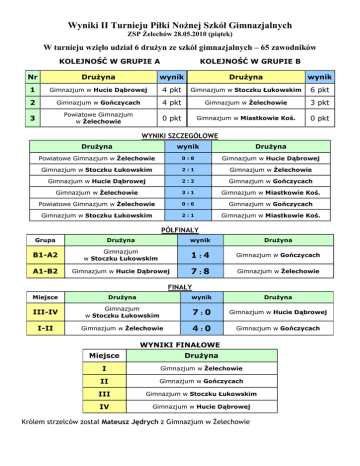 Wyniki II Turnieju Piłki NoŜnej Szkół Gimnazjalnych ZSP śelechów 28.05.2010 (piątek) W turnieju wzięło udział 6 druŜyn ze szkół gimnazjalnych – 65 zawodników KOLEJNOŚĆ W GRUPIE A KOLEJNOŚĆ W GRUPIE B Nr DruŜyna wynik DruŜyna wynik 1 Gimnazjum w Hucie Dąbrowej 4 pkt Gimnazjum w Stoczku Łukowskim 6 pkt 2 Gimnazjum w Gończycach 4 pkt Gimnazjum w śelechowie 3 pkt 3 Powiatowe Gimnazjum w śelechowie 0 pkt Gimnazjum w Miastkowie Koś. 0 pkt WYNIKI SZCZEGÓŁOWE DruŜyna wynik DruŜyna Powiatowe Gimnazjum w śelechowie 0:8 Gimnazjum w Hucie Dąbrowej Gimnazjum w Stoczku Łukowskim 2:1 Gimnazjum w śelechowie Gimnazjum w Hucie Dąbrowej 2:2 Gimnazjum w Gończycach Gimnazjum w śelechowie 3:1 Gimnazjum w Miastkowie Koś. Powiatowe Gimnazjum w śelechowie 0:6 Gimnazjum w Gończycach Gimnazjum w Stoczku Łukowskim 2:1 Gimnazjum w Miastkowie Koś. PÓŁFINAŁY Grupa DruŜyna wynik DruŜyna B1-A2 Gimnazjum w Stoczku Łukowskim 1:4 Gimnazjum w Gończycach A1-B2 Gimnazjum w Hucie Dąbrowej 7:8 Gimnazjum w śelechowie FINAŁY Miejsce DruŜyna wynik DruŜyna III-IV Gimnazjum w Stoczku Łukowskim 7:0 Gimnazjum w Hucie Dąbrowej I-II Gimnazjum w śelechowie 4:0 Gimnazjum w Gończycach WYNIKI FINAŁOWE Miejsce DruŜyna I Gimnazjum w śelechowie II Gimnazjum w Gończycach III Gimnazjum w Stoczku Łukowskim IV Gimnazjum w Hucie Dąbrowej Królem strzelców został Mateusz Jędrych z Gimnazjum w śelechowie Wyniki II Turnieju Piłki NoŜnej w kategorii open - 29.05.2010 (sobota) W turnieju wzięło udział 7 druŜyn – 76 zawodników KOLEJNOŚĆ W GRUPIE A KOLEJNOŚĆ W GRUPIE B Nr DruŜyna wynik DruŜyna wynik 1 „Świt-Rol” Budziska 7 pkt „Kryształ” śelechów 6 pkt 2 „Bajpol” śelechów 5 pkt „Iskra” Gózdek 3 pkt 3 „Drink-Team” śelechów 3 pkt „Maraton” Mysłów 0 pkt 4 „Czarni” Mroków 1 pkt ------------------------ ------ WYNIKI SZCZEGÓŁOWE DruŜyna wynik DruŜyna „Świt-Rol” Budziska 2:1 „Czarni” Mroków „Drink-Team” śelechów 1:3 „Bajpol” śelechów „Iskra” Gózdek 2:0 „Maraton” Mysłów „Czarni” Mroków 1:2 „Drink-Team” śelechów „Świt-Rol” Budziska 1:1 „Bajpol” śelechów „Kryształ” śelechów 2:1 „Maraton” Mysłów „Świt-Rol” Budziska 4:2 „Drink-Team” śelechów „Kryształ” śelechów 3:2 „Iskra” Gózdek „Czarni” Mroków 1:1 „Bajpol” śelechów PÓŁFINAŁY Grupa DruŜyna wynik DruŜyna B1-A2 „Kryształ” śelechów 1:2 „Bajpol” śelechów A1-B2 „Świt-Rol” Budziska 3:2 „Iskra” Gózdek FINAŁY Miejsce DruŜyna wynik DruŜyna III-IV „Kryształ” śelechów 2:4 „Iskra” Gózdek I-II „Bajpol” śelechów 0:1 „Świt-Rol” Budziska WYNIKI FINAŁOWE Miejsce DruŜyna I „Świt-Rol” Budziska II „Bajpol” śelechów III „Iskra” Gózdek IV „Kryształ” śelechów Najlepszym bramkarzem został Adam Jończyk z druŜyny „Bajpol” śelechów Królem strzelców został Konrad Juściński z druŜyny „Iskra” Gózdek
