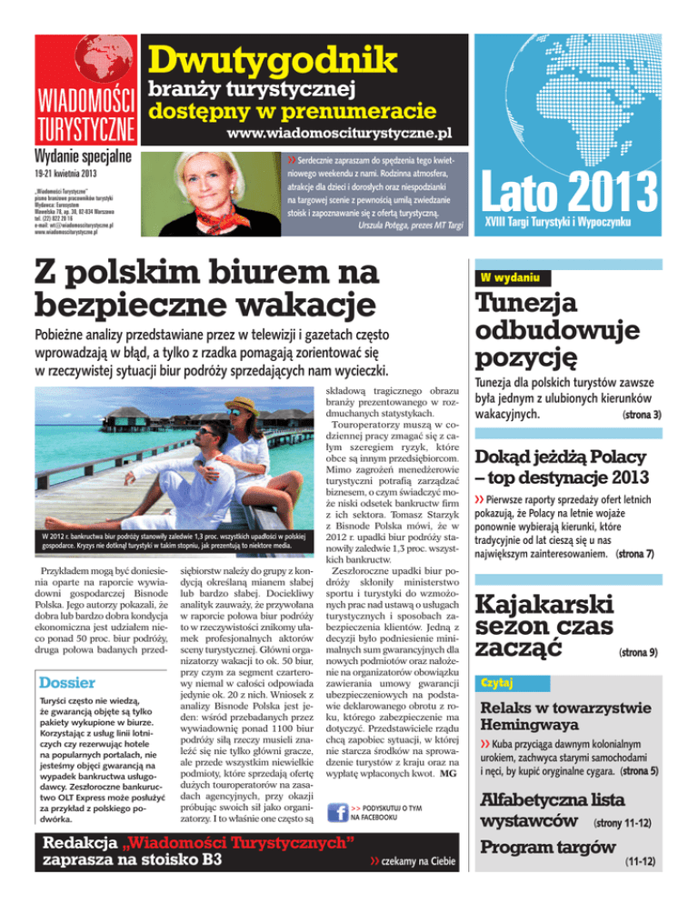 Dwutygodnik branży turystycznej dostępny w prenumeracie www.wiadomosciturystyczne.pl Wydanie specjalne Serdecznie zapraszam do spędzenia tego kwiet- 19-21 kwietnia 2013 niowego weekendu z nami. Rodzinna atmosfera, atrakcje dla dzieci i dorosłych oraz niespodzianki na targowej scenie z pewnością umilą zwiedzanie stoisk i zapoznawanie się z ofertą turystyczną. Urszula Potęga, prezes MT Targi „Wiadomości Turystyczne” pismo branżowe pracowników turystyki Wydawca: Eurosystem Wawelska 78, ap. 30, 02-034 Warszawa tel. (22) 822 20 16 e-mail: [email protected] www.wiadomosciturystyczne.pl Z polskim biurem na bezpieczne wakacje Pobieżne analizy przedstawiane przez w telewizji i gazetach często wprowadzają w błąd, a tylko z rzadka pomagają zorientować się w rzeczywistej sytuacji biur podróży sprzedających nam wycieczki. W 2012 r. bankructwa biur podróży stanowiły zaledwie 1,3 proc. wszystkich upadłości w polskiej gospodarce. Kryzys nie dotknął turystyki w takim stopniu, jak prezentują to niektore media. Przykładem mogą być doniesienia oparte na raporcie wywiadowni gospodarczej Bisnode Polska. Jego autorzy pokazali, że dobra lub bardzo dobra kondycja ekonomiczna jest udziałem nieco ponad 50 proc. biur podróży, druga połowa badanych przed- Dossier Turyści często nie wiedzą, że gwarancją objęte są tylko pakiety wykupione w biurze. Korzystając z usług linii lotniczych czy rezerwując hotele na popularnych portalach, nie jesteśmy objęci gwarancją na wypadek bankructwa usługodawcy. Zeszłoroczne bankuructwo OLT Express może posłużyć za przykład z polskiego podwórka. siębiorstw należy do grupy z kondycją określaną mianem słabej lub bardzo słabej. Dociekliwy analityk zauważy, że przywołana w raporcie połowa biur podróży to w rzeczywistości znikomy ułamek profesjonalnych aktorów sceny turystycznej. Główni organizatorzy wakacji to ok. 50 biur, przy czym za segment czarterowy niemal w całości odpowiada jedynie ok. 20 z nich. Wniosek z analizy Bisnode Polska jest jeden: wśród przebadanych przez wywiadownię ponad 1100 biur podróży siłą rzeczy musieli znaleźć się nie tylko główni gracze, ale przede wszystkim niewielkie podmioty, które sprzedają ofertę dużych touroperatorów na zasadach agencyjnych, przy okazji próbując swoich sił jako organizatorzy. I to właśnie one często są składową tragicznego obrazu branży prezentowanego w rozdmuchanych statystykach. Touroperatorzy muszą w codziennej pracy zmagać się z całym szeregiem ryzyk, które obce są innym przedsiębiorcom. Mimo zagrożeń menedżerowie turystyczni potrafią zarządzać biznesem, o czym świadczyć może niski odsetek bankructw firm z ich sektora. Tomasz Starzyk z Bisnode Polska mówi, że w 2012 r. upadki biur podróży stanowiły zaledwie 1,3 proc. wszystkich bankructw. Zeszłoroczne upadki biur podróży skłoniły ministerstwo sportu i turystyki do wzmożonych prac nad ustawą o usługach turystycznych i sposobach zabezpieczenia klientów. Jedną z decyzji było podniesienie minimalnych sum gwarancyjnych dla nowych podmiotów oraz nałożenie na organizatorów obowiązku zawierania umowy gwarancji ubezpieczeniowych na podstawie deklarowanego obrotu z roku, którego zabezpieczenie ma dotyczyć. Przedstawiciele rządu chcą zapobiec sytuacji, w której nie starcza środków na sprowadzenie turystów z kraju oraz na wypłatę wpłaconych kwot. MG >> PODYSKUTUJ O TYM NA FACEBOOKU Redakcja „Wiadomości Turystycznych” zaprasza na stoisko B3 czekamy na Ciebie Lato 2013 XVIII Targi Turystyki i Wypoczynku W wydaniu Tunezja odbudowuje pozycję Tunezja dla polskich turystów zawsze była jednym z ulubionych kierunków wakacyjnych. (strona 3) Dokąd jeżdżą Polacy – top destynacje 2013 Pierwsze raporty sprzedaży ofert letnich pokazują, że Polacy na letnie wojaże ponownie wybierają kierunki, które tradycyjnie od lat cieszą się u nas największym zainteresowaniem. (sstrona 7) Kajakarski sezon czas zacząć (sstrona 9) Czytaj Relaks w towarzystwie Hemingwaya Kuba przyciąga dawnym kolonialnym urokiem, zachwyca starymi samochodami i nęci, by kupić oryginalne cygara. (strona 5) Alfabetyczna lista wystawców (sstrony 11-12) Program targów (11-12) 2 promocja WYDANIE SPECJALNE Targi Lato 2013 WIADOMOŚCI TURYSTYCZNE www.miastko.pl Zapraszamy na Ziemię Miastecką O tym, że Miastko jest urokliwe, kolorowe i aktywne, można się przekonać przyjeżdżając do naszej gminy. Piesze rajdy turystyczne, marsze nordic walking, wyprawy rowerowe – to formy aktywności, które może gmina Miastko polecić każdemu turyście. Gmina Miastko leży w zachodniej części województwa pomorskiego, w powiecie bytowskim. Do Miastka i w jego okolice przyciąga turystę nieskazitelnie czysta przyroda, ponad 150 jezior, w tym największe w Europie jezioro lobeliowe o nazwie Bobięcińskie Wielkie (pow. 524,6 ha), a także lasy, latem pełne grzybów i jagód. Warto przemierzyć ścieżki przyrodnicze nad Studnicą, w tym „Zielony Ruczaj” oraz biegnące z Pasieki dwie ścieżki – „Kąpielisko Rummela” i „U źródeł Studnicy”. Mijając siedzibę Nadleśnictwa Miastko, znajdziemy się w „Krainie Rummela”, urokliwej okolicy pełnej ciekawostek przyrodniczych i turystycznych. Na początek proponujemy napić się krystalicznie czystej wody ze źródełka na Hamrze, posłuchać plusku wody z malutkiego wodospadu, potem odwiedzić okazały myśliwski wigwam, by w drodze powrotnej zadumać się przy leśnej kapliczce Świętego Huberta i na koniec zajrzeć do kryjówki zbója Rummela, czyli pomorskiego Janosika. Z kolei akweny wodne gminy Miastko doskonale nadają się do połowu taaaakich ryb, uprawiania sportów wodnych, w tym żeglarstwa, a pływanie w nich to sama radość. Stolicą miasteckich sportów wodnych jest Bobięcino, gdzie w szkole żeglarstwa zdobywają patenty przyszłe wilki jeziorowo-morskie. W gminie Miastko mamy też Alpy, c