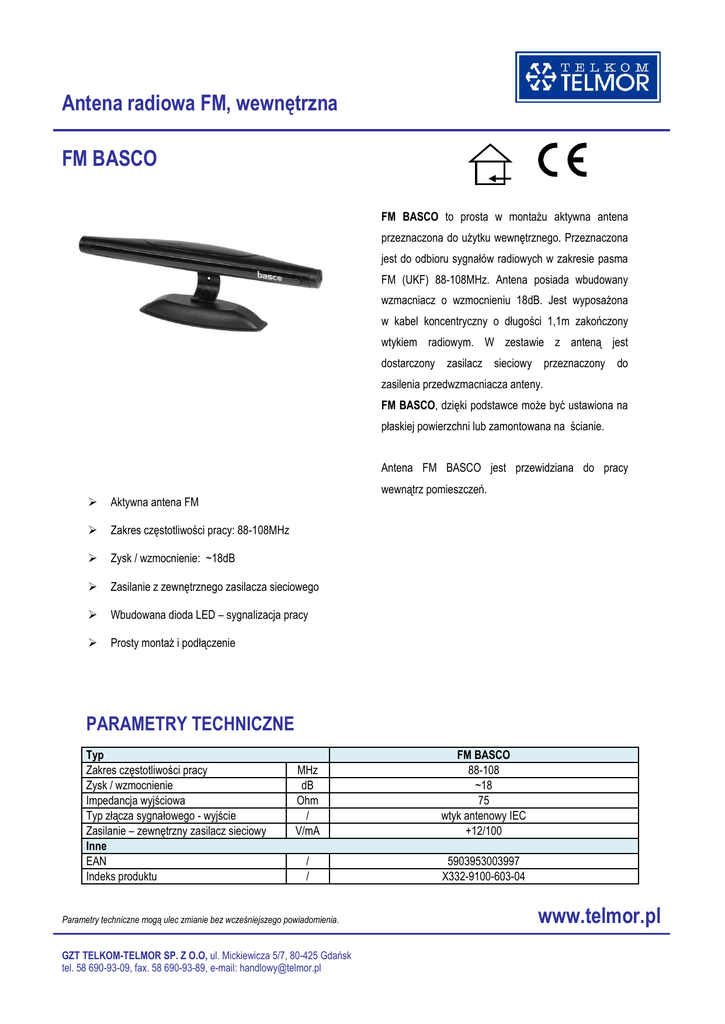 www.telmor.pl Antena radiowa FM, wewnętrzna FM BASCO