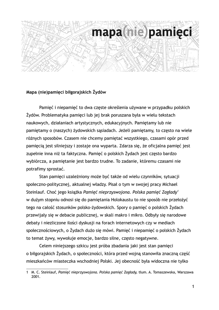 Mapa (nie)pamięci biłgorajskich Żydów Pamięć i niepamięć to dwa częste określenia używane w przypadku polskich Żydów. Problematyka pamięci lub jej brak poruszana była w wielu tekstach naukowych, działaniach artystycznych, edukacyjnych. Pamiętamy lub nie pamiętamy o (naszych) żydowskich sąsiadach. Jeżeli pamiętamy, to często na wiele różnych sposobów. Czasem nie chcemy pamiętać wszystkiego, czasami opór przed pamięcią jest silniejszy i zostaje ona wyparta. Zdarza się, że oficjalna pamięć jest zupełnie inna niż ta faktyczna. Pamięć o polskich Żydach jest często bardzo wybiórcza, a pamiętanie jest bardzo trudne. To zadanie, któremu czasami nie potrafimy sprostać. Stan pamięci uzależniony może być także od wielu czynników, sytuacji społeczno-politycznej, aktualnej władzy. Pisał o tym w swojej pracy Michael Steinlauf. Choć jego książka Pamięć nieprzyswojona. Polska pamięć Zagłady1 w dużym stopniu odnosi się do pamiętania Holokaustu to nie sposób nie przełożyć tego na całość stosunków polsko-żydowskich. Spory o pamięć o polskich Żydach przewijały się w debacie publicznej, w skali makro i mikro. Odbyły się narodowe debaty i niezliczone ilości dyskusji na forach internetowych czy w mediach społecznościowych, o Żydach dużo się mówi. Pamięć i niepamięć o polskich Żydach to temat żywy, wywołuje emocje, bardzo silne, często negatywne. Celem niniejszego szkicu jest próba zbadania jaki jest stan pamięci o biłgorajskich Żydach, o społeczności, która przed wojną stanowiła znaczną część mieszkańców miasteczka wschodniej Polski. Jej obecność była widoczna nie tylko 1 M. C. Steinlauf, Pamięć nieprzyswojona. Polska pamięć Zagłady, tłum. A. Tomaszewska, Warszawa 2001. 1 z perspektywy liczb. Biłgorajscy Żydzi, jak w wielu innych miejscach w Polsce, współtworzyli życie społeczne, polityczne i kulturalne. Nie podejmuję się rekonstrukcji historycznej losu biłgorajskiej społeczności żydowskiej, chciałabym podjąć próbę przedstawienia aktualnego [częściowego] 2 stanu pamięci o Żydach mieszkających w Biłgoraju. W celu realizacji postawionego przed sobą zadania sięgnę do materiałów zastanych takich jak publikacje naukowe i publicystyczne, zebrane wspomnienia o Biłgoraju, a także literaturę. Jestem świadoma, że nie dotrę do każdej pracy czy każdej relacji poruszającej omawiany wątek, postaram się jednak jak najszerzej zrealizować postawione sobie zadanie wiedząc jednak, że będzie to otwarcie do dalszej pracy i badań w tym obszarze. Główną bohaterką niniejszej pracy będzie, jedna z dwóch powstałych po wojnie, biłgorajskich Ksiąg Pamięci3. To ona stanie się bazą tekstu o pamięci zastanej o biłgorajskiej społeczności żydowskiej, utrwalonej na kartkach papieru. Wokół niej pojawią się inne źródła jednak chciałabym, aby głównym omawianym tekstem były właśnie wspomnienia zapisane w księdze pamięci. Dodatkowo sięgnę do prac wspomnieniowych, tutaj głos oddam w dużej mierze polskim sąsiadom biłgorajskich Żydów. Podejmując ten temat nie sposób pominąć także wątku Isaaca Bashevisa Singera, żydowskiego pisarza nagrodzonego literackim Noblem, którego dziadek wpisał się w historię miasta. Pamięć Za Słownikiem języka polskiego4 pamięć rozumiemy jako zdolność umysłu do przyswajania, przechowywania i odtwarzania doznanych wrażeń, przeżyć, wiadomości5. Ten sam słownik definiuje pamięć także jako wspomnienie, upamiętnienie kogoś lub czegoś6. To oczywiście nie jedyne propozycje rozumienia tego pojęcia, a w odniesieniu do omawianego tematu nie możemy pamięci zawęzić jedynie do zaproponowanych powyżej definicji. Pamięć, tak często kojarzona ze sferą intymną, osobistą, została 2 Nie podejmuję się próby zbadania stanu pamięci na temat biłgorajskich Żydów we wszystkich dostępnych materiałach pisanych oraz we wszystkich jej aspektach. Ze względu na rozmiar pracy ograniczam się do wybranych aspektów tego zagadnienia. 3 M. Adamczyk-Garbowska, A. Trzciński (red.), Zagłada Biłgoraja. Księga pamięci, tłum. M. Adamczyk-Garbowska, A, Trzciński, M. Zawanowska, Gdańsk 2009. 4 Słownik języka polskiego PWN w wersji online dostępny pod adresem http://sjp.pwn.pl/, dostęp: sierpień 2015. 5 Słownik języka polskiego PWN, definicja dostępna w wersji elektronicznej pod adresem http://sjp.pwn.pl/szukaj/pami%C4%99%C4%87-.html, dostęp: sierpień 2015. 6 Tamże. 2 zagospodarowana przez dyskurs naukowy, a także publicystyczny i polityczny. To jak pamiętać lub nie pamiętać uczy się kolejne pokolenia w szkołach, na uczelniach, poprzez środki masowego przekazu, w kościele i domu. Pamięć, wraz z jej wszystkimi odmianami, przewija się w procesie tworzenia/pisania historii7. I choć, jak pisze socjolożka Anna Wylęgała w pracy badającej pamięć społeczną, różnice pomiędzy tymi dwoma pojęciami są dość istotne i oczywiste8 to także zauważalne są związki pomiędzy nimi. W szczególności w sytuacji kiedy chcemy opis historyczny stworzyć nie tylko w oparciu o oficjalne dokumenty zdeponowane w archiwach, ale i sięgnąć do wspomnień zwykłych ludzi, świadków wydarzeń9. Omawiając problem pamięci ważny staje się także aspekt jej utrwalenia. Pamięć zapisana sprawia, że jesteśmy bardziej bezpieczni o jej przetrwanie. To jedna z głównych powinności twórców omawianej w dalszej części pracy biłgorajskiej Księgi pamięci. Wspomnienia przelane na papier mogą być także wspomnieniami tych, którzy o nich przeczytają i je zapamiętają. W kontekście pamięci o polskich Żydach zagadnienie to wydaje się szczególnie ważne. Do dziś dyskutujemy o tym co pamiętamy, a co zostało zapomniane. To też jedno z zadań postawionych przeze mnie w niniejszym tekście. Sprawdzić jak wygląda mapa pamięci lub niepamięci o biłgorajskich Żydach w oparciu o to co zos
