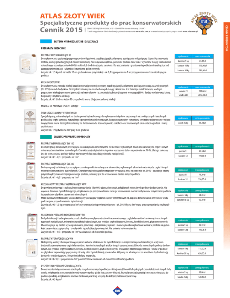 ATLAS ZŁOTY WIEK Cennik 2015 CENNIK PRODUKTÓW Specjalistyczne produkty do prac konserwatorskich CENNIK OBOWIĄZUJE OD 01.06.2015 * (CENY NETTO - do ceny dolicza się 23% VAT) * Jeżeli ceny podane w Ofercie Handlowej są różne od cen na stronie www.atlas.com.pl to cenami obowiązującymi są ceny na stronie www.atlas.com.pl SYSTEMY HYDROIZOLACYJNE I OSUSZAJĄCE PREPARATY INIEKCYJNE PREPARAT KRZEMIONKUJĄCY KS Do wykonywania poziomej przepony przeciwwilgociowej zapobiegającej kapilarnemu podciąganiu wilgoci przez ściany. Do stosowania metodą iniekcji grawitacyjnej lub niskociśnieniowej. Zalecany na nasiąkliwe, porowate podłoża mineralne, wykonane z cegły lub kamienia naturalnego, o zawilgoceniu do 80 % i niskim lub średnim stopniu zasolenia. Do uszczelniania i gruntowania podłoży mineralnych przed zastosowaniem izolacji - szlamów i bitumiczno-polimerowych. Zużycie: ok. 1,5 kg/mb na każde 10 cm grubości muru przy iniekcji i ok. 0,1 kg preparatu na 1 m2 przy gruntowaniu krzemionkującym podłoża KREM INIEKCYJNY KI Do wykonywania metodą iniekcji bezciśnieniowej poziomej przepony zapobiegającej kapilarnemu podciąganiu wody, w zawilgoconych (do 95%) murach budynków. Szczególnie zalecany do murów licowych z cegły i kamienia. Jest bezrozpuszczalnikowym, wodnym preparatem iniekcyjnym nowej generacji, na bazie silanów i o zawartości substancji czynnej wynoszącej 80%. Bardzo wydajny oraz łatwy, bezpieczny i szybki w aplikacji. Zużycie: ok. 0,1 l/mb na każde 10 cm grubości muru, dla jednorzędowej iniekcji opakowanie cena opakowania kanister 5 kg 65,00 zł kanister 10 kg 110,00 zł kanister 30 kg 280,00 zł opakowanie cena opakowania wiadro 2 l 298,00 zł wiadro 20 l 2856,00 zł opakowanie cena opakowania worek 25 kg 56,10 zł opakowanie cena opakowania MINERALNE ZAPRAWY USZCZELNIAJĄCE TYNK USZCZELNIAJĄCY HYDROTYNK U Specjalistyczny, mineralny tynk na bazie spoiwa hydraulicznego do wykonywania tynków zaporowych na zawilgoconych i zasolonych podłożach z cegły, kamienia naturalnego i powierzchniach betonowych. Paroprzepuszczalny - umożliwia swobodne odparowanie wilgoci i wysychanie muru. Szczególnie zalecany na fundamentach, ścianach piwnic, cokołach oraz murowanych elementach ogrodzeń i małej architektury. Zużycie: ok. 17 kg tynku na 1m2 przy 1 cm grubości GRUNTY, PREPARATY, IMPREGNATY PREPARAT WZMACNIAJĄCY SW 100 Do impregnacji osłabionych przez upływ czasu i czynniki atmosferyczne elementów, wykonanych z kamieni naturalnych, cegieł i innych mineralnych materiałów budowlanych. Charakteryzuje się średnim stopniem wytrącania żelu - na poziomie ok. 10 %, dlatego zalecany jest do wzmacniania podłoży dobrze zachowanych lub posiadających niską nasiąkliwość. Zużycie: ok. 0,1 - 0,3 l preparatu na 1 m2 puszka 1 l 47,50 zł kanister 5 l 198,00 zł PREPARAT WZMACNIAJĄCY SW 300 Do impregnacji osłabionych przez upływ czasu i czynniki atmosferyczne elementów, wykonanych z kamieni naturalnych, cegieł i innych mineralnych materiałów budowlanych. Charakteryzuje się wysokim stopniem wytrącania żelu, na poziomie ok. 30 % - powoduje istotny przyrost wytrzymałości impregnowanego podłoża, zalecany jest do wzmacniania bardzo słabych podłoży. Zużycie: ok. 0,1 - 0,3 l preparatu na 1 m2 opakowanie cena opakowania puszka 1 l 79,20 zł kanister 5 l 330,00 zł KRZEMIANOWY PREPARAT WZMACNIAJĄCY KPW Do powierzchniowego i strukturalnego wzmacniania (do 60%) zdegradowanych, osłabionych mineralnych podłoży budowlanych. Nie wywiera działania hydrofobizującego, dzięki czemu po przeprowadzeniu zabiegu wzmacniania można kontynuować oczyszczanie podłoża i uzupełnianie ubytków zaprawami mineralnymi. Może być również stosowany jako dodatek przyspieszający wiązanie zapraw cementowych np. zapraw do tamowania przecieków wody podczas prac przy odtwarzaniu hydroizolacji. Zużycie: ok. 0,5-1,0 kg preparatu na 1m2 przy wzmacnianiu powierzchniowym i ok. 30-50 kg na 1m3 muru przy wzmacnianiu strukturalnym opakowanie cena opakowania kanister 5 kg 54,20 zł kanister 10 kg 95,30 zł opakowanie cena opakowania SILIKONOWY PREPARAT HYDROFOBIZUJĄCY SH Do hydrofobizacji i zabezpieczania przed szkodliwym wpływem środowiska zewnętrznego, cegły i elementów kamiennych oraz innych typowych nasiąkliwych, mineralnych podłoży budowlanych, np. tynków, cegły silikatowej, betonu, kostki brukowej, płyt cementowych. Charakteryzuje się bardzo wysoką zdolnością penetracji - dzięki niskiej lepkości i małocząsteczkowej budowie wnika w podłoże na głębokość zapewniającą optymalny i trwały efekt hydrofobizacji powierzchni. Nie zmienia koloru materiału. Zużycie: ok. 0,1 - 0,3 l preparatu na 1 m2 w zależności od chłonności podłoża PREPARAT HYDROFOBIZUJĄCY WH Ekologiczny, wodny i bezzapachowy preparat na bazie siloksanów do hydrofobizacji i zabezpieczania przed szkodliwym wpływem środowiska zewnętrznego, cegły i elementów z kamieni naturalnych a także innych typowych nasiąkliwych, mineralnych podłoży budowlanych, np. tynków, cegły silikatowej, betonu, kostki brukowej, płyt cementowych. O wysokiej zdolnością penetracji - wnika w podłoże na głębokość zapewniającą optymalny i trwały efekt hydrofobizacji powierzchni. Odporny na alkalia przez co umożliwia hydrofobizację świeżych tynków i zapraw. Nie zmienia koloru materiału. Zużycie: ok. 0,2-0,3 l preparatu na 1m2 powierzchni w zależności od chłonności i struktury podłoża DYSPERSYJNY PREPARAT GRUNTUJĄCY DPG Do wzmocnienia i gruntowania stabilnych, starych mineralnych podłoży o niskiej nasiąkliwości lub pokrytych pozostałościami starych farb, w celu zwiększenia przyczepności nowej warstwy tynku, gładzi lub zaprawy klejącej. Pozwala uzyskać szorstką i mocno przylegającą do podłoża powłokę, dzięki czemu stanowi doskonałą warstwę sczepną dla kolejnej nakładanej warstwy. Zużycie: ok. 0,3 kg/m2 puszka 1 kg 26,10 zł kanister 5 kg 108,7