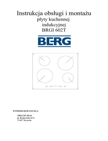 Instrukcja obsługi i montażu płyty kuchennej indukcyjnej BRGI 602T WYPRODUKOWANO DLA: TRES SP. ZO.O. ul. Krakowska 61 b 71-017 Szczecin SZANOWNI PAŃSTWO Serdecznie gratulujemy Państwu dokonania trafnego wyboru. Nasze urządzenia projektowane i wykonywane są z myślą o spełnieniu Państwa oczekiwań i z pewnością będą stanowić część nowocześnie wyposażonego gospodarstwa domowego. Jesteśmy przekonani, że nowoczesne, funkcjonalne i praktyczne urządzenia, wyprodukowane z najwyższej jakości materiałów, spełnią wszystkie Państwa wymagania. Przed przystąpieniem do montażu i użytkowania zakupionej płyty kuchennej prosimy o dokładne zapoznanie się z treścią niniejszej instrukcji, a także zawartych w niej reguł bezpieczeństwa użytkowania. Życzymy satysfakcji i zadowolenia z wyboru produktu naszej firmy. 2 1. BEZPIECZEŃSTWO 1.1 Bezpieczeństwo elektryczne 1. Upewnij się, że urządzenie jest właściwie zainstalowane i uziemione przez wykwalifikowanego technika. 2. Urządzenie powinno być serwisowane wyłącznie przez wykwalifikowany personel serwisu. 3. Naprawy wykonywane przez niewykwalifikowane osoby mogą spowodować zranienie lub poważne nieprawidłowości działania. Jeżeli Państwa urządzenie wymaga naprawy, proszę skontaktować się z lokalnym centrum serwisowym lub sprzedawcą. Nieprzestrzeganie tych instrukcji może spowodować uszkodzenie sprzętu i utratę gwarancji. 4. W przypadku nieprawidłowego działania, pęknięć, szczelin odprysków: - wyłącz wszystkie strefy grzewcze; - odłącz zasilanie płyty kuchennej i skontaktuj się z lokalnym centrum serwisowym. 5. Jeżeli płyta popęka, wyłącz urządzenie, aby uniknąć możliwości porażenia elektrycznego. 6. Nie używaj płyty kuchennej przed wymianą powierzchni szklanej. 7. Urządzenie, nie jest przeznaczone do uruchamiania za pomocą zewnętrznego regulatora czasowego ani oddzielnego zdalnego układu sterowania. 8. Urządzenie, odłączające sprzęt powinno być wbudowane w instalację stałą zgodnie z przepisami dotyczącymi takiej instalacji. 9. W przypadku zaniku napięcia w sieci skasowane zostają wszystkie nastawy. Po ponownym pojawieniu się napięcia w sieci wskazana jest ostrożność. Dopóki pola grzejne są gorące będzie wyświetlany wskaźnik nagrzania szczątkowego „H” oraz jak przy pierwszym włączeniu klucz blokady. 3 1.2 Bezpieczeństwo użytkowania 1. Niniejsze urządzenie jest przeznaczone do używania wyłącznie do zwykłego gotowania i smażenia w gospodarstwie domowym. Nie jest przeznaczone do zastosowań komercyjnych lub przemysłowych. 2. Zachowaj ostrożność podczas podłączania urządzeń elektrycznych w pobliżu płyty kuchennej. Przewody zasilania nie mogą stykać się powierzchnią płyty grzewczej. 3. Rozgrzany tłuszcz i olej łatwo się zapalają. Nigdy nie pozostawiaj płyty bez nadzoru podczas przygotowywania potraw na tłuszczu lub oleju, na przykład podczas smażenia frytek. 4. Po użyciu wyłączaj strefy grzewcze. 5. Panel sterowania zawsze utrzymuj w czystości. 6. Nigdy nie pozostawiaj palnych substancji w pobliżu płyty kuchennej, może dojść do zapłonu. 7. Osoby z wszczepionymi urządzeniami wspomagającymi funkcje życiowe (np.rozrusznik serca, pompka insulinowa lub aparat słuchowy) muszą upewnić się, że praca tych urządzeń nie zostanie zakłócona poprzez płytę indukcyjną (obszar częstotliwości działania płyty indukcyjnej wynosi 20-50 kHz). OSTRZEŻENIE: Niebezpieczeństwo pożaru: 1. Nie składować przedmiotów na powierzchniach kuchennych. 2. Nigdy nie należy próbować gaszenia ognia wodą, ale wyłączyć urządzenie i potem nakryć ogień np. pokrywką lub kocem strażackim. 1.3 Bezpieczeństwo podczas czyszczenia 1. Zawsze wyłączaj urządzenie przed czyszczeniem. 2. Dla celów bezpieczeństwa nie czyść płyty kuchennej za pomocą urządzeń wytwarzających parę lub wysokociśnieniowych. 3. Czyść płytę kuchenną zgodnie z instrukcjami czyszczenia i utrzymywania zawartych w niniejszej instrukcji obsługi. 4 1.4 Bezpieczeństwo dzieci 1. Urządzenie to nie jest przeznaczone do użytku przez małe dzieci ani osoby w bardzo podeszłym wieku bez dozoru. Trzeba uważać na małe dzieci, aby nie bawiły się kuchenką. 2. Niniejszy sprzęt nie jest przeznaczony do użytkowania przez osoby (w tym dzieci) o ograniczonej zdolności fizycznej, czuciowej lub psychicznej, a także osoby nie mające doświadczenia, lub znajomości sprzętu, chyba, że odbywa się to pod nadzorem lub zgodnie z instrukcją użytkowania sprzętu, przekazanej przez osoby odpowiadające za ich bezpieczeństwo. Należy zwracać uwagę na dzieci, aby nie bawiły się sprzętem. OSTRZEŻENIE: Urządzenie i jego części dostępne stają się gorące podczas użytkowania. Należy zachować ostrożność, by uniknąć dotknięcia elementów grzejnych. Dzieci młodsze od 8-letnich winny być trzymane z dala, o ile nie mają ciągłego nadzoru. 3. Urządzenie może być użytkowane przez dzieci w wieku 8 lat i więcej oraz osoby z ograniczonymi zdolnościami fizycznymi, czuciowymi lub umysłowymi, albo nie mające doświadczenia i wiedzy, jeśli zastosowano nad nimi nadzór lub udzielono im instrukcji dotyczących użytkowania urządzenia w sposób bezpieczny i zrozumienia związanych z nim niebezpieczeństw. Dzieci nie powinny bawić się tym urządzeniem. Czyszczenie i konserwacja przez użytkownika nie powinny być wykonywane przez dzieci bez nadzoru. 1.5 Utylizacja 1. Posegregować materiały opakowaniowe do odzysku i wyrzucić je w miejscu komunalnego odbioru śmieci. 2. Przed usunięciem urządzenia przyłączonego do zasilania elektrycznego na stałe (bez wtyczki) koncesjonowany elektryk musi je odłączyć od zasilania. 3. Przed złomowaniem należy urządzenie trwale unieruchomić. Odciąć od urządzenia przewód zasilania elektrycznego (po odłączeniu od zasilania), a także wszystkie luźne przewody przyłączeniow