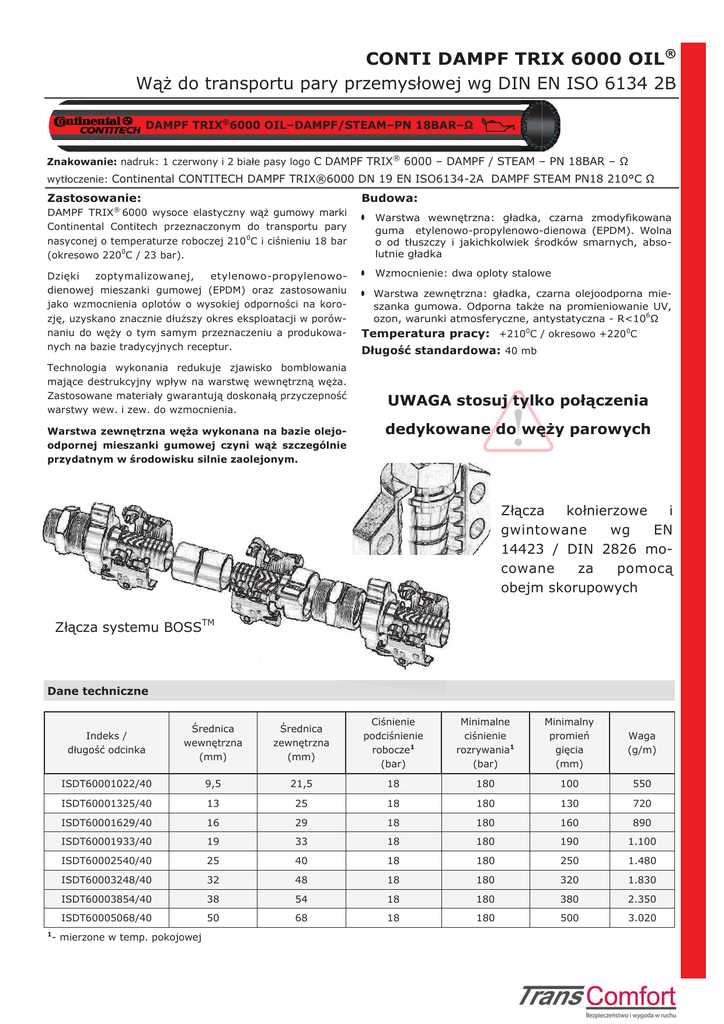 CONTI DAMPF TRIX 6000 OIL® Wąż do transportu pary przemysłowej wg DIN EN ISO 6134 2B DAMPF TRIX®6000 OIL–DAMPF/STEAM–PN 18BAR–Ω Znakowanie: nadruk: 1 czerwony i 2 białe pasy logo C DAMPF TRIX® 6000 – DAMPF / STEAM – PN 18BAR – Ω wytłoczenie: Continental CONTITECH DAMPF TRIX®6000 DN 19 EN ISO6134-2A DAMPF STEAM PN18 210°C Ω Zastosowanie: Budowa: DAMPF TRIX® 6000 wysoce elastyczny wąż gumowy marki Continental Contitech przeznaczonym do transportu pary nasyconej o temperaturze roboczej 210 0C i ciśnieniu 18 bar (okresowo 2200C / 23 bar). etylenowo-propylenowoDzięki zoptymalizowanej, dienowej mieszanki gumowej (EPDM) oraz zastosowaniu jako wzmocnienia oplotów o wysokiej odporności na korozję, uzyskano znacznie dłuższy okres eksploatacji w porównaniu do węży o tym samym przeznaczeniu a produkowanych na bazie tradycyjnych receptur. Technologia wykonania redukuje zjawisko bomblowania mające destrukcyjny wpływ na warstwę wewnętrzną węża. Zastosowane materiały gwarantują doskonałą przyczepność warstwy wew. i zew. do wzmocnienia. Warstwa zewnętrzna węża wykonana na bazie olejoodpornej mieszanki gumowej czyni wąż szczególnie przydatnym w środowisku silnie zaolejonym. Warstwa wewnętrzna: gładka, czarna zmodyfikowana guma etylenowo-propylenowo-dienowa (EPDM). Wolna o od tłuszczy i jakichkolwiek środków smarnych, absolutnie gładka Wzmocnienie: dwa oploty stalowe Warstwa zewnętrzna: gładka, czarna olejoodporna mieszanka gumowa. Odporna także na promieniowanie UV, ozon, warunki atmosferyczne, antystatyczna - R<106Ω Temperatura pracy: +2100C / okresowo +2200C Długość standardowa: 40 mb UWAGA stosuj tylko połączenia dedykowane do węży parowych Złącza kołnierzowe i gwintowane wg EN 14423 / DIN 2826 mocowane za pomocą obejm skorupowych Złącza systemu BOSSTM Dane techniczne 1 Indeks / długość odcinka Średnica wewnętrzna (mm) Średnica zewnętrzna (mm) Ciśnienie podciśnienie robocze1 (bar) Minimalne ciśnienie rozrywania1 (bar) Minimalny promień gięcia (mm) Waga (g/m) ISDT60001022/40 9,5 21,5 18 180 100 550 ISDT60001325/40 13 25 18 180 130 720 ISDT60001629/40 16 29 18 180 160 890 ISDT60001933/40 19 33 18 180 190 1.100 ISDT60002540/40 25 40 18 180 250 1.480 ISDT60003248/40 32 48 18 180 320 1.830 ISDT60003854/40 38 54 18 180 380 2.350 ISDT60005068/40 50 68 18 180 500 3.020 - mierzone w temp. pokojowej