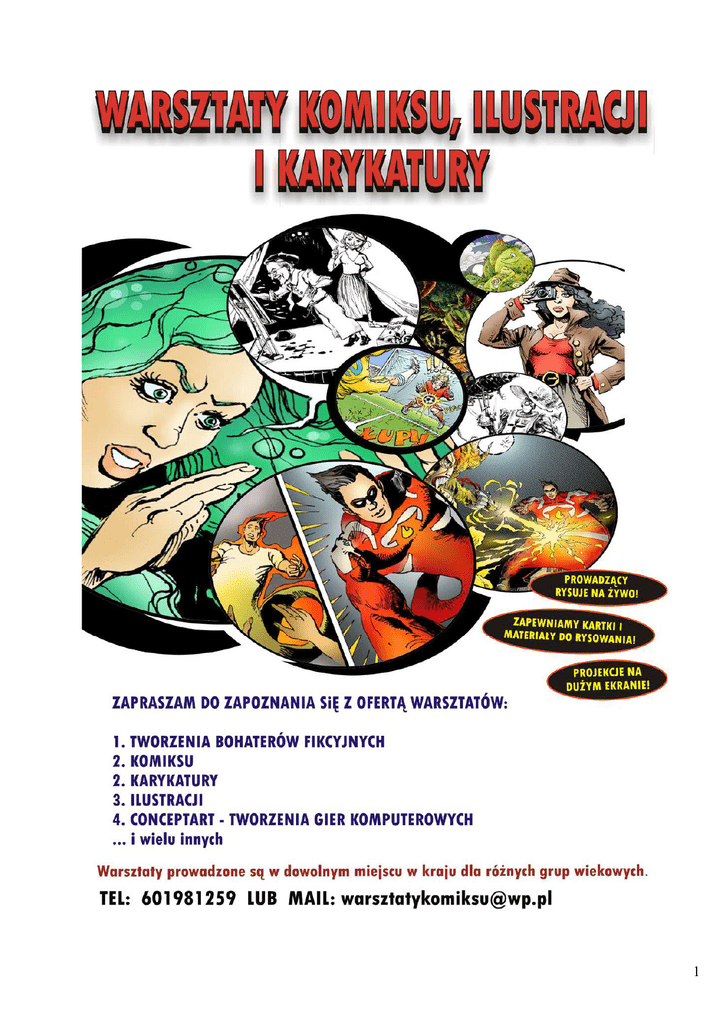 1 Warsztaty karykatury. Niemal 50 uczestników w różnym wieku rysowało siebie nawzajem w parach. ( Szkoła Artystyczna w Ełku, 2013 ) Witam serdecznie! Wśród zróżnicowanej działalności artystycznej i edukacyjnej, bardzo ważna jest dla mnie praca rysownika oraz kontakt z dziećmi i młodzieżą. Prowadzę warsztaty, prelekcje, wystawy oraz kursy rysunku w zakresie dziedzin, którymi się zajmuję. Wieloletnie doświadczenie pozwala mi przekazać wiele wiedzy dotyczącej zawodu ilustratora i rysownika komiksów, który pracuje dziś częściej na potrzeby teatru, filmu, prasy i reklamy niż literatury ilustrowanej, projektuje gry komputerowe. Jestem także karykaturzystą i rocznie portretuję setki osób. Prowadzę zajęcia dla dorosłych w Ośrodku Postaw Twórczych we Wrocławiu i na Uniwersytecie Zielonogórskim. Zapraszam do współpracy przy organizacji prowadzonych przeze mnie warsztatów, które prowadzę na terenie całego kraju. Szymon Teluk 2 Plakat promujący dwudniowy warsztat komiksu i kreacji bohatera fikcyjnego. 3 Warsztaty komiksu. Uczestnicy rysują własny komiks. ( Miejski Ośrodek Kultury w Głogowie, 2012 ) CELE WARSZTATÓW: Ich celem jest zapoznanie uczestników z szeroko pojętym zakresem plastyki, literatury i sztuki, poszerzenie zainteresowań kulturalnych. Korzystając z pasji każdego młodego człowieka pomagamy je rozwinąć i zadbać o ich jakość. Poruszając się w części teoretycznej w świecie bohaterów i światów bliskich uczestnikom, warsztaty cieszą się dużym zainteresowaniem dzieci i młodzieży, którzy czytając lub kreując własne fikcyjne światy spędzają wolny czas. Wykorzystując jako punkt wyjścia ich ulubioną rozrywkę warsztaty uczą rozumienia i doświadczania przejawów coraz bardziej wartościowych dziedzin kultury. Realizujemy to przez tematy z pogranicza kultury masowej i wysokiej. Warsztaty obejmują zakresem tematycznym i łączą: ilustrację, literaturę, komiks, film animowany, sztuki wizualne i kino. Swobodnie czerpiąc z dorobku powyższych dziedzin pomagają rozwinąć wyobraźnię, kreatywność oraz uczestnictwo w kulturze. Uczestnicy zyskują narzędzia do stworzenia własnych komiksów, książek, ilustracji, filmów, a także możliwość pełniejszego i bardziej świadomego wyboru swych zainteresowań. Warsztaty nauczą praktycznych umiejętności: Kreować własnych fikcyjnych bohaterów. Adaptować na różne dziedziny twórczości własne opowieści, doświadczenia i pomysły. Stworzyć własny komiks lub rysunek satyryczny. Ilustrować prasę, opowieści i książki. Konstruować narracje, scenariusze i fabuły. Wymyślać i budować scenerie i scenografie światów fikcyjnych (w tym gier komputerowych). Projektować wnętrza i budynki. Tworzyć gry komputerowe od strony koncepcyjnej aż po wizualną. Opanować postawy rysunku. Rysować karykatury i rysunki satyryczne. Wykorzystywać i rozwijać fachowe techniki plastyczne używane przez zawodowych twórców. 4 Zabawa integracyjna. Każdy z uczestników dorysowuje w ciągu 30 sek. fragment wspólnie tworzonego bohatera fikcyjnego. ( Galeria BWA Jelenia Góra, 2012 ) PRZEBIEG WARSZTATÓW: Każdy temat trwa 2,5 -3,5 godziny. Można je dowolnie łączyć i rozwijać w zależności od zapotrzebowania uczestników. I tak np: 3 dniowy warsztat CONCEPT-ART. może składać się z 6 powiązanych chronologicznie tematów, podczas których będziemy wymyślać i rysować różne elementy świata gry. Warsztat KREACJI BOHATERA FIKCYJNEGO może mieć kontynuację w postaci warsztatu KOMIKSU. Program ustalamy przed każdym warsztatem. 1. Część teoretyczna - wykład i bogata prezentacja multimedialna; 2. Część integracyjna - wspólne oglądanie komiksów, ilustracji i materiałów edukacyjnych, rysowanie na żywo przez prowadzącego, wspólne omawianie pomysłów, zabawy i ćwiczenia integrujące grupę (wspólne rysowanie jednego rysunku na dużym formacie, wspólne tworzenie scenariusza, świata przedstawionego itp); 3. Praktyczne wykonanie ćwiczeń przez uczestników; konsultacje indywidualne, omówienie praktycznego zastosowania zdobytych umiejętności w późniejszym zawodzie. Prezentacja prac w formie wystawy lub własnego wydawnictwa; W wersji dla dorosłych i młodzieży mogą być prowadzone pod kątem przygotowania zawodowego w zakresie reklamy, produkcji gier komputerowych, ilustracji, wizualizacji, scenografii, produkcji TV oraz filmowych. Zajęcia są prowadzone z uwzględnieniem aktywnego współtworzenia ich programu przez uczestników. Omawiamy przykłady z komiksu, literatury czy filmu, które są im znane i które sami proponują. 5 Uczestnicy przygotowują okładki książek i komiksów. (Miejski Ośrodek Kultury w Głogowie, 2012) TEMATY WARSZTATÓW: 1. Jak stworzyć bohatera fikcyjnego. Bohatera komiksu, animacji, filmu, książki. (Ponadto kreacja anty-bohatera, bohatera zbiorowego, bohaterów drugoplanowych itp.) 2. Jak stworzyć krótki komiks, pasek komiksowy lub rysunek satyryczny. 3. Nauka karykatury (uczestnicy rysują siebie nawzajem) oraz stylizacji satyrycznej w rysunku. 4. Concept art. czyli kreacja gier komputerowych. Jak wymyślać i fachowo narysować postacie, tła i rekwizyty, które potem staną się częścią gry komputerowej. 5. Jak narysować wszystko? Podstawy rysunku komiksowego i wykorzystywanego w animacji. Jak rysować Supermana i dlaczego ma mniejszą głowę od Myszki Miki. Uczymy się specjalnych technik rysunku dla ilustratorów i rysowników komiksu. 6. Kreacja świata przedstawionego, miejsc akcji (budujemy planetę, mapę, świat fantasy, sf, wnętrza, budynki itp.) wspólnie, na wielkiej planszy i indywidualnie. Budujemy historię naszego świata. 7. Kreacja designu pojazdów, statków kosmicznych, broni i rekwizytów. 8. Jak wykreować fascynującą okładkę komiksu lub książki, nazwę i logotyp. 9. Jak stworzyć bestiariusz. Potwory, smoki, gryfy i inne stworzenia fantastyczne znane min z mito