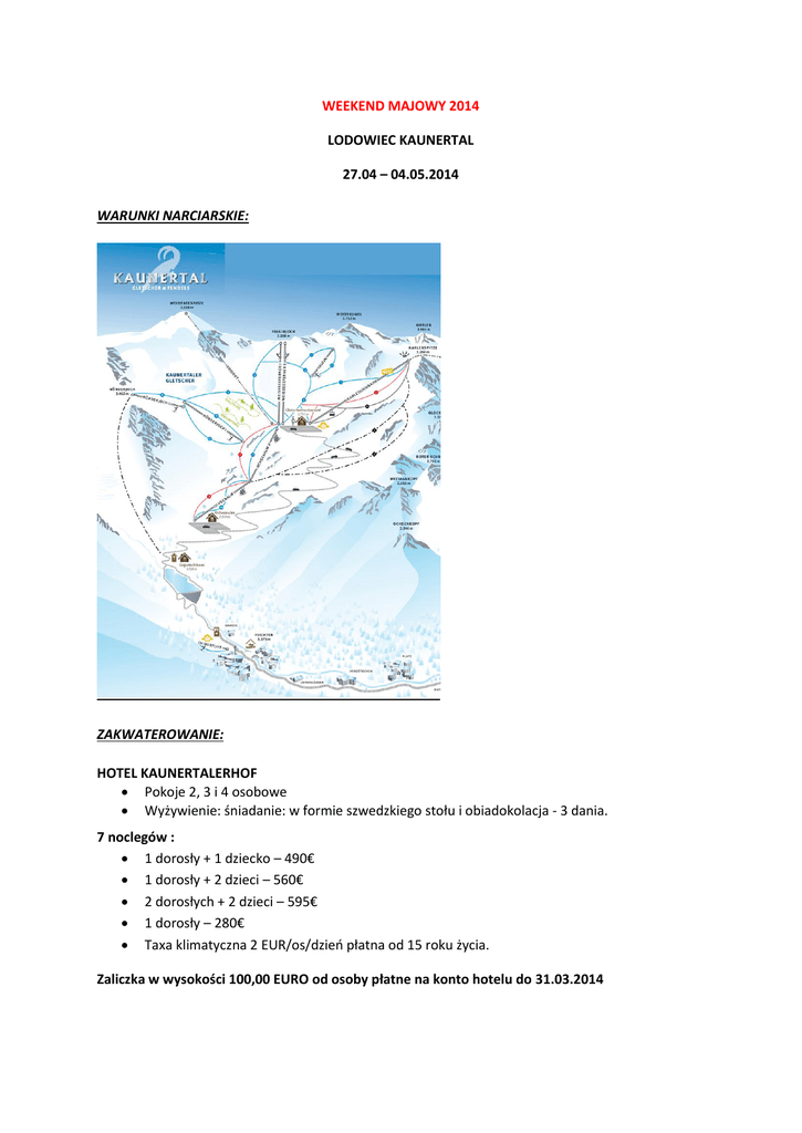 WEEKEND MAJOWY 2014 LODOWIEC KAUNERTAL 27.04 – 04.05.2014 WARUNKI NARCIARSKIE: ZAKWATEROWANIE: HOTEL KAUNERTALERHOF Pokoje 2, 3 i 4 osobowe Wyżywienie: śniadanie: w formie szwedzkiego stołu i obiadokolacja - 3 dania. 7 noclegów : 1 dorosły + 1 dziecko – 490€ 1 dorosły + 2 dzieci – 560€ 2 dorosłych + 2 dzieci – 595€ 1 dorosły – 280€ Taxa klimatyczna 2 EUR/os/dzień płatna od 15 roku życia. Zaliczka w wysokości 100,00 EURO od osoby płatne na konto hotelu do 31.03.2014 TRANSPORT: Dojazd własny. Możliwy dojazd zorganizowany (autokarem lub busem). Ta forma transportu dojdzie do skutku przy odpowiedniej frekwencji. Zgłoszenia wstępne wraz ze zgłoszeniem na wyjazd! KARNET: Karnet sezonowy na cały Tirol; Karnet na lodowiec Kaunertal: KARNET 6 dniowy DOROSŁY € 162,00 DZIECKO € 98,00 Ważny na lodowcu Kaunertaler Gletscher i terenie narciarskim Fendels. 54 km tras narciarskich, 15 wyciągów i kolejek. Dzieci: Roczniki 1998-2007. Dzieci od rocznika 2008 jeżdżą bezpłatnie. Do każdego karnetu doliczana jest kaucja zwrotna za karnet 5,00 EUR. Koszty transportu, szkolenia, zakwaterowania oraz karnetu solidarnie do podziału na uczestników szkolenia. SZKOLENIE NARCIARSKIE DLA CZŁONKÓW KLUBU WIS IKATUR : Opłata za szkolenie 400zł lub 500zł (w zależności od ilości osób do szkolenia) – płatne na konto w: Raiffeisen Bank Polska S.A. 40 1750 0012 0000 0000 2036 6958 Zgłoszenia do 31 marca 2014 Płatność do 31 marca 2014 Dla osób spoza klubu do kosztów szkolenia doliczana jest kwota 100zł. KONTAKT I ZGŁOSZENIA: Katarzyna Małysa e-mail: [email protected] tel. 605 269 700 Zuzanna Małysa e-mail: [email protected] tel. 605 296 021 WIS IKATUR SKI CLUB KATARZYNA MAŁYSA 32-031 Mogilany, ul. Żary 20 www.wisikatur.pl