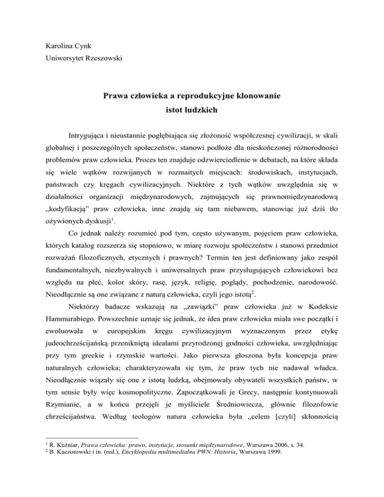Karolina Cynk Uniwersytet Rzeszowski Prawa człowieka a reprodukcyjne klonowanie istot ludzkich Intrygująca i nieustannie pogłębiająca się złożoność współczesnej cywilizacji, w skali globalnej i poszczególnych społeczeństw, stanowi podłoże dla nieskończonej różnorodności problemów praw człowieka. Proces ten znajduje odzwierciedlenie w debatach, na które składa się wiele wątków rozwijanych w rozmaitych miejscach: środowiskach, instytucjach, państwach czy kręgach cywilizacyjnych. Niektóre z tych wątków uwzględnia się w działalności organizacji międzynarodowych, zajmujących się prawnomiędzynarodową „kodyfikacją” praw człowieka, inne znajdą się tam niebawem, stanowiąc już dziś tło ożywionych dyskusji1. Co jednak należy rozumieć pod tym, często używanym, pojęciem praw człowieka, których katalog rozszerza się stopniowo, w miarę rozwoju społeczeństw i stanowi przedmiot rozważań filozoficznych, etycznych i prawnych? Termin ten jest definiowany jako zespół fundamentalnych, niezbywalnych i uniwersalnych praw przysługujących człowiekowi bez względu na płeć, kolor skóry, rasę, język, religię, poglądy, pochodzenie, narodowość. Nieodłącznie są one związane z naturą człowieka, czyli jego istotą2. Niektórzy badacze wskazują na „zawiązki” praw człowieka już w Kodeksie Hammurabiego. Powszechnie uznaje się jednak, że idea praw człowieka miała swe początki i ewoluowała w europejskim kręgu cywilizacyjnym wyznaczonym przez etykę judeochrześcijańską przenikniętą ideałami przyrodzonej godności człowieka, uwzględniając przy tym greckie i rzymskie wartości. Jako pierwsza głoszona była koncepcja praw naturalnych człowieka; charakteryzowała się tym, że praw tych nie nadawał władca. Nieodłącznie wiązały się one z istotą ludzką, obejmowały obywateli wszystkich państw, w tym sensie były więc kosmopolityczne. Zapoczątkowali je Grecy, następnie kontynuowali Rzymianie, a w końcu przejęli je myśliciele Średniowiecza, głównie filozofowie chrześcijaństwa. Według teologów natura człowieka była „celem [czyli] skłonnością 1 2 R. Kuźniar, Prawa człowieka: prawo, instytucje, stosunki międzynarodowe, Warszawa 2006, s. 34. B. Kaczorowski i in. (red.), Encyklopedia multimedialna PWN: Historia, Warszawa 1999. 2 ukierunkowującą człowieka (...) ku właściwemu mu celowi”3. Bronili oni nienaruszalności praw jednostki, których sednem była koncepcja transcendentnej godności człowieka. Z tej koncepcji wynikało ludzkie prawo do życia, wolności, dobrego imienia i prawdy oraz zakaz traktowania osoby ludzkiej jako przedmiotu. Pojawiły się wówczas pierwsze dokumenty mające moc obowiązującego prawa; przywilejem takim była Wielka Karta Swobód z 1215 roku. W Renesansie pojawiła się tzw. szkoła prawa natury. Szkoła ta odchodziła od teocentryzmu na rzecz antropocentryzmu. W teorii praw naturalnych znalazły się takie uprawnienia jak prawo do życia, wolności, równości, a także własności. Równolegle pojawiła się teoria umowy społecznej. Najogólniej głosiła ona, że w miarę swego rozwoju ludzie porzucają stan natury i tworzą społeczeństwo; w ten sposób zmienia się kontekst dla przysługujących im dotąd praw. Różne koncepcje owej umowy głosili: T. Hobbes, J. Locke, J. J. Rousseau, a także Monteskiusz. O prawie naturalnym wspominał też I. Kant, a dokładniej wskazywał on na jego nadrzędność nad prawem ustanowionym. Utożsamiał on prawo naturalne z moralnością4. W XVII wieku w Anglii pojawiają się kolejne akty prawne związane z rozszerzeniem swobód obywatelskich (The Habeas Corpus Act i The Bill of Rights). W drugiej połowie XVIII wieku miały miejsce dwie ważne rewolucje: amerykańska i francuska. Wpływ na ideę praw człowieka miała Amerykańska Deklaracja Niepodległości z 1776 roku, której „ojcem” był T. Jefferson. Na mocy tego dokumentu prawa zaliczone do katalogu praw naturalnych uznano za niezbywalne. W okresie tym zaczęto dostrzegać też związek między niezbywalnymi prawami człowieka a pokojem. Warunkiem pokoju było m. in. poszanowanie godności jednostek. Z kolei zdobyczą Wielkiej Rewolucji Francuskiej była Deklaracja Praw Człowieka i Obywatela z 1789 roku. Głosiła ona: wolność i równość ludzi wobec prawa, bezpieczeństwo, prawo do oporu, wolność jako możność czynienia wszystkiego, co nie szkodzi innym, zapewniała też swobodę myśli i poglądów. Od tej Deklaracji do praktyki upłynęło wiele dziesięcioleci, a nawet dzisiaj w wielu krajach są to tylko odległe ideały. Do końca XVIII wieku uformowano liberalną koncepcję praw człowieka, na mocy której każda jednostka była podmiotem pewnego katalogu praw naturalnych. Podkreślała ona negatywny status praw człowieka, czyli autonomię pewnej sfery życia jednostki wobec państwa 5. W wieku XIX doktryna ta zostaje wzbogacona i rozprzestrzeniona. Państwo stopniowo R. Kuźniar, Prawa człowieka..., dz. cyt., s. 20. Tamże, s. 21-23. 5 Tamże, s. 24-25, 40-41. 3 4 3 zaczynało wkraczać w różne sfery życia zbiorowego, coraz bardziej aktywnie regulowało podstawowe dziedziny tego życia. Różnego typu wstrząsy, jakie miały miejsce w XIX wieku dowiodły braku skuteczności liberalnej doktryny praw człowieka. Na początku XX wieku nadal jednak kładziono nacisk na prawa obywatelskie i wolności polityczne oraz na zagwarantowanie ochrony własności prywatnej. Był to też okres odwrotu od gospodarki rynkowej i demokracji parlamentarnej, pojawiło się wówczas zagrożenie dla praw człowieka ze strony totalitaryzmu w wariancie faszystowskim i komunistycznym. Po II wojnie światowej zaczęto umiędzynarodawiać problematykę praw człowieka. Przykładem może być, uchwalona przez Zgromadzenie Ogólne ONZ w 1948 roku, Deklaracja Praw Człowieka. Proces umiędzynarodawiania omawianych kwestii przebiegał jednak wolno i z oporami. Pr