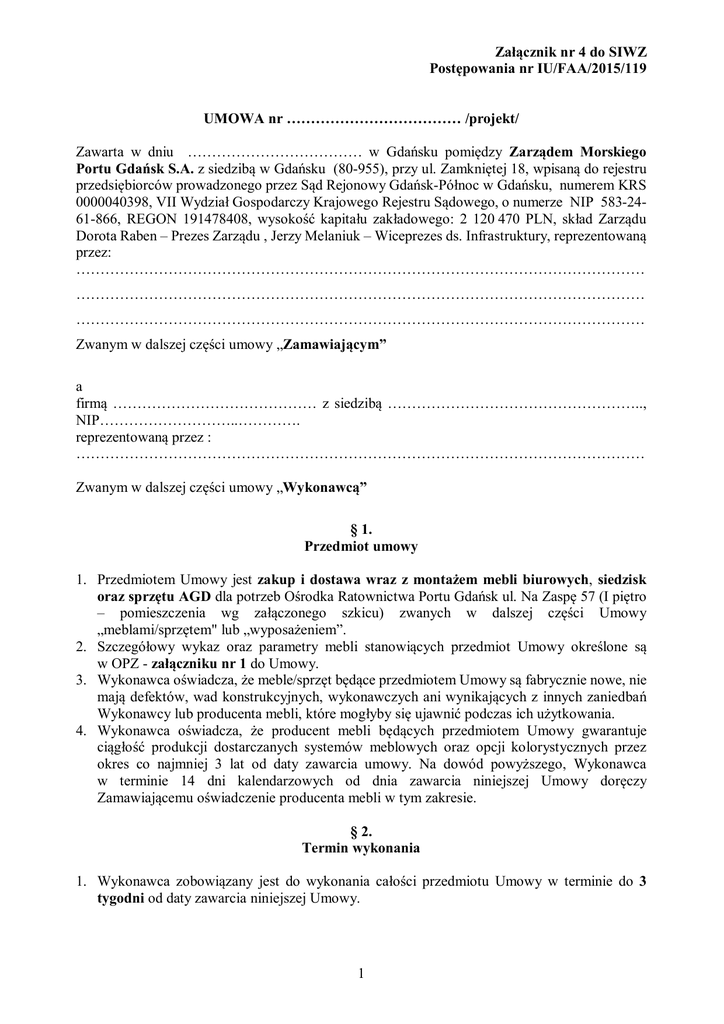 Załącznik nr 4 do SIWZ Postępowania nr IU/FAA/2015/119 UMOWA nr ……………………………… /projekt/ Zawarta w dniu ……………………………… w Gdańsku pomiędzy Zarządem Morskiego Portu Gdańsk S.A. z siedzibą w Gdańsku (80-955), przy ul. Zamkniętej 18, wpisaną do rejestru przedsiębiorców prowadzonego przez Sąd Rejonowy Gdańsk-Północ w Gdańsku, numerem KRS 0000040398, VII Wydział Gospodarczy Krajowego Rejestru Sądowego, o numerze NIP 583-2461-866, REGON 191478408, wysokość kapitału zakładowego: 2 120 470 PLN, skład Zarządu Dorota Raben – Prezes Zarządu , Jerzy Melaniuk – Wiceprezes ds. Infrastruktury, reprezentowaną przez: ……………………………………………………………………………………………………… ……………………………………………………………………………………………………… ……………………………………………………………………………………………………… Zwanym w dalszej części umowy „Zamawiającym” a firmą …………………………………… z siedzibą …………………………………………….., NIP………………………..…………. reprezentowaną przez : ……………………………………………………………………………………………………… Zwanym w dalszej części umowy „Wykonawcą” § 1. Przedmiot umowy 1. Przedmiotem Umowy jest zakup i dostawa wraz z montażem mebli biurowych, siedzisk oraz sprzętu AGD dla potrzeb Ośrodka Ratownictwa Portu Gdańsk ul. Na Zaspę 57 (I piętro – pomieszczenia wg załączonego szkicu) zwanych w dalszej części Umowy „meblami/sprzętem" lub „wyposażeniem”. 2. Szczegółowy wykaz oraz parametry mebli stanowiących przedmiot Umowy określone są w OPZ - załączniku nr 1 do Umowy. 3. Wykonawca oświadcza, że meble/sprzęt będące przedmiotem Umowy są fabrycznie nowe, nie mają defektów, wad konstrukcyjnych, wykonawczych ani wynikających z innych zaniedbań Wykonawcy lub producenta mebli, które mogłyby się ujawnić podczas ich użytkowania. 4. Wykonawca oświadcza, że producent mebli będących przedmiotem Umowy gwarantuje ciągłość produkcji dostarczanych systemów meblowych oraz opcji kolorystycznych przez okres co najmniej 3 lat od daty zawarcia umowy. Na dowód powyższego, Wykonawca w terminie 14 dni kalendarzowych od dnia zawarcia niniejszej Umowy doręczy Zamawiającemu oświadczenie producenta mebli w tym zakresie. § 2. Termin wykonania 1. Wykonawca zobowiązany jest do wykonania całości przedmiotu Umowy w terminie do 3 tygodni od daty zawarcia niniejszej Umowy. 1 Załącznik nr 4 do SIWZ Postępowania nr IU/FAA/2015/119 2. W terminie wskazanym w ust. 1 nastąpi przekazanie Zamawiającemu kompletnej dokumentacji mebli/sprzętu wymienionej w § 5 ust. 2. 3. Strony uzgodnią harmonogram dostarczenia wyposażenia (dalej: „harmonogram dostaw") określający ilość i rodzaj oraz terminy dostarczenia, na zasadach określonych w ust. 4 i 5. 4. Wykonawca w terminie do 5 dni roboczych od daty zawarcia umowy przekaże Zamawiającemu propozycję harmonogramu dostarczenia wyposażenia. W terminie 5 dni roboczych od dnia przekazania harmonogramu dostaw Zamawiającemu, Zamawiający zgłosi propozycje zmian do harmonogramu dostarczenia wyposażenia albo zaakceptuje propozycję Wykonawcy, przy czym brak jakiegokolwiek oświadczenia w tym zakresie ze strony Zamawiającego oznacza jego akceptację. 5. Przekazanie harmonogramu dostarczenia wyposażenia, propozycji zmian do tego harmonogramu, a także wszelkie uzgodnienia harmonogramu dostarczenia wyposażenia mogą dokonywać osoby wymienione w § 11, także przy użyciu poczty elektronicznej. § 3. Obowiązki Wykonawcy Wykonawca zobowiązany jest na koszt własny i staraniem własnym do: 1) dostarczenia wyposażenia wraz z montażem oraz rozmieszczeniem w siedzibie Ośrodka Ratownictwa Portu Gdańsk ul. Na Zaspę 57 (I piętro – pomieszczenia wg załączonego szkicu) w terminie określonym w § 2. ust.1; 2) wniesienia wyposażenia do pomieszczeń Ośrodka Ratownictwa Portu Gdańsk ul. Na Zaspę 57; czynności te Wykonawca może wykonywać w godzinach od 800 do 1500, w dniach od poniedziałku do piątku, z wyłączeniem dni ustawowo wolnych od pracy; prace będą wykonywane w sposób zapewniający jak najmniejszą uciążliwość dla normalnego funkcjonowania pozostałych Użytkowników budynku; 3) wyczyszczenia wyposażenia umożliwiającego ich użytkowanie (wytarcie z kurzu, usunięcie opiłek drewna itp.); 4) przekazania wyposażenia na podstawie protokołu przekazania, zawierającego: liczbę porządkową, model, nazwę producenta, ilość. Projekt ww. protokołu Wykonawca przekaże Zamawiającemu w wersji elektronicznej na adres [email protected] najpóźniej na 2 (dwa) dni robocze przed pierwszą dostawą; 6) przekazania Zamawiającemu dokumentacji dotyczącej wyposażenia, o której mowa w § 5 ust.2; 7) zapewnienia serwisu gwarancyjnego na zasadach określonych w Umowie. § 4. Obowiązki Zamawiającego Zamawiający zobowiązany jest do: 1) odbioru wyposażenia stanowiącego przedmiot Umowy, z zastrzeżeniem § 5 ust. 3 - 6; 2) zapłaty ceny Umownej, z zastrzeżeniem § 8. 2 Załącznik nr 4 do SIWZ Postępowania nr IU/FAA/2015/119 § 5. Dostarczenie, odbiór 1. Wykonawca dostarczy wyposażenie do siedziby Zamawiającego w terminach określonych w harmonogramie dostaw. 2. Wykonawca nie później niż wraz z ostatnią dostawą wyposażenia przekaże Zamawiającemu dokumentację mebli/sprzętu, zgodną z warunkami określonymi w Umowie, karty katalogowe poszczególnych mebli/sprzętu, atesty, certyfikaty oraz gwarancję na meble/sprzęt wystawioną przez producenta. 3. Każda częściowa dostawa, zgodnie z harmonogramem dostaw, potwierdzona będzie podpisanym przez obie Strony protokołem przekazania, w którym określona zostanie ilość i rod