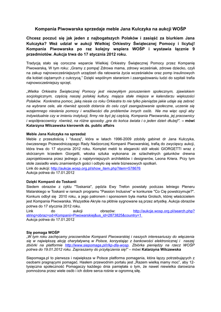 Kompania Piwowarska sprzedaje meble Jana Kulczyka na aukcji WOŚP Chcesz poczuć się jak jeden z najbogatszych Polaków i zasiąść za biurkiem Jana Kulczyka? Weź udział w aukcji Wielkiej Orkiestry Świątecznej Pomocy i licytuj! Kompania Piwowarska po raz kolejny wspiera WOŚP i wystawia łącznie 9 przedmiotów. Aukcja trwa do 17 stycznia 2012 roku. Tradycją stało się coroczne wsparcie Wielkiej Orkiestry Świątecznej Pomocy przez Kompanię Piwowarską. W tym roku: „Gramy z pompą! Zdrowa mama, zdrowy wcześniak, zdrowe dziecko, czyli na zakup najnowocześniejszych urządzeń dla ratowania życia wcześniaków oraz pomp insulinowych dla kobiet ciężarnych z cukrzycą.” Dzięki wspólnym staraniom i zaangażowaniu ludzi do szpitali trafia najnowocześniejszy sprzęt. „Wielka Orkiestra Świątecznej Pomocy jest niezwykłym poruszeniem społecznym, zjawiskiem socjologicznym, częścią naszej polskiej kultury, mająca stałe miejsce w kalendarzu większości Polaków. Konkretna pomoc, jaką niesie co roku Orkiestra to nie tylko pieniądze jakie udaje się zebrać na wybrane cele, ale również sposób dotarcia do celu czyli zaangażowanie społeczne, uczenie się wzajemnego niesienia pomocy i wrażliwości dla problemów innych osób. Nie ma więc opcji aby indywidualnie czy w imieniu instytucji, firmy nie być jej częścią. Kompania Piwowarska, jej pracownicy i współpracownicy również, na różne sposoby „gra do końca świata i o jeden dzień dłużej!”. – mówi Katarzyna Wilczewska kierownik ds. public affairs Meble Jana Kulczyka na sprzedaż Meble z przeszłością i "duszą", która w latach 1996-2009 zdobiły gabinet dr Jana Kulczyka, ówczesnego Przewodniczącego Rady Nadzorczej Kompanii Piwowarskiej, trafią do zwycięscy aukcji, która trwa do 17 stycznia 2012 roku. Komplet mebli to elegancki stół włoski GIORGETTI wraz z skórzanym krzesłem Giorgetti, włoska sztuka wykonana ze szlachetnych gatunków drewna zaprojektowana przez jednego z najsłynniejszych architektów i designerów, Leona Kriera. Przy tym stole zasiadło wielu znamienitych gości i odbyło się wiele biznesowych spotkań. Link do aukcji: http://aukcje.wosp.org.pl/show_item.php?item=578676 Aukcja potrwa do 17.01.2012 Dzięki Kompanii do Toskanii Siedem obrazów z cyklu "Toskania", pędzla Ewy Trefon powstały podczas letniego Pleneru Malarskiego w Toskanii w ramach programu "Passion Inclusive" w konkursie "Co Cię powstrzymuje?". Konkurs odbył się 2010 roku, a jego patronem i sponsorem była marka Grolsch, której właścicielem jest Kompania Piwowarska. Wszystkie Akryle na płótnie sygnowane są przez artystkę. Aukcja obrazów potrwa do 17 stycznia 2012 roku. Link do aukcji obrazów: http://aukcje.wosp.org.pl/search.php? string=obraz+od+Kompanii+Piwowarskiej&us_id=2873825&country=1 Aukcja potrwa do 17.01.2012 Się pomaga WOŚP „W tym roku zachęcamy pracowników Kompanii Piwowarskiej i naszych interesariuszy do włączenia się w największą akcję charytatywną w Polsce, korzystając z bankowości elektronicznej i naszej zbiórki na platformie http://www.siepomaga.pl/r/kp-dla-wosp. Zbiórka pieniędzy na rzecz WOŚP potrwa do 19.01.2012 roku. Zapraszamy do przyłączenia się!” – mówi Katarzyna Wilczewska Siepomaga.pl to pierwsza i największa w Polsce platforma pomagania, która łączy potrzebujących z osobami pragnącymi pomagać. Hasłem przewodnim portalu jest „Razem wielką mamy moc”, aby 12tysięczna społeczność Pomagaczy każdego dnia pamiętała o tym, że nawet niewielka darowizna pomnożona przez wiele osób i ich dobre serca rośnie w ogromną siłę. Siepomaga.pl powstało 16.04.2009, aby bezpłatnie wspierać organizacje pozarządowe w zbieraniu środków na cele charytatywne. Działa pod honorowym patronatem Ministerstwa Zdrowia. Współpracuje z 438 organizacjami pozarządowymi, przeprowadziło ponad 300 akcji charytatywnych. W listopadzie 2011r. licznik zebranych e-darowizn wybił 1 000 000 zł. Największa pojedyncza wpłata wyniosła 24 tys.zł, najmniejsza 1 zł. Do redaktora: Kompania Piwowarska - Lider branży piwowarskiej w Polsce Kompania Piwowarska jest największym przedsiębiorstwem piwowarskim w Polsce. Kilkusetletnie doświadczenia w warzeniu piwa, nowoczesne technologie i rygorystyczne przestrzeganie zasad produkcji na światowym poziomie gwarantują najwyższą jakość naszych produktów. Do portfela marek KP należą najpopularniejsze polskie piwa - m.in. Tyskie, Żubr, Lech, Dębowe Mocne, Redd's, a także międzynarodowe marki premium: Pilsner Urquell, Grolsch oraz Peroni Nastro Azzurro. Kompania Piwowarska (utworzona w 1999 roku) posiada trzy browary (w Tychach, Poznaniu i Białymstoku) oraz oddziały handlowe na terenie całego kraju. Kompania Piwowarska prowadzi także działalność społeczną nastawioną na walkę z wykluczeniem społecznym na tle ubóstwa oraz programy edukacyjne popularyzujące odpowiedzialność i umiar w konsumowaniu alkoholu. Wielkość sprzedaży osiągniętej przez KP w roku finansowym zakończonym 31 marca 2011 r. wyniosła 14,1 mln hektolitrów piwa. SABMiller – jeden z największych na świecie producentów piwa Kompania Piwowarska jest częścią jednego z największych na świecie producentów piwa - SABMiller plc. Grupa produkuje lub dystrybuuje piwo na sześciu kontynentach, a jej ogólnoświatowy portfel obejmuje międzynarodowe piwa premium, takie jak Grolsch, Miller Genuine Draft, Peroni Nastro Azzurro czy Pilsner Urquell oraz czołowe marki lokalne, takie jak Aquila, Castle, Miller Lite, Snow czy Tyskie. SABMiller jest jedną z największych na świecie (poza USA) firm rozlewających produkty Coca-Coli. W roku finansowym zakończonym 31 marca 2011 SABMiller osiągnął przychody w wysokości 28,3 mld USD oraz wypracował zysk brutto (EBITA) w wysokości 5 mld USD. SABMiller plc jest notowany na giełdach papierów wartościowych w Londynie i Johannesburgu. Dodatkowych informacji udziela