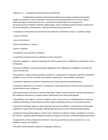 Załącznik nr.1 - szczegółowy opis przedmiotu zamówienia Przedmiotem zamówienia jest dostawa fabrycznie nowego urządzenia do pomiaru prędkości pojazdów w ruchu drogowym z jednoczesną rejestracją wykroczeń w formie zdjęcia wykonywanego techniką cyfrową wraz ze sprzętem komputerowym oraz programami komputerowymi do obróbki materiału zdjęciowego i emisji kompletnej dokumentacji mandatowej dla Straży Miejskiej w Daleszycach o niżej przedstawionych parametrach : 1.Urządzenie uniwersalne przystosowane do pomiarów w dowolnym miejscu na poboczu drogi –praca ze statywu -praca w kontenerze -praca w obudowie na maszcie -pomiar z pojazdu 2.Urządzenie musi posiadac możliwość : a.urządzenie przystosowane do zdalnego przesyłu informacji b.pomiaru prędkości i rejestracji pojazdów do dwóch pasów ruchu z dokładnym wizerunkiem twarzy kierującego c.pomiaru prędkości i rejestracji pojazdów zbliżających się i oddalających względem przyrządu lub razem oba kierunki d.rozróżniania i rejestrowania pojazdów osobowych i ciężarowych i możliwość ustawienia odrębnych prędkości w tym samym czasie dla samochodów ciężarowych i samochodów osobowych e.możliwość rejestracji w pamięci liczby wykroczeń, liczby pojazdów przejeżdżających f.możliwość odtworzenia na miejscu i w dowolnym czasie dokumentacji zdarzenia bez konieczności zatrzymywania pracy urządzenia g.byc przystosowane do pracy w okresie całej doby a zdjęcia w porze nocnej winny być wykonywane bez oślepienia kierowców z czytelną tablicą rejestracyjną oraz twarzą kierującego h.identyfikacji w tle zdjęcia –numeru urządzenia, daty i czasu pomiaru z dokładnością do 1 sekundy ,prędkości dozwolonej i stwierdzonej ,numeru zdjęcia,lokalizacji pomiaru oraz kierunku pomiaru. i.rejestracji czytelnego zdjęcia w całym zakresie mierzonych prędkości z możliwością nie budzącego wątpliwości rozpoznania kierującego i dokładnego odczytania numeru rejestracyjnego pojazdu. j.możliwość wykonywania zdjęć ze statywu lub z kontenera na poboczu drogi ,z obudowy na maszcie jak również z pojazdu zaparkowanego na poboczu drogi przy otwartej i zamkniętej klapie samochodu. k.wyposażenie w dwa zestawy akumulatorów do wersji przewoźnej i wersji stacjonarnej i czas działania zestawu min.8 godzin 3.Ponadto system powinien spełniać następujące założenia: a.wyposażenie urzadzenia w panel sterujący;ekran dotykowy lub klawiaturowy umożliwiający łączność bezprzewodową b.wyeksponowanie dowolnego fragmentu zdjęcia np.numer rejestracyjny pojazdu,twarz kierowcy z możliwością ustawienia jasności oraz kontrastu c.umożliwiać przenoszenie zawartości do komputera i posiadać kompatybilny program komunikacyjny do przenoszenia zawartości pamięci do innych programów analitycznych d.posiadać program do obróbki materiału zdjęciowego oraz emisji kompletnej dokumentacji postepowania w sprawie o wykroczenie (mandatowej) z licencją i oświadczeniem o możliwości jej modyfikacji według potrzeb zamawiającego (zainstalowanie programu na komputerze wskazanym przez zamawiającego na koszt własny wykonawcy i dostarczeniu urządzenia zamawiającemu). e.urzadzenie musi być przystosowane do pracy w temperaturze od -10 stopni do + 50 stopni Celsjusza f.możliwość porządkowania bazy danych według zadanych kryteriów –rosnąco i malejąco g.możliwość wyszukiwania wykroczeń według zadanych kryteriów :daty,czasu,prędkości,numeru zdjęcia,numeru rejestracyjnego pojazdu,numeru prowadzonej sprawy. h.sprzet komputerowy,pulpity sterownicze,oprogramowanie oraz instrukcje winny być w języku polskim 4.Inne warunki techniczne to: a.kamera o cyfrowym zapisie zdjęć nie mniejszym niż 1.5 mln pikseli b.możliwość uzyskania zdjęć w efekcie głębi koloru min 16 bit c.odpowiednie filtry redukujące refleksy na szybach przednich pojazdów d.lampa błyskowa o osobnym źródle zasilania i możliwość ciągłej pracy bez efektu przegrzania e.czas przeładowania lampy błyskowej max 0.5 sekundy f.możliwośc wykonania zdjęć zarówno w dzień jak i wnocy bez oślepiania kierujących pojazdami g.zakres pomiaru od 20 do 250 km/h a dokładność pomiaru +/- 3km/h do 100 km/h oraz +/- 3% powyżej 100 km/h h.ustawienia prędkości co 1 km/h i.sprzet komputerowy o wymaganiach : -urzadzenie musi być przystosowane w pełnym zakresie do współpracy z urządzeniem wykonującym pomiar na drodze oraz urzadzeniem wykonującym pomiar w stacji bazowej -posiadac zainstalowane oprogramowanie rekomendowane przez producenta urzadzenia pomiarowego,które umożliwi poprzez łącznośc bezprzewodową sterowanie pracą urządzenia pomiarowego na odległość oraz podgląd rejestrowanych wykroczeń przekroczenia prędkości -mieć możliwość poprzez system łączności bezprzewodowej przenoszenia zarejestrowanych przekroczeń prędkości ze stacji bazowej do swojej pamięci a poźniej poprzez pamięć przenośną USB do komputera bazowego -posiadać alternatywne urzadzenie umożliwiające pobór prądu z instalacji samochodowej(zasilacz samochodowy). 5.Komputer bazowy z oprogramowaniem umożliwiającym analizę i gromadzenie danych z fotoradaru o nie gorszych parametrach niż : -procesor dwurdzeniowy INTEL lub AMD -pamięć operacyjna DDR 2 2GB -dysk twardy 250 GB -nagrywarka DVD RW+/-płyta główna z obsługą pamięci w trybie dwukanałowym, 4-6 gniazd USB 3x PCI ,1 x PCI Express 16x, gniazdo LAN 100 Mb -karta graficzna PCI Express 16x,256 MB ,128 bit -napęd dyskietek 1,44 MB -obudowa MIDI -system operacyjny Windows XP Professional SP 3 -pakiet MS Office Small Bussines 2007 -akcesoria: mysz optyczna ,klawiatura,pamięć flash USB 4GB ,czytnik kart flash 5in1 -monitor 22 LCD -drukarka kolorowa laserowa ,format papieru A-4 -skaner kolorowy 600 dpi 6.System operacyjny oraz oprogramowanie powinno umożliwiać co najmniej: -tworzenie baz danych zawierających zdjęcia z uwzględnieniem daty wykonani