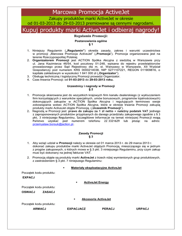 Marcowa Promocja ActiveJet Zakupy produktów marki ActiveJet w okresie od 01-03-2013 do 29-03-2013 premiowane są cennymi nagrodami. Kupuj produkty marki ActiveJet i odbieraj nagrody! Regulamin Promocji: Postanowienia ogólne §1 1. Niniejszy Regulamin („Regulamin”) określa zasady, zakres i warunki uczestnictwa w promocji „Marcowa Promocja ActiveJet” („Promocja”). Promocja organizowana jest na terenie Rzeczypospolitej Polskiej. 2. Organizatorem Promocji jest ACTION Spółka Akcyjna z siedzibą w Warszawie przy ul. Jana Kazimierza 46/54, kod pocztowy 01-248, wpisana do rejestru przedsiębiorców prowadzonego przez Sąd Rejestrowy dla m. st. Warszawy w Warszawie, XII Wydział Gospodarczy pod numerem KRS 0000214038, NIP 5271107221, REGON 011909816, o kapitale zakładowym w wysokości 1 641 000 zł („Organizator”). 3. Obsługę techniczną i logistyczną Promocji prowadzi Organizator. 4. Czas trwania Promocji: od 01-03-2013 do 29-03-2013 roku. Uczestnicy i nagrody w Promocji §2 1. Promocja skierowana jest do wszystkich krajowych firm kanału dealerskiego (z wykluczeniem firm korzystających z warunków specjalnych, umów bonusowych, programów lojalnościowych) dokonujących zakupów w ACTION Spółka Akcyjna i regulujących terminowo swoje zobowiązania wobec ACTION Spółka Akcyjna, które w okresie trwania Promocji zakupią produkty marki ActiveJet objęte Promocją. („Uczestnik Promocji”). 2. Nagrodą w Promocji jest: prawo do zakupu za 1 zł netto + należny podatek VAT jednego z zaproponowanych produktów przypisanych do danego przedziału zakupowego zgodnie z § 3 pkt. 3 niniejszego Regulaminu. Szczegółowe informacje na temat niniejszej Promocji mogą Państwo uzyskać pod numerem telefonu 22 3321629 lub pisząc na adres: [email protected]. Zasady Promocji §3 1. Aby wziąć udział w Promocji należy w okresie od 01 marca 2013 r. do 29 marca 2013 r. dokonać zakupu produktów marki ActiveJet objętych Promocją, mieszczącego się w jednym z progów zakupowych, o których mowa w § 3 pkt. 3 niniejszego Regulaminu, przy czym zakup musi być dokonany na jednej fakturze VAT. 2. Promocją objęte są produkty marki ActiveJet z trzech niżej wymienionych grup produktowych, z zastrzeżeniem § 3 pkt. 7 niniejszego Regulaminu: Materiały eksploatacyjne ActiveJet Początek kodu produktu: EXPACJ ActiveJet Energy Początek kodu produktu: OSWACJ ZASACJ Akcesoria ActiveJet Początek kodu produktu: ARMACJ EXPACJACZ PERACJ URPACJ 3. Progi zakupowe, których realizacja uprawnia do udziału w Promocji podane są w wartościach netto w złotych polskich. Przy zamówieniu promocyjnym w każdym przedziale zakupowym do wyboru jest jedna z zaproponowanych nagród, zgodnie z poniższą tabelą: NAGRODA DO WYBORU: TUSZE ACTIVEJET Z OFERTY ACTION W CENIE DO 70 ZŁ NETTO ALBO BEZPRZEWODOWA STACJA POGODOWA ACTIVEJET AST-201 ALBO SUSZARKA PHILIPS SALON DRY HP 8103/00+ ACJ KLAWIATURA K-1071SB USB ŻELAZKO PHILIPS GC 2710+ACJ LISTWA PRZECIWPRZEPIĘCIOWA ACP-5CL 3M ALBO PODSTAWKA POD NOTEBOOKA LOGITECH COOLING PAD N120 + MYSZ ACTIVEJET ACJ AMY-005 USB ALBO TONERY ACTIVEJET Z OFERTY ACTION W CENIE DO 100 ZŁ NETTO ALBO SŁUCHAWKI Z MIKROFONEM LOGITECH OEM PC HEADSET 960 + MYSZ ACTIVEJET AMY-005 USB UPS ACTIVEJET AJE-550 SINUS LCD ALBO ODKURZACZ ZELMER METEOR 2 400.0F16EK ALBO SAMOCHODOWY REJESTRATOR OBRAZU MEDIA-TECH U-DRIVE DVR 720P DYSK HDD SEAGATE BACKUP PLUS 1TB STCA1000200 ZEW ALBO RADIO CB PRESIDENT TEDDY ASC LUB CB M-TECH LEGEND III ALBO MONITOR PHILIPS LED 18,5" 196V4LSB2/00 TABLET PENTAGRAM TAB 8.3 PC 8" LED 1024X768, DUALCORE 1.5GHZ,1GB RAM, 8GB FLASH, KAMERA PRZÓD/TYŁ 0.3MPIX I 2MPIX ALBO ZESTAW GARNKÓW TEFAL C806S1 VOLUPTY 10 CZĘŚCI ALBO ZESTAW GARNKÓW TEFAL L52799 INGENIO CLASSIC 20 CZĘŚCI ALBO KOSIARKA ELEKTRYCZNA MAKITA ELM3710 KIEROWNICA LOGITECH DRIVING FORCE GT+MYSZ LOGITECH WIRELESS M600 ALBO URZĄDZENIE WIELOFUNKCYJNE BROTHER DCP-7070DW ALBO APARAT NIKON COOLPIX L810 ALBO ŻELAZKO SYSTEMOWE TEFAL GV 7450 TV 32" LCD SAMSUNG LE32E420 ALBO SMARTPHONE LG L9 (P760) ALBO STÓŁ DO TENISA STOŁOWEGO KETTLER MATCH 3.0 7135-600 ALBO ŁAWKA KETTLER PRIMUS 07403-900 MYJKA WYSOKOCIŚNIENIOWA KARCHER 5.700 X-RANGE ALBO PS3 500GB + GRA PS3 CALL OF DUTY BLACK OPS II ALBO KONSOLA XBOX 360 250GB + KINECT + KINECT ADVENTURES ALBO NOTEBOOK LENOVO IDEAPAD B590 B960 4GB 15,6LED HD 320GB INTHD DOS ODKURZACZ PRZEMYSŁOWY KARCHER PUZZI 8/1 C ALBO ROWER MERIDA CROSSWAY 40-D LUB 40-D LADY ALBO TV 42" LCD LED LG 42LS3450 ALBO TV 40" LCD SAMSUNG UE40EH5020 SONY VAIO SVE1512H1EW I3-3110M 4GB 15,5LED HD 640GB ATI76501GB W8 ALBO TABLET SAMSUNG GALAXY NOTE 10.1 (N8000) 16GB 3G ALBO SAMSUNG I9300 GALAXY S III ALBO APARAT NIKON D5100 KIT + OBIEKTYW 18-55VR IPAD 4 (WITH RETINA DISPLAY) 32GB WIFI+4G ALBO WYBRANY PRODUKT Z OFERTY ACTION W CENIE DO 2400 PLN NETTO BIEŻNIA HORIZON FITNESS ADVENTURE 5 PLUS ALBO WYBRANY PRODUKT Z OFERTY ACTION W CENIE DO 4500 PLN NETTO SONY VAIO SVS13A2X9ES I7-3520M 8GB 13,3LED HD+ 256SSD GT6402GB 3G W8P ALBO WYBRANY PRODUKT Z OFERTY ACTION W CENIE DO 6300 PLN NETTO ZAKUP Z PRZEDZIAŁU (PLN NETTO) 700 999,99 1 000 1 499,99 1 500 1 999,99 2 000 2 999,99 3 000 4 499,99 4 500 5 799,99 5 800 6 999,99 7 000 8 499,99 8 500 10 999,99 11 000 13 499,99 13 500 24 999,99 25 000 34 999,99 35 000 …. 4. Jeśli suma zamówienia promocyjnego przekracza wartość 8 000 zł netto, po ustaleniu z Handlowcem lub Regionalnym Doradcą Handlowym możliwe jest zrealizowanie go na maksymalnie 3 fakturach VAT. Maksymalny czas realizacji dzielonych zamówień promocyjnych wynosi 3 dni robocze. 5. Zakup produktów marki ActiveJet objętych Promocją o wartości mieszczącej się w jednym z wymienionych w § 3 pkt. 3 Regulaminu progów zakupowych uprawnia Uczestnika Promocji do zakupu za 1 zł netto + należny podatek VAT produktu przypisanego do wymienionego progu zakupowego. Nagroda przekazana będzie przy realizacji zamówienia promocyjnego lub zgodnie z § 4 pkt. 1 – 3. Zamówienie promocyj