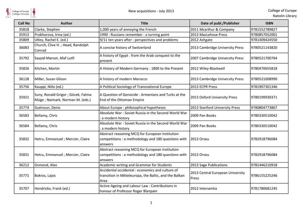 New acquisitions - July 2013 College of Europe Natolin Library Call