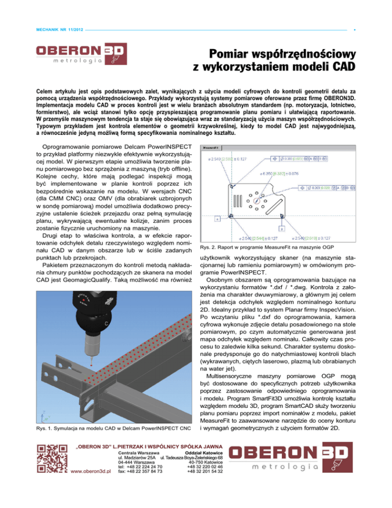 • MECHANIK NR 11/2012 Pomiar współrzędnościowy z wykorzystaniem modeli CAD Celem artykułu jest opis podstawowych zalet, wynikających z użycia modeli cyfrowych do kontroli geometrii detalu za pomocą urządzenia współrzędnościowego. Przykłady wykorzystują systemy pomiarowe oferowane przez firmę OBERON3D. Implementacja modelu CAD w proces kontroli jest w wielu branżach absolutnym standardem (np. motoryzacja, lotnictwo, formierstwo), ale wciąż stanowi tylko opcję przyspieszającą programowanie planu pomiaru i ułatwiającą raportowanie. W przemyśle maszynowym tendencja ta staje się obowiązująca wraz ze standaryzacją użycia maszyn współrzędnościowych. Typowym przykładem jest kontrola elementów o geometrii krzywokreślnej, kiedy to model CAD jest najwygodniejszą, a równocześnie jedyną możliwą formą specyfikowania nominalnego kształtu. Oprogramowanie pomiarowe Delcam PowerINSPECT to przykład platformy niezwykle efektywnie wykorzystującej model. W pierwszym etapie umożliwia tworzenie planu pomiarowego bez sprzężenia z maszyną (tryb offline). Kolejne cechy, które mają podlegać inspekcji mogą być implementowane w planie kontroli poprzez ich bezpośrednie wskazanie na modelu. W wersjach CNC (dla CMM CNC) oraz OMV (dla obrabiarek uzbrojonych w sondę pomiarową) model umożliwia dodatkowo precyzyjne ustalenie ścieżek przejazdu oraz pełną symulację planu, wykrywającą ewentualne kolizje, zanim proces zostanie fizycznie uruchomiony na maszynie. Drugi etap to właściwa kontrola, a w efekcie raportowanie odchyłek detalu rzeczywistego względem nominału CAD w danym obszarze lub w ściśle zadanych punktach lub przekrojach. Pakietem przeznaczonym do kontroli metodą nakładania chmury punktów pochodzących ze skanera na model CAD jest GeomagicQualify. Taką możliwość ma również Rys. 1. Symulacja na modelu CAD w Delcam PowerINSPECT CNC Rys. 2. Raport w programie MeasureFit na maszynie OGP użytkownik wykorzystujący skaner (na maszynie stacjonarnej lub ramieniu pomiarowym) w omówionym programie PowerINSPECT. Osobnym obszarem są oprogramowania bazujące na wykorzystaniu formatów *.dxf / *.dwg. Kontrola z założenia ma charakter dwuwymiarowy, a głównym jej celem jest detekcja odchyłek względem nominalnego konturu 2D. Idealny przykład to system Planar firmy InspecVision. Po wczytaniu pliku *.dxf do oprogramowania, kamera cyfrowa wykonuje zdjęcie detalu posadowionego na stole pomiarowym, po czym automatycznie generowana jest mapa odchyłek względem nominału. Całkowity czas procesu to zaledwie kilka sekund. Charakter systemu doskonale predysponuje go do natychmiastowej kontroli blach (wykrawanych, ciętych laserowo, plazmą lub obrabianych na water jet). Multisensoryczne maszyny pomiarowe OGP mogą być dostosowane do specyficznych potrzeb użytkownika poprzez zastosowanie odpowiedniego oprogramowania i modelu. Program SmartFit3D umożliwia kontrolę kształtu względem modelu 3D, program SmartCAD służy tworzeniu planu pomiaru poprzez import nominałów z modelu, pakiet MeasureFit to zaawansowane narzędzie do oceny konturu i wymagań geometrycznych z użyciem formatów 2D.