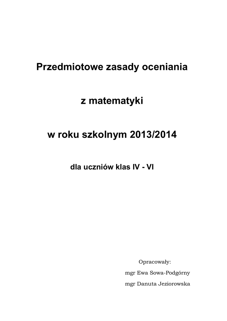 Przedmiotowe zasady oceniania z matematyki w roku szkolnym 2013/2014 dla uczniów klas IV - VI Opracowały: mgr Ewa Sowa-Podgórny mgr Danuta Jeziorowska Przedmiotowy system oceniania 1 Przedmiotowe zasady oceniania (PZO) z matematyki są zgodne z podstawą programową oraz obowiązującymi w szkole wewnątrzszkolnymi zasadami oceniania (WZO). I. Ogólne zasady oceniania uczniów 1. Ocenianie osiągnięć edukacyjnych ucznia polega na rozpoznawaniu przez nauczyciela postępów w opanowaniu przez ucznia wiadomości i umiejętności oraz jego poziomu w stosunku do wymagań edukacyjnych wynikających z podstawy programowej i realizowanych w szkole programów nauczania, opracowanych zgodnie z nią. 2. Nauczyciel: • informuje ucznia o poziomie jego osiągnięć edukacyjnych oraz o postępach w tym zakresie; • udziela uczniowi pomocy w samodzielnym planowaniu swojego rozwoju; • motywuje ucznia do dalszych postępów w nauce; • dostarcza rodzicom informacji o postępach, trudnościach w nauce oraz specjalnych uzdolnieniach ucznia. 3. Oceny są jawne dla ucznia i jego rodziców. 4. Na wniosek ucznia lub jego rodziców nauczyciel uzasadnia ustaloną ocenę w sposób określony w statucie szkoły. 5. Na wniosek ucznia lub jego rodziców sprawdzone i ocenione pisemne prace kontrolne są udostępniane do wglądu uczniowi lub jego rodzicom. 6. Szczegółowe warunki i sposób oceniania wewnątrzszkolnego określa statut szkoły. II. Kryteria oceniania poszczególnych form aktywności Ocenie podlegają: prace klasowe, sprawdziany, odpowiedzi ustne, prace domowe, ćwiczenia praktyczne, praca ucznia na lekcji, prace dodatkowe oraz szczególne osiągnięcia. 1. Prace klasowe(sprawdziany) przeprowadza się w formie pisemnej, a ich celem jest sprawdzenie wiadomości i umiejętności ucznia z zakresu danego działu. • Prace klasowe planuje się na zakończenie każdego działu. • Uczeń jest informowany o planowanej pracy klasowej z co najmniej tygodniowym wyprzedzeniem. • Każdą pracę klasową poprzedza lekcja (lub dwie lekcje) powtórzeniowa, podczas której nauczyciel zwraca uwagę uczniów na najważniejsze zagadnienia z danego działu. • Zasady uzasadniania oceny z pracy klasowej, jej poprawy oraz sposób przechowywania prac klasowych są zgodne z WZO. • Praca klasowa umożliwia sprawdzenie wiadomości i umiejętności na wszystkich poziomach wymagań edukacyjnych – od koniecznego do wykraczającego. • Zasada przeliczania oceny punktowej na stopień szkolny jest zgodna z WZO. • Zadania z pracy klasowej są przez nauczyciela omawiane i poprawiane po oddaniu prac. 2. Kartkówki (krótkie sprawdziany)przeprowadza się w formie pisemnej, a ich celem jest sprawdzenie wiadomości i umiejętności ucznia z zakresu programowego 2, 3 ostatnich jednostek lekcyjnych. • Nauczyciel nie ma obowiązku uprzedzania uczniów o terminie i zakresie programowym krótkiego sprawdzianu. • Sprawdzian krotki jest tak skonstruowany, by uczeń mógł wykonać wszystkie polecenia w czasie nie dłuższym niż 15 minut. • Sprawdzian krótki jest oceniany w skali punktowej, a liczba punktów jest przeliczana na ocenę zgodnie z zasadami WZO. • Umiejętności i wiadomości objęte sprawdzianem krótkim wchodzą w zakres pracy klasowej przeprowadzanej po zakończeniu działu i tym samym zła ocena ze sprawdzianu krótkiego może zostać poprawiona pracą klasową. • Zasady przechowywania sprawdzianów reguluje WZO. 3. Odpowiedź ustna obejmuje zakres programowy aktualnie realizowanego działu. Oceniając odpowiedź ustną, nauczyciel bierze pod uwagę: • zgodność wypowiedzi z postawionym pytaniem, • prawidłowe posługiwanie się pojęciami, 4. 5. 6. 7. 8. • zawartość merytoryczną wypowiedzi, • sposób formułowania wypowiedzi. Praca domowa jest pisemną lub ustną formą ćwiczenia umiejętności i utrwalania wiadomości zdobytych przez ucznia podczas lekcji. • Pisemną pracę domową uczeń wykonuje w zeszycie, w zeszycie ćwiczeń lub w formie zleconej przez nauczyciela. • Brak pracy domowej oceniany jest zgodnie z umową nauczyciela z uczniami, przy uwzględnieniu zapisów WZO. • Błędnie wykonana praca domowa jest sygnałem dla nauczyciela, mówiącym o konieczności wprowadzenia dodatkowych ćwiczeń utrwalających umiejętności i nie może być oceniona negatywnie. • Przy wystawianiu oceny za pracę domową nauczyciel bierze pod uwagę samodzielność, poprawność i estetykę wykonania. Aktywność i praca ucznia na lekcji są oceniane wg WZO . Ćwiczenia praktyczne obejmują zadania praktyczne, które uczeń wykonuje podczas lekcji. Oceniając je, nauczyciel bierze pod uwagę: • wartość merytoryczną, • dokładność wykonania polecenia, • staranność i estetykę, • w wypadku pracy w grupie stopień zaangażowania w wykonanie ćwiczenia. Prace dodatkowe obejmują dodatkowe zadania dla zainteresowanych uczniów, prace projektowe wykonane indywidualnie lub zespołowo, przygotowanie gazetki ściennej, wykonanie pomocy naukowych, prezentacji. Oceniając ten rodzaj pracy, nauczyciel bierze pod uwagę m.in.: • wartość merytoryczną pracy, • estetykę wykonania, • wkład pracy ucznia, • sposób prezentacji, • oryginalność i pomysłowość pracy. Szczególne osiągnięcia uczniów, w tym udział w konkursach przedmiotowych, szkolnych i międzyszkolnych, są oceniane zgodnie z zasadami zapisanymi w WZO. III. Kryteria wystawiania oceny po I semestrze oraz na koniec roku szkolnego 1. Klasyfikacja semestralna i roczna polega na podsumowaniu osiągnięć edukacyjnych ucznia oraz ustaleniu oceny klasyfikacyjnej. 2. Zgodnie z zapisami WZO nauczyciele i wychowawcy na początku każdego roku szkolnego informują uczniów oraz ich rodziców o: • wymaganiach edukacyjnych niezbędnych do uzyskania poszczególnych śródrocznych i rocznych ocen klasyfikacyjnych z matematyki, • sposobach sprawdzania osiągnięć edukacyjnych uczniów, • warunkach i trybie uzys