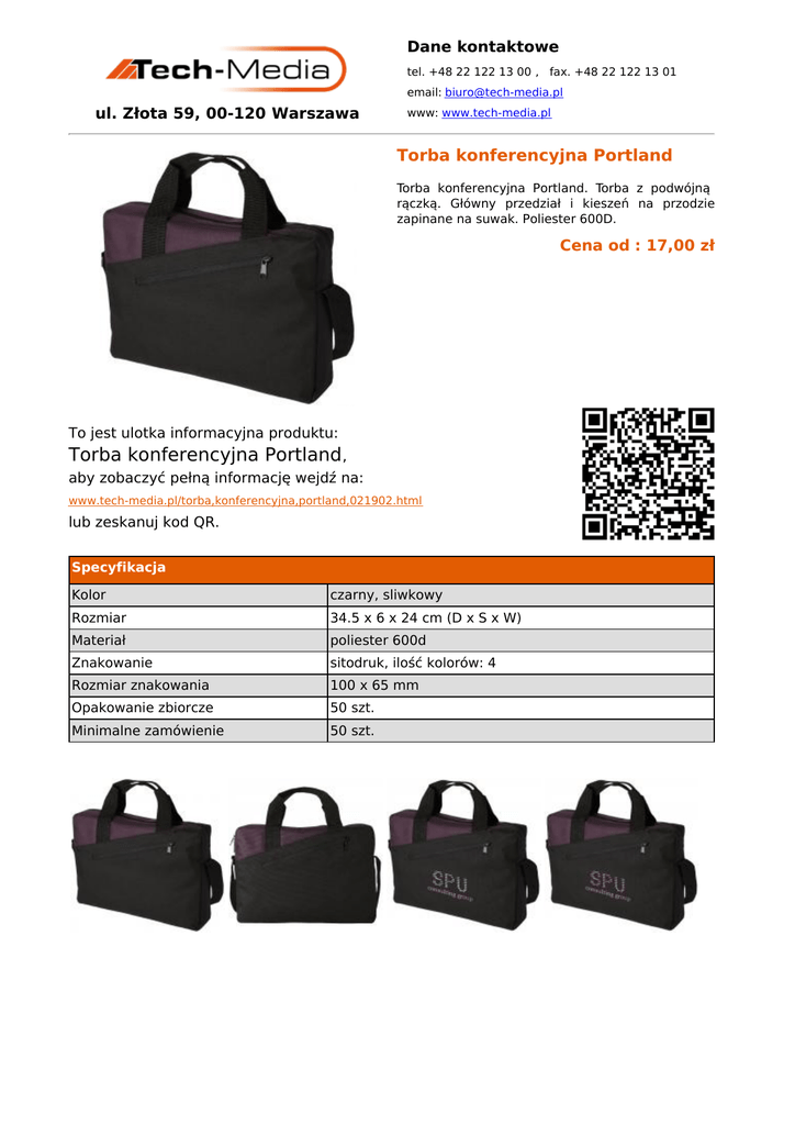 Dane kontaktowe tel. +48 22 122 13 00 , fax. +48 22 122 13 01 email: [email protected] ul. Złota 59, 00-120 Warszawa www: www.tech-media.pl Torba konferencyjna Portland Torba konferencyjna Portland. Torba z podwójną rączką. Główny przedział i kieszeń na przodzie zapinane na suwak. Poliester 600D. Cena od : 17,00 zł To jest ulotka informacyjna produktu: Torba konferencyjna Portland , aby zobaczyć pełną informację wejdź na: www.tech-media.pl/torba,konferencyjna,portland,021902.html lub zeskanuj kod QR. Specyfikacja Kolor czarny, sliwkowy Rozmiar 34.5 x 6 x 24 cm (D x S x W) Materiał poliester 600d Znakowanie sitodruk, ilość kolorów: 4 Rozmiar znakowania 100 x 65 mm Opakowanie zbiorcze 50 szt. Minimalne zamówienie 50 szt.