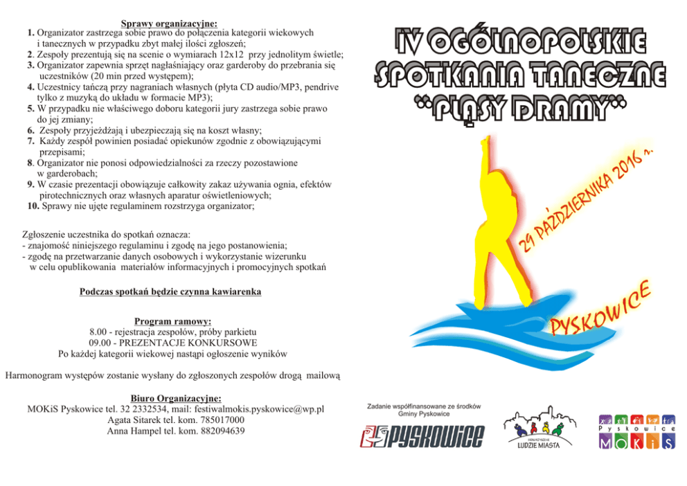 Sprawy organizacyjne: 1. Organizator zastrzega sobie prawo do po³¹czenia kategorii wiekowych i tanecznych w przypadku zbyt ma³ej iloœci zg³oszeñ; 2. Zespo³y prezentuj¹ siê na scenie o wymiarach 12x12 przy jednolitym œwietle; 3. Organizator zapewnia sprzêt nag³aœniaj¹cy oraz garderoby do przebrania siê uczestników (20 min przed wystêpem); 4. Uczestnicy tañcz¹ przy nagraniach w³asnych (p³yta CD audio/MP3, pendrive tylko z muzyk¹ do uk³adu w formacie MP3); 5. W przypadku nie w³aœciwego doboru kategorii jury zastrzega sobie prawo do jej zmiany; 6. Zespo³y przyje¿d¿aj¹ i ubezpieczaj¹ siê na koszt w³asny; 7. Ka¿dy zespó³ powinien posiadaæ opiekunów zgodnie z obowi¹zuj¹cymi przepisami; 8. Organizator nie ponosi odpowiedzialnoœci za rzeczy pozostawione w garderobach; 9. W czasie prezentacji obowi¹zuje ca³kowity zakaz u¿ywania ognia, efektów pirotechnicznych oraz w³asnych aparatur oœwietleniowych; 10. Sprawy nie ujête regulaminem rozstrzyga organizator; IV OGÓLNOPOLSKIE SPOTKANIA TANECZNE “PLASY DRAMY” IK N , ZIER ZD A P 9 2 Zg³oszenie uczestnika do spotkañ oznacza: - znajomoœæ niniejszego regulaminu i zgodê na jego postanowienia; - zgodê na przetwarzanie danych osobowych i wykorzystanie wizerunku w celu opublikowania materia³ów informacyjnych i promocyjnych spotkañ . r 16 0 A2 Podczas spotkañ bêdzie czynna kawiarenka PYS K O Program ramowy: 8.00 - rejestracja zespo³ów, próby parkietu 09.00 - PREZENTACJE KONKURSOWE Po ka¿dej kategorii wiekowej nast¹pi og³oszenie wyników Harmonogram wystêpów zostanie wys³any do zg³oszonych zespo³ów drog¹ mailow¹ Biuro Organizacyjne: MOKiS Pyskowice tel. 32 2332534, mail: [email protected] Agata Sitarek tel. kom. 785017000 Anna Hampel tel. kom. 882094639 Zadanie wspó³finansowane ze œrodków Gminy Pyskowice W E C I IV OGÓLNOPOLSKIE SPOTKANIA TANECZNE “PL¥SY DRAMY” Organizator: Stowarzyszenie Ludzie Miasta Miasto Pyskowice Miejski Oœrodek Kultury i Sportu w Pyskowicach Termin imprezy: 29 paŸdziernika 2016 r. (sobota) godz. 09.00 Hala Widowiskowo-Sportowa im. Huberta Wagnera w Pyskowicach ul. Strzelców Bytomskich 1a, Cele imprezy: - konfrontacja dorobku amatorskich zespo³ów tanecznych; - budowanie wzajemnego szacunku i tolerancji poprzez kszta³towanie umiejêtnoœci wspó³zawodnictwa; - rozwijanie wra¿liwoœci estetycznej; - wymiana pomys³ów i doœwiadczeñ w pracy z dzieciêcymi i m³odzie¿owymi zespo³ami tanecznymi; - ·integracja œrodowiska m³odzie¿y tañcz¹cej, prezentuj¹cej ró¿ne gatunki taneczne, otwarcie na odmiennoœæ i poszukiwania twórcze; Kategorie wiekowe i taneczne: - 7 - 11 lat - disco show, hip hop, miniatura taneczna - 12 -15 lat - disco show, hip hop, etiuda taneczna, inscenizacja taneczna - pow. 15 lat - show dance, hip hop, etiuda taneczna, teatr tañca Czas prezentacji do 4 min, teatry tañca do 8 min. O przydziale grupy do danej kategorii wiekowej decyduje wiek wiêkszoœci grupy etiuda taneczna to: prezentacja artystyczna o jednolitej formie i technice tanecznej inscenizacja taneczna to prezentacja artystyczna wybranego tematu posiadaj¹cego dramaturgiê przy u¿yciu ró¿nych technik tanecznych, kostiumów, rekwizytów oraz innych efektów scenicznych Zespó³ prezentuje jedn¹ choreografiê w wybranej kategorii tanecznej. Spotkania Taneczne nie obejmuj¹ zespo³ów ludowych, tañca towarzyskiego oraz zespo³ów akrobatycznych Warunki uczestnictwa: - wype³nione karty zg³oszenia nale¿y przes³aæ do dnia 18 paŸdziernika 2016 roku na adres: Miejski Oœrodek Kultury i Sportu ul. Wyszyñskiego 27, 44-120 Pyskowice tel/fax 32 233 25 34 e-mail: [email protected] - wpisowe w wysokoœci 50 z³ od prezentacji nale¿y wp³aciæ na konto: Stowarzyszenie Ludzie Miasta Bank Spó³dzielczy Pyskowice 45 8457 0008 2003 0088 0019 0001 do dnia 20 paŸdziernika 2016 r. Proszê o przes³anie potwierdzenia zap³aty: [email protected] WARUNKIEM UCZESTNICTWA I WPISANIA NA LISTÊ JEST UISZCZENIE OP£ATY ( liczy siê data zaksiêgowania œrodków na koncie organizatora) W przypadku rezygnacji z udzia³u w spotkaniach w terminie po 20 paŸdziernika 2016 wp³aconej akredytacji nie zwracamy!!! Kryteria oceny sêdziowskiej: Powo³ane przez organizatora jury ( specjaliœci zwi¹zani z tañcem, muzyk¹ i estrad¹) bêdzie braæ pod uwagê nastêpuj¹ce kryteria: dobór repertuaru, dobór muzyki, opracowanie choreograficzne, technikê wykonania, poczucie rytmu, bogactwo figur tanecznych, wartoœci wychowawcze, strój i wra¿enie estetyczne. Nagrody: Puchar dla zespo³u za zajêcie I, II lub III miejsca oraz wyró¿nienia; GRAND PRIX dla najlepszego zespo³u w danej kategorii wiekowej