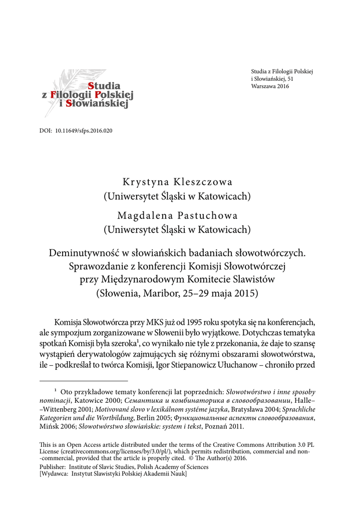 Studia z Filologii Polskiej i Słowiańskiej, 51 Warszawa 2016 DOI: 10.11649/sfps.2016.020 Kr y st y na K l eszc z ow a (Uniwersytet Śląski w Katowicach) Magd a l ena Pastu chow a (Uniwersytet Śląski w Katowicach) Deminutywność w słowiańskich badaniach słowotwórczych. Sprawozdanie z konferencji Komisji Słowotwórczej przy Międzynarodowym Komitecie Slawistów (Słowenia, Maribor, 25–29 maja 2015) Komisja Słowotwórcza przy MKS już od 1995 roku spotyka się na konferencjach, ale sympozjum zorganizowane w Słowenii było wyjątkowe. Dotychczas tematyka spotkań Komisji była szeroka1, co wynikało nie tyle z przekonania, że daje to szansę wystąpień derywatologów zajmujących się różnymi obszarami słowotwórstwa, ile – podkreślał to twórca Komisji, Igor Stiepanowicz Ułuchanow – chroniło przed 1 Oto przykładowe tematy konferencji lat poprzednich: Słowotwórstwo i inne sposoby nominacji, Katowice 2000; Ceмaнтикa и кoмбинaтoрикa в словообразовании, Halle– –Wittenberg 2001; Motivované slovo v lexikálnom systéme jazyka, Bratysława 2004; Sprachliche Kategorien und die Wortbildung, Berlin 2005; Функциональные аспекты словообразования, Mińsk 2006; Słowotwórstwo słowiańskie: system i tekst, Poznań 2011. This is an Open Access article distributed under the terms of the Creative Commons Attribution 3.0 PL License (creativecommons.org/licenses/by/3.0/pl/), which permits redistribution, commercial and non ‑commercial, provided that the article is properly cited. © The Author(s) 2016. Publisher: Institute of Slavic Studies, Polish Academy of Sciences [Wydawca: Instytut Slawistyki Polskiej Akademii Nauk] K. Kleszczowa, M. Pastuchowa Deminutywność w słowiańskich badaniach słowotwórczych… powtarzaniem tych samych treści. A jednak organizatorka Irena Stramljič Breznik zdecydowała się na monograficzne ukierunkowanie organizowanej przez siebie konferencji – zaproponowała temat spotkania: Manjšalnice v slovanskih jezikih: oblika in vloga (Deminutywa w słowiańskich językach: budowa i zastosowanie). Konferencja odbyła się w dniach 25–29 maja 2015 roku w Słowenii, na Uniwer sytecie w Mariborze. Jej efekty zostały już opublikowane w zbiorze Manjšalnice v slovanskih jezikih: oblika in vloga. Дeминyтивы в славянских языках: форма и роль / Diminutives in Slavic Languages: Form and Role2. Mimo że tematyka XVI posiedzenia wydawała się wąska, wachlarz porusza nych zagadnień był zadziwiająco szeroki w kwestiach zarówno teoretycznych, jak i materiałowych. Przede wszystkim skomplikowane okazało się zakreślenie słowotwórczej kategorii deminutywów. Wielu referentów poruszało kwestię istoty i zasięgu deminutywności. Ale i przytaczane dane empiryczne mogły zainteresować, zwłaszcza że Komisja Słowotwórcza wiąże przedstawicieli prawie wszystkich języków słowiańskich. Tym razem członkowie Komisji po raz pierwszy mieli okazję wysłuchać referatu o języku górnołużyckim: Anja Pohončowa (Budziszyn), Adjektiwiske diminutiwy w hornjoserbšćinje (Przymiotnikowe deminutywa w języku górnołużyckim). Konferencja rozpoczęła się wystąpieniem Аляксандрa Лукашанцa (Mińsk), który wygłosił referat pt. Асабовыя імёны-дэмінутывы у сучаснай беларускай мове: сістэма і функцыянаванне (Osobowe nazwy deminutywne w języku bia łoruskim: system i funkcjonowanie). Już ten pierwszy referat uświadomił uczest nikom, jak wielu faktów językowych dotyczy zjawisko deminutywności i na jak wielu poziomach języka się rozgrywa. Autor skoncentrował się na deminutywach osobowych, pokazując ich specyfikę na tle pozostałych typów deminutywnych. Przekonująco udowodnił, że charakteryzują się one polimotywacyjnością, dużą wariantywnością sufiksów oraz mają skłonność do desemantyzacji (mogą być na przykład używane również w dokumentach i sytuacjach oficjalnych). Najbardziej prototypowymi egzemplarzami kategorii deminutywności są rzeczowniki konkretne, które odnoszą się do mierzalnych obiektów – formant 2 Zbiór ten nie w pełni odpowiada konferencyjnym referatom Komisji Słowotwórczej MKS. Mieszczą się w nim również teksty osób, które zgłosiły referaty, a nie były w stanie przyjechać do Mariboru. Tom mieści też referaty równoległej, słoweńskiej konferencji na temat Mnogoobraznost, polifunkcijnost in vidiki prevodne ekvivalence manjšalnic v slovanskem jeziku. Część I, w której pomieszczone są referaty członków Komisji Słowotwórczej MKS, nosi tytuł: Mnogoobraznost, polifunkcijnost in protistavni vidik manjšalnic v slovanskih jezikih. 330 K. Kleszczowa, M. Pastuchowa Deminutywność w słowiańskich badaniach słowotwórczych… sygnalizuje małość w stosunku do normy mieszczącej się w podstawie słowotwór czej. Kłopot w tym, że nawet te derywaty krzyżują się z ekspresywami, z nazwami symilatywnymi, a także z kategorią nazw istot młodych. Цветанка Аврамова (Sofia) w referacie pt. Категорията деминутивност при съществителните имена в съвременния български език (Kategoria deminutywności rzeczowników we współczesnym języku bułgarskim) omawiała deminutywność rzeczowników we współczesnej bułgarszczyźnie, biorąc pod uwagę semantyczno-funkcjonalny punkt widzenia – wydzieliła deminutywa prawdziwe, deminutywa formalne oraz quasi-deminutywa. Jeśli chodzi o nazwy istot młodych, to w ogóle wyłączyła je z klasy deminutywów, widząc w nich odrębną kategorię słowotwórczą. Współczesny język czeskiej młodzieży pozyskany z korpusów był mate riałem dla Ivany Bozděchowej (Praga), która również zajęła się formacjami deminutywnymi o wartości ekspresywnej i oceniając