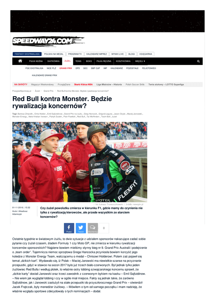 FANTASY EKSTRAKLASA POLSKA NA MEDAL PIŁKA NOŻNA ŻUŻEL PGE EKSTRALIGA NICE PLŻ ŻUŻEL GRAND PRIX KALENDARZ IMPREZ TENIS DPŚ BOKS SEC WYNIKI LIVE PIŁKA RĘCZNA SBP CUP IMP BLOGI KOSZYKÓWKA KALENDARZ KSIĘGARNIA WIĘCEJ ▼ POZOSTAŁE FELIETONIŚCI KALENDARZ GRAND PRIX GRAND PRIX NA SKRÓTY SIATKÓWKA PROGRAM TV Magazyn Weekendowy PrzegladSportowy.pl › Żużel › Grand Prix PrzegląDane › Skarb Kibica NBA Liga Mistrzów – Historia Polish Soccer Skills Red Bull kontra Monster. Będzie rywalizacja koncernów? Red Bull kontra Monster. Będzie rywalizacja koncernów? Tagi: Bartosz Zmarzlik , Chris Holder , Emil Sajfutdinow , Grand Prix na żużlu , Greg Hancock , Grigorij Łaguta , Jason Doyle , Maciej Janowski , Monster Energy , Niels Kristian Iversen , Patryk Dudek , Piotr Pawlicki , Red Bull , Tai Woffinden , Team Boll , żużel / fot. Łukasz Trzeszczkowski / źródło: newspix.pl 01-11-2016 | 15:32 Autor: Arkadiusz Adamczyk Czy żużel powolutku zmierza w kierunku F1, gdzie mamy do czynienia nie tylko z rywalizacją kierowców, ale przede wszystkim ze starciem koncernów? 0 Poleć Tweet Skomentuj Ostatnie tygodnie w światowym żużlu, to dwie sytuacje z udziałem sponsorów nakazujące zadać sobie pytanie czy żużel czasem, śladem Formuły 1 czy Moto GP, nie zmierza w kierunku rywalizacji koncernów sponsorskich? Najpierw bowiem mieliśmy słynny bieg nr 9. Grand Prix Australii i podejrzenie o „team order”. Tajemnicza niemoc sprzętowa Grega Hancocka przyniosła bowiem korzyść jego koledze z Monster Energy Team, walczącemu o medal – Chrisowi Holderowi. Potem zaś pojawił się temat „dzikich kart”. Wydawało się, iż Polak – Maciej Janowski ma niewielkie szanse na przyznanie przepustki, gdyż w stawce na sezon 2017 było już trzech biało-czerwonych. Był jednak tylko jeden żużlowiec Red Bulla i według plotek, to właśnie ostry lobbing szwajcarskiego koncernu sprawił, że „dzikie karty” dostali Janowski oraz trzeci zawodnik z czerwonym bykiem na kasku – Emil Sajfutdinow. – Nie wiem jak wyglądał lobbing i czy w ogóle miał miejsce. Fakty są jednak takie, że zarówno Sajfutdinow, jak i Janowski zasłużyli na stałe przepustki do przyszłorocznego Grand Prix – stwierdził Jacek Frątczak, były menedżer żużlowy. – Mówiłem o tym od samego początku i mam nadzieję, że właśnie względu sportowe zdecydowały o tych nominacjach – dodał. Tenis stołowy – LOTTO Superliga - Żużel rzeczywiście ewoluuje w kierunku F1, ale moim zdaniem pod względem rozwoju sprzętu. W rywalizację firm mógłby się zamienić tylko wówczas gdyby weszły do tego sportu duże koncerny związane z przemysłem motoryzacyjnym. Nie są jednak zainteresowane, gdyż to jest za małe środowisko, za mały rynek – ocenił Frątczak. Obecnie w speedwayu można mówić o kilku małych teamach. W przyszłorocznym Grand Prix Monster Energy reklamowali będą: mistrz świata – Greg Hancock, a także: Tai Woffinden i Chris Holder. Red Bull też będzie miał trzech przedstawicieli: Piotra Pawlickiego, Macieja Janowskiego, Emila Sajfutdinowa. Ambasadorem marki Boll był Niels Kristian Iversen, któremu prawdopodobnie towarzyszyli będą w tej roli: Patryk Dudek i Martin Vaculik. Czy któryś z koncernów skusi też Bartosza Zmarzlika? – Pewnie już kuszą. Wszystko jest kwestią pieniędzy. Rynek nie znosi próżni. Hancock wiecznie jeździł nie będzie, a Polak jest w tej chwili najzdolniejszym żużlowcem młodego pokolenia – powiedział Frątczak. RE KL A M A RE KL A M A Na prawdziwą rywalizację koncernów w najbliższych latach się jednak nie zanosi. – To za małe środowisko. Sponsorzy się pokrywają – ocenił były menedżer. Potwierdzeniem jego słów jest chociażby polityka firmy Nice. Jej twarzami są niby: Jason Doyle i Grigorij Łaguta, ale z dużą reklamą tej firmy na nodze jeździł w tym sezonie również Greg Hancock, a Piotr Pawlicki często paradował w czapeczce z tą nazwą. Na razie będzie więc po staremu, ale kto wie czy wymyślając Speedway Best Pairs firma One Sport nie wykazała się wizjonerskim myśleniem. Waszym zdaniem Czy w żużlowym Grand Prix w każdym kolejnym roku większe znaczenie będzie miała rywalizacja koncernów? Tak Nie Przeczytaj także Kto może wejść na stadion i zobaczyć Znamy kadrę Realu na Legię! Zidane nie mecz Legia – Real? zabrał do Warszawy dwóch gwiazd La Gazzetta dello Sport: Włoski klub Koźmiński: Ataki Kucharskiego na chce Krychowiaka. Może odejść z PSG Bońka to totalna prywata Co to są meningokoki? Mózg może chłonąć język jak gąbka już... dostarczone przez plista CO O TYM SĄDZISZ? WYPOWIEDZ SIĘ NA FORUM! Bądź pierwszy! Wyraź swoją opinię! Piłka nożna Sporty zimowe Piłkarze Realu Madryt już w Warszawie. Tłum kibiców przywitał Ronaldo Szwedzka rywalka wspiera Johaug. "Wiem, że mogę na nią liczyć " Piłkarze Realu Madryt wylądowali w Warszawie i są już Hotelu Bristol, gdzie będą czekać na środowe starcie z Legią Warszawa. Charlotte Kalla wierzy w wersje wydarzeń przedstawioną przez Therese Johaug. Szwedzka biegaczka pomaga Norweżce. 0 Dzieci obejrzą trening Realu! Władze Królewskich zgodziły się, aby ostatni trening ich drużyny był otwarty dla dzieci ćwiczących w Legia Soccer Schools. Rewolucja w naśnieżaniu stoków już w Polsce 1 Koszykówka Jeden z najlepszych strzelców w historii koszykówki kończy karierę Za pośrednictwem portalu „The Players Tribune” Ray Allen ogłosił decyzję o zakończeniu sportowej kariery. 0 1 Mistrz przegrał tylko walkowerem, więc jest najlepszy W Karpaczu ruszyła pierwsza w Polsce maszyna do sztucznego naśnieżania stoków, która działa niezależnie od temperatury. 0 Piłka ręczna Duże wzmocnienie Selgrosu Lublin 25-letnia reprezentantka Czarnogóry Ivana Bozovic została nową zawodniczką zespołu mistrzyń Polski piłkarek ręcznych MKS Selgrosu... Trener Talant Dujszeb