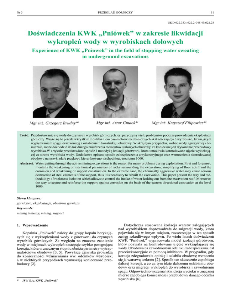 Nr 3 PRZEGLĄD GÓRNICZY 11 UKD 622.333: 622.2-045.43:622.28 Doświadczenia kwk „pniówek” w zakresie likwidacji wykropleń wody w wyrobiskach dołowych Experience of KWK „Pniowek” in the field of stopping water sweating in underground excavations Mgr inż. Grzegorz Brudny*) Mgr inż. Artur Gnutek*) Mgr inż. Krzysztof Filipowicz*) Treść: Przedostawanie się wody do czynnych wyrobisk górniczych jest przyczyną wielu problemów podczas prowadzenia eksploatacji górniczej. Wiąże się to przede wszystkim z osłabieniem parametrów mechanicznych skał otaczających wyrobisko, łatwiejszym wypiętrzaniem spągu oraz korozją i osłabieniem konstrukcji obudowy. W skrajnym przypadku, wobec wody agresywnej chemicznie, może dochodzić do tak dużego zniszczenia elementów stalowych obudowy, że konieczne jest wykonanie przebudowy wyrobiska.W artykule przedstawiono sposób i metodykę izolacji górotworu, która umożliwia kontrolowane ujęcie wyciekającej ze stropu wyrobiska wody. Dodatkowo opisano sposób zabezpieczenia antykorozyjnego oraz wzmocnienia skorodowanej obudowy na przykładzie przekopu kierunkowego wschodniego poziomu 1000. Abstract: Water getting through the active mining excavations is the reason for many problems during exploitation. First and foremost, it entails the weakening of mechanical parameters of rocks surrounding the excavation, simplifying of floor uplift and the corrosion and weakening of support construction. In the extreme case, the chemically aggressive water may cause serious destruction of steel elements of the support, thus it is necessary to rebuilt the excavation. This paper present the way and methodology of rockmass isolation which allows to control the intake of water leaking out from the excavation roof. Moreover, the way to secure and reinforce the support against corrosion on the basis of the eastern directional excavation at the level 1000. Słowa kluczowe: górnictwo, eksploatacja, obudowa górnicza Key words: mining industry, mining, support 1. Wprowadzenie Kopalnia „Pniówek” należy do grupy kopalń borykających się z wykropleniami wody z górotworu do czynnych wyrobisk górniczych. Ze względu na znaczne zasolenie wody w miejscach wykropleń następuje szybko postępująca korozja, która w znacznym stopniu obniża parametry wytrzymałościowe obudowy [3, 5]. Powyższe zjawiska prowadzą do konieczności wzmacniania ww. odcinków wyrobisk, a w niektórych przypadkach wymuszają konieczność przebudowy [2]. *) JSW S.A. KWK „Pniówek” Dotychczas stosowana izolacja warstw zalegających nad wyrobiskiem doprowadzała do migracji wody, która pojawiała się w innym miejscu, rozszerzając w ten sposób zasięg szkodliwego wpływu. Po wielu latach doświadczeń KWK "Pniówek” wypracowała model izolacji górotworu, który pozwala na kontrolowane ujęcie wykraplającej się wody. Obudowa na zawodnionym odcinku zabezpieczana jest przeciwkorozyjnie za pomocą inhibitora. W przypadku, gdy korozja zdegradowała opinkę i osłabiła obudowę wzmacnia się ją warstwą torkretu [2]. Sposób ten skutecznie zapobiega dalszej korozji, a co za tym idzie dalszemu osłabianiu obudowy oraz migracji wykropleń do wyrobiska i zawodnieniu spągu. Odpowiednio wczesna likwidacja wycieku w znacznej mierze zapobiega konieczności przebudowy danego odcinka wyrobiska [6]. 12 PRZEGLĄD GÓRNICZY 2. Warunki hydrogeologiczne w kwk „pniówek” Kopalnia „Pniówek” położona jest w południowej części Górnośląskiego Zagłębia Węglowego i należy do Jastrzębskiej Spółki Węglowej S.A.. Kopalnia gospodaruje obecnie dwoma złożami. Pierwsze z nich, złoże „Pniówek”, eksploatowane jest w różnym zakresie od początku istnienia kopalni. Drugie złoże, „Pawłowice 1” jest obecnie w fazie wstępnego zagospodarowywania. Powierzchnia złoża „Pniówek” w obrębie Obszaru Górniczego „Krzyżowice III” wynosi 28,5 km2, natomiast Obszar Górniczy „Pawłowice 1” to powierzchnia 15 km2. Analizując budowę geologiczną dokumentowanego obszaru można wydzielić trzy zasadnicze piętra wodonośne, związane z przepuszczalnymi utworami poszczególnych serii stratygraficznych [1]: – czwartorzędu, – trzeciorzędu, – karbonu. Piętra wodonośne czwartorzędu i trzeciorzędu związane są z nadkładem złoża, natomiast piętro wodonośne związane z przepuszczalnymi utworami serii złożowej karbonu ma zasadniczy wpływ na zawodnienie Kopalni. Utwory czwartorzędowe są zróżnicowane litologicznie. Osady plejstocenu pochodzenia rzeczno-lodowcowego, z którymi wiążą się poziomy wodonośne, wykształcone są jako piaski drobno i średnioziarniste. Utwory te najczęściej zalegają pod przykryciem glin pylastych, lokalnie zapiaszczonych o miąższości od kilku do kilkunastu metrów. Całkowita miąższość utworów czwartorzędowych waha się w granicach od ok. 5 m do ok. 80 m. Poziom ten występuje prawie na całym dokumentowanym obszarze. Na całym dokumentowanym obszarze zalegają ilaste utwory trzeciorzędu (neogenu). Poziomy wodonośne w obrębie tej serii związane są z wkładkami, laminami oraz przeławiceniami piasków drobnoziarnistych i pylastych występujących najczęściej w postaci soczewek lub warstw o niewielkim rozprzestrzenieniu poziomym. Miąższość wkładek przepuszczalnych nie przekracza na ogół 10÷20 m. Utwory trzeciorzędu mają sumaryczną miąższość od ok. 160 m do ok. 930 m. Spągowa część trzeciorzędu została rozpoznana otworami wiertniczymi, a także robotami górniczymi. Na kontakcie trzeciorzędu z karbonem stwierdzono występowanie gruboklastycznych utworów o znacznym zróżnicowaniu litologicznym. W trakcie wiercenia otworów dołowych wykonywanych w ostatniej dekadzie, które miały za zadanie rozpoznanie głębokości zalegania stropu karbonu, nie stwierdzono z niego dopływów wody. Poziomy wodonośne w obrębie utworów karbonu związane są z piaskowcami drobno i średnioz