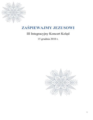 ZAŚPIEWAJMY JEZUSOWI III Integracyjny Koncert Kolęd 15 grudnia 2010 r. 1 Koncert rozpoczyna pastorałka „Dziś w stajence”w wykonaniu zespołu AKORD z SOSW w Tanowie (pianino, metalofon) Powitanie - KASIA Znowu minął rok. Już po raz trzeci spotykamy się w tym urokliwym kościółku Tanowie, aby w gronie przyjaciół kolędować. Witam wszystkich kolędników, którzy przybyli do nas z różnych placówek oświatowych powiatu polickiego oraz Szczecina. Przedstawicieli Starostwa Polickiego, p. Zygmunta Kołackiego, mieszkańców Tanowa. We wspólnym kolędowaniu udział wezmą: dzieci z Przedszkola Publicznego w Tanowie, dzieci z Przedszkola w Kołbaskowie, uczniowie Szkoły Podstawowej w Tanowie, uczniowie z Państwowej Szkoły Muzycznej I stopnia w Szczecinie, uczniowie z Zespołu Szkół w Przecławiu, oraz uczniowie z Ośrodka Szkolno-Wychowawczego w Tanowie, organizatorzy tego spotkania. Święta Bożego Narodzenia tuż, tuż. Niebawem spędzimy je w gronie rodzinnym. Postarajmy się dzisiaj przenieść tutaj namiastkę świątecznego nastroju, aby wśród przyjaciół przeżyć chwilę tego cudownego Bożonarodzeniowego nastroju miłości i radości. Wieczór wigilijny jest najbardziej uroczystym i wzruszającym wieczorem roku, wieczorem zadumy i refleksji. W Polsce wieczerza wigilijna rozpoczyna się, gdy na niebie ukazuje się pierwsza gwiazdka. Czyni się tak zapewne na pamiątkę gwiazdy betlejemskiej, którą ujrzeli Mędrcy, zwani też Trzema Królami. I Posłuchajmy pastorałki „Pierwsza gwiazdka” w wykonaniu zespołu AKORD z Ośrodka Szkolno-Wychowawczego w Tanowie. 2 Właśnie o kolędnikach mówi kolejna pastorałka „Gwiazda na kiju”. II Przed nami ponownie zespół AKORD. ELA To właśnie tego wieczoru, gdy mróz lśni jak gwiazda na dworze, Przy stołach są miejsca dla obcych, Bo nikt być samotny nie może... To właśnie tego wieczoru, od bardzo wielu wieków, Pod dachem tkliwej kolędy Bóg się rodzi w człowieku III W tym roku dołączyły do nas dzieci z Przedszkola w Kołbaskowie. Pod kierunkiem pań: Sylwii Kaźmierskiej i Beaty Figurskiej dzieci przygotowały przy piosenki związane ze Świętami Bożego Narodzenia: „Wieczór wigilijny” „Gore gwiazdka” „Mikołaj” IV Przedszkole Publiczne w Tanowie grupa 5 i 6-latków wraz z Panią Haliną Łukasiak. W wykonaniu małych artystów z Przedszkola w Tanowie usłyszymy 6 kolęd i piosenek bożonarodzeniowych: „Serce dla Jezusa”- w wykonaniu: Zosi i Zuzi, „Świąteczne aniołki kolędują” – w wykonaniu: Ani, Pauliny, Ani i Bruna, „Betlejemskiej gwiazdy blask” – w wykonaniu: Wiktorii, Natalii, Kacpra, Krzysia, Maksa, 3 „Chwała na wysokości” – w wykonaniu: Roksany, Kacpra, Kordiana, Igora, „Świąteczna cha-cha” – w wykonaniu: Weroniki, Natana, Ignacego, Konrada, „Dla kogo te dary” – w wykonaniu: Julii, Dawida, Mateusza, Karola KASIA Do szopy, hej pasterze, Do szopy, bo tam cud. Syn Boży w żłobie leży, by zbawić ludzki ród. Śpiewajcie aniołowie, Pasterze grajcie mu. Kłaniajcie się królowie, Nie budźcie go ze snu. V Przed nami uczniowie z Państwowej Szkoły Muzycznej I stopnia w Szczecinie. W ich wykonaniu usłyszymy najpopularniejsze polskie kolędy, a przy okazji poznamy kolejne instrumenty, na których zagrają młodzi artyści. Konrad Kujawski, saksofon „Dzisiaj w Betlejem”, „Tryumfy Króla Niebieskiego” Nauczyciel: Piotr Okrzyński Adam Głowacki, akordeon „Cicha noc” Nauczyciel: Janusz Pszeniczka Aleksander Jacoszek, trąbka „Lulajże Jezuniu”, „Anioł pasterzom mówił” Nauczyciel: Michał Koniarski 4 Duet fletowy: Olga Orłowska i Maria Sowińska, „Do szopy hej pasterze”, „Mędrcy Świata” Nauczyciel: Iwona Radin - Rutkowska Dziękujemy Panom: Piotrowi Okrzyńskiemu i Dariuszowi Podemskiemu, młodym artystom oraz ich nauczycielom za przygotowanie tak pięknego koncertu. ELA Zaśpiewajmy kolędę dla małego Jezusa Niech nas nuta świąteczna mocniej łączy i wzrusza. Przyjmij mały Jezu, dobry nasz Panie, Nasze czyste serca i nasze śpiewanie. Dziś dziękujemy Ci Jezu, żeś dla nas się narodził I żeś przez przyjście z nieba świat oswobodził. VI Jak co roku witamy uczniów ze Szkoły Podstawowej w Tanowie wraz z p.Dorotą Błaszczyk . W ich wykonaniu usłyszymy piękne tradycyjne polskie kolędy. „W żłobie leży” „Z narodzenia Pana” „Mędrcy Świata” VII Zespół Szkół z Przecławia wraz z p. Iwoną Wierzbicką. Tradycyjnie już p. Iwona przyjechała do nas z muzyczną niespodzianką. W tym roku usłyszymy wiązankę kolęd granych na instrumentach, których pewnie nie znacie, są to dzwonki ręczne. 5 Zakończenie Pożegnanie kolędników, wręczenie dyplomów i upominków. Kolęda „Jezusa narodzonego”- zespół AKORD Opracowała: Małgorzata Tyszkiewicz 6 7