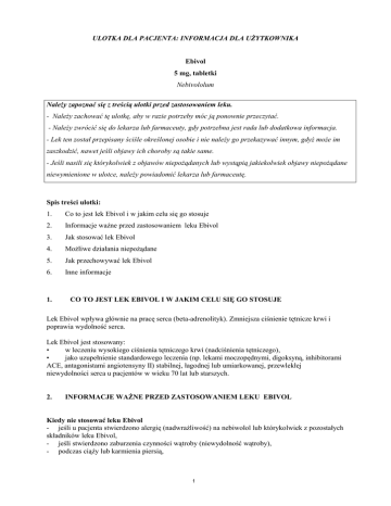 ULOTKA DLA PACJENTA: INFORMACJA DLA UŻYTKOWNIKA Ebivol 5 mg, tabletki Nebivololum Należy zapoznać się z treścią ulotki przed zastosowaniem leku. - Należy zachować tę ulotkę, aby w razie potrzeby móc ją ponownie przeczytać. - Należy zwrócić się do lekarza lub farmaceuty, gdy potrzebna jest rada lub dodatkowa informacja. - Lek ten został przepisany ściśle określonej osobie i nie należy go przekazywać innym, gdyż może im zaszkodzić, nawet jeśli objawy ich choroby są takie same. - Jeśli nasili się którykolwiek z objawów niepożądanych lub wystąpią jakiekolwiek objawy niepożądane niewymienione w ulotce, należy powiadomić lekarza lub farmaceutę. Spis treści ulotki: 1. Co to jest lek Ebivol i w jakim celu się go stosuje 2. Informacje ważne przed zastosowaniem leku Ebivol 3. Jak stosować lek Ebivol 4. Możliwe działania niepożądane 5. Jak przechowywać lek Ebivol 6. Inne informacje 1. CO TO JEST LEK EBIVOL I W JAKIM CELU SIĘ GO STOSUJE Lek Ebivol wpływa głównie na pracę serca (beta-adrenolityk). Zmniejsza ciśnienie tętnicze krwi i poprawia wydolność serca. Lek Ebivol jest stosowany: • w leczeniu wysokiego ciśnienia tętniczego krwi (nadciśnienia tętniczego), • jako uzupełnienie standardowego leczenia (np. lekami moczopędnymi, digoksyną, inhibitorami ACE, antagonistami angiotensyny II) stabilnej, łagodnej lub umiarkowanej, przewlekłej niewydolności serca u pacjentów w wieku 70 lat lub starszych. 2. INFORMACJE WAŻNE PRZED ZASTOSOWANIEM LEKU EBIVOL Kiedy nie stosować leku Ebivol - jeśli u pacjenta stwierdzono alergię (nadwrażliwość) na nebiwolol lub którykolwiek z pozostałych składników leku Ebivol, - jeśli stwierdzono zaburzenia czynności wątroby (niewydolność wątroby), - podczas ciąży lub karmienia piersią, 1 - w przypadku ostrej niewydolności serca, wstrząsu kardiogennego lub epizodów nasilenia niewydolności serca (niewyrównania), które wymagają dożylnego podawania leków o działaniu inotropowym dodatnim, - jeżeli stwierdzono zespół chorego węzła zatokowego (pewien rodzaj zaburzeń rytmu serca) włącznie z blokiem zatokowo-przedsionkowym, - jeśli występują pewne zaburzenia przewodzenia w sercu (blok serca II i III stopnia - blok przedsionkowo-komorowy (bez rozrusznika)), - u pacjentów ze skurczem oskrzeli lub astmą oskrzelową w wywiadzie, - jeśli u pacjenta występuje nieleczony guz nadnerczy (phaeochromocytoma), - w przypadku nadmiernej kwasowości krwi (kwasica metaboliczna), - jeśli czynność serca (tętno) w stanie spoczynku, przed rozpoczęciem leczenia, wynosiła mniej niż 60 uderzeń na minutę (bradykardia), - jeśli stwierdzono znacznie obniżone ciśnienie tętnicze krwi (ciśnienie skurczowe < 90 mm Hg), - w przypadku poważnych zaburzeń krążenia w kończynach. W przypadku wątpliwości należy skontaktować się z lekarzem. Kiedy zachować szczególną ostrożność stosując lek Ebivol - jeśli podczas leczenia nebiwololem wystąpi znacznie zwolnione tętno (mniej niż 50-55 uderzeń na minutę w spoczynku i (lub) objawy, takie jak zawroty głowy, osłabienie i niepewny chód); - w przypadku choroby serca (np. dusznica bolesna, choroba niedokrwienna serca, zaburzenia rytmu serca); u pacjentów z chorobą niedokrwienną serca leczenie powinno być przerywane stopniowo, przez ponad 1 - 2 tygodnie i, jeżeli jest to konieczne, należy w tym samym czasie zastosować inne leczenie; - jeżeli u pacjenta występują zaburzenia krążenia krwi w kończynach górnych lub dolnych; - jeśli stwierdzono przewlekłe zaburzenia oddychania, zwłaszcza przewlekłą obturacyjną chorobę płuc; - jeśli stwierdzono cukrzycę. Lek Ebivol nie wpływa na stężenie cukru we krwi, ale może maskować objawy małego stężenia cukru we krwi (nerwowość, drżenie, przyspieszone tętno). Jednakże lek Ebivol nie maskuje takiego objawu jak nadmierna potliwość. - jeśli u pacjenta występuje nadczynność tarczycy: możliwość maskowania przyspieszonej czynności serca (tachykardii) jako objawu choroby; nagłe przerwanie przyjmowania leku Ebivol może spowodować przyspieszenie czynności serca. - w przypadku alergii. Stosowanie leku Ebivol może nasilić reakcję na pyłki oraz inne alergeny. - w przypadku łuszczycy: pacjenci z czynną łuszczycą lub z łuszczycą w wywiadzie powinni stosować lek Ebivol tylko po dokładnej ocenie stosunku korzyści do ryzyka. - lek Ebivol może zmniejszać wydzielanie łez (informacja dla osób noszących soczewki kontaktowe). Dzieci i młodzież Nie prowadzono badań u dzieci i młodzieży. Z tego względu stosowanie u dzieci i młodzieży w wieku poniżej 18 lat nie jest zalecane. Pacjenci w podeszłym wieku U pacjentów w wieku powyżej 65 lat zaleca się stosowanie mniejszej dawki początkowej (patrz punkt „Jak stosować lek Ebivol”). U pacjentów w wieku powyżej 75 lat należy zachować szczególną ostrożność, a leczenie powinno odbywać się pod ścisłą kontrolą lekarza. Stosowanie leku Ebivol z innymi lekami Należy powiedzieć lekarzowi o wszystkich przyjmowanych ostatnio lekach również tych, które wydawane są bez recepty. Dotyczy to zwłaszcza: niektórych leków stosowanych w leczeniu zaburzeń rytmu serca (leki przeciwarytmiczne klasy I, takie jak chinidyna, hydrochinidyna, cybenzolina, flekainid, dizopiramid, meksyletyna, 2 - - - - - propafenon i lidokaina, jak również amiodaron), które mogą nasilać depresyjny wpływ leku Ebivol na czynność serca, jeżeli przyjmowane są w tym samym czasie. niektórych leków stosowanych w leczeniu nadciśnienia tętniczego i skurczu naczyń krwionośnych serca (leki nazywane antagonistami wapnia), które mogą nasilać działanie leku Ebivol (np. werapamil i diltiazem, lub amlodypina, felodypina, lacydypina, nifedypina, nikardypina, nimodypina i nitrendypina). innych leków przeciwnadciśnieniowych o działaniu ośrodkowym (klonidyna, guanfacyna, moksonidyna, metylodopa, rylmenidyna