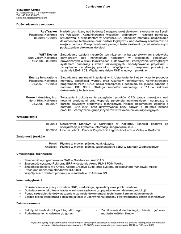Curriculum Vitae Sławomir Kortas ul. Rzeszowska 37, 54-030 Wrocław Tel: +48 795.455.033 [email protected] Doświadczenie zawodowe RayTracker Pasadena, Kalifornia 06.2010-12.2010 Nadzór techniczny nad budową 5 megawatowej elektrowni słonecznej na Sycylii we Włoszech. Komunikowanie wszelkich problemów i rezolucji pomiedzy wykonawcą, a projektantem w Kalifornii/USA. Inspekcja montażu, uzupełnianie dokumentacji technicznej oraz nadzór logistyczny nad dostawą kontenerów na miejsce budowy. Przeprowadzenie pełnego testu elektroniki przed ostatecznym podłączeniem elektrowni do sieci. WET Design Sun Valley, Kalifornia 10.2008 – 03.2010 Zarządzanie działem rysunków technicznych w bardzo aktywnym środowisku inżynierskim pod minimalnym nadzorem w projektach globalnych, prowadzonych w wielu lokalizacjach. Ustanowienie i zarządzanie wewnętrznym systemem numeracji i zmian inżynieryjnych. Koordynowanie projektami i zarządzanie certyfikacją produktu. Współpraca z zespołem produkcji w systemie LEAN i 5S. Wspieranie działu R&D w nowych projektach. Energy Innovations Pasadena, Kalifornia 06.2007 – 10.2008 Zarządzanie zmianami inżynieryjnymi. Ustanowienie i utrzymywanie procedur montażu, specifikacji wyrobu oraz rysunków technicznych. Administrowanie programami PLM i CAD. Ścisła współpraca z zespołem ds. jakości zgodnie z normami ISO 9001. Obsługa zespołów marketingu i PR w zakresie dokumentacji technicznej. Moore Industries, Inc. North Hills, Kalifornia 05.2005 – 06.2007 Tworzenie i dokonywanie przeglądu rysunków CAD, praca rozwojowa nad nowymi produktami oraz wsparcie personelu inżynierskiego i sprzedaży w bardzo aktywnym środowisku technicznym. Nadzór dokumentów zgodnie z normami ISO 9001 oraz utrzymywanie bazy danych z 40-letnią historią produktu. Zarządzanie grupą inżynierów w zakresie zmian inżynieryjnych. Wykształcenie 06.2004 06.2000 Uniwersytet Stanowy w Northridge w Kalifornii, licencjat geografi specjalizacją w Systemie Informacji Geograficznej (GIS) Liceum John H. Francis Polytechnic High School w Sun Valley w Kalifornii ze Znajomość języków Polski Angielski Płynnie w mowie i piśmie, język ojczysty Płynnie w mowie i piśmie, szesnastoletni pobyt w Stanach Zjednoczonych Umiejętności techniczne • • • • • Znajomość oprogramowania CAD w Solidworks i AutoCAD Znajomość systemu PLM oraz ERP w systemie Arena PLM i PDM Works Znajomość pakietu MS Office, Adobe Creative Suite, oraz systemu operacyjnego Windows i Apple Praca pod nadzorem standartów ISO9001 Współpraca z działem produkcji w standardzie LEAN oraz 5S Inne umiejętności • • • • Doświadczenie w pracy z działem R&D, marketingu, sprzedaży oraz public relations Doświadczenie jako team leader w mikrozarządzaniu grupą inżynierów i działem produkcji Ponad sześcioletnie doświadczenie w zakresie dokumentacji technicznej i zmian inżynieryjnych Bardzo bliska współpraca z działem jakości w usprawnianiu procesu i wprowadzaniu zmian technicznych Zainteresowania • • Założyciel i redaktor bloga fotograficznego Podróżowanie i chodzenie po górach • Zamiłowanie do technologii, robienia zdjęć oraz montażu krótkich filmów Wyrażam zgodę na przetwarzanie moich danych osobowych zawartych w mojej ofercie dla potrzeb niezbędnych do realizacji procesu rekrutacji (zgodnie z ustawą z 29.08.97r. o ochronie danych osobowych, DZ.U. nr 133, poz.833)