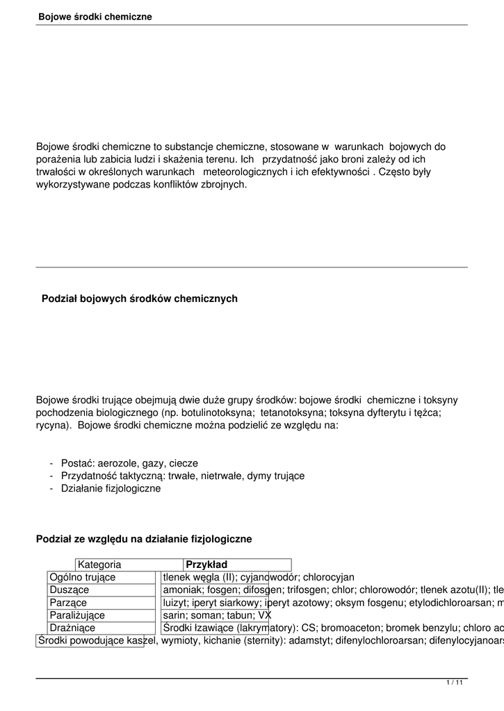 Bojowe środki chemiczne Bojowe środki chemiczne to substancje chemiczne, stosowane w warunkach bojowych do porażenia lub zabicia ludzi i skażenia terenu. Ich przydatność jako broni zależy od ich trwałości w określonych warunkach meteorologicznych i ich efektywności . Często były wykorzystywane podczas konfliktów zbrojnych. Podział bojowych środków chemicznych Bojowe środki trujące obejmują dwie duże grupy środków: bojowe środki chemiczne i toksyny pochodzenia biologicznego (np. botulinotoksyna; tetanotoksyna; toksyna dyfterytu i tężca; rycyna). Bojowe środki chemiczne można podzielić ze względu na: - Postać: aerozole, gazy, ciecze - Przydatność taktyczną: trwałe, nietrwałe, dymy trujące - Działanie fizjologiczne Podział ze względu na działanie fizjologiczne Kategoria Przykład Ogólno trujące tlenek węgla (II); cyjanowodór; chlorocyjan Duszące amoniak; fosgen; difosgen; trifosgen; chlor; chlorowodór; tlenek azotu(II); tle Parzące luizyt; iperyt siarkowy; iperyt azotowy; oksym fosgenu; etylodichloroarsan; m Paraliżujące sarin; soman; tabun; VX Drażniące Środki łzawiące (lakrymatory): CS; bromoaceton; bromek benzylu; chloro ac Środki powodujące kaszel, wymioty, kichanie (sternity): adamstyt; difenylochloroarsan; difenylocyjanoars 1 / 11 Bojowe środki chemiczne Psychotoksyczne LSD; fentanyl; opioidy; THC Fitotoksyczne - działającekwas niszcząco 2,4-fenoksyoctowy na rośliny (2,4-D); kwas 2,4,5-triochlorofenoksyoctowy (2,4,5LCt50 - Stężenie par/aerozolu środka trującego działającego w określonym czasie powodującego śmierć 50% populacji Przydatność bojowych środków chemicznych jako broni zależy od ich trwałości w określonych warunkach meteorologicznych oraz ich efektywności Substancje trwałe mogą się utrzymywać w środowisku przez wiele godzin, dni a nawet miesięcy. Substancje nietrwałe utrzymują się w środowisku do kilkudziesięciu minut. Przez efektywność środka trującego rozumie się jego zdolność do wywołania maksymalnych strat liczebnych wroga, przy możliwie najmniejszej użytej ilości tego środka. Pojęcie efektywności jest dość szerokie i zależne od wielu konkretnych właściwości, np. toksyczności, właściwości drażniących, lotności etc. Długość działania wybranych bojowych środków chemicznych Środek Czas działania w 15°C 3 dni VX Tabun 1 dzień Iperyt 1 dzień 5 2 / 11 Bojowe środki chemiczne Czas działania w -10°C 8 dni 4 dni 4 dni 2 Charakterystyka wybranych bojowych środków chemicznych Substancje paraliżujące Substancje paraliżujące, będące estrami kwasów fosforoorganicznych, dzieli się na dwie grupy. - Substancje grupy G (ang. Germany – Niemcy) ze względu na miejsce otrzymania: sarin, cyklosarin, soman, tabun - Substancje grupy V (ang. Very persistent – bardzo trwały) np. VX, V-gaz 3 / 11 Bojowe środki chemiczne Substancje te stosuje się w postaci zawiesiny w powietrzu, dzięki czemu są tak samo efektywne jak gazy, a jednocześnie łatwiejsze do przechowywania i rozprowadzania na danym terenie. Substancje paraliżujące są rozpuszczalne zarówno w wodzie jak i w tłuszczach, przez co łatwo się absorbują (wnikają do organizmu) przez skórę oraz błony śluzowe dróg oddechowych i oczu. Ich działanie polega na wiązaniu się, a następnie blokowaniu enzymu cholinoesterazy odpowiedzialnej za układ acetylocholiny jednego z neurotransmiterów (substancji odpowiedzialnych za przesyłanie impulsów elektrycznych między neuronami). Stały wzrost stężenia acetylocholiny powoduje ustawiczne pobudzenie, a w końcu porażenie nerwów, a tym samym mięśni i organów, prowadząc w efekcie do śmierci przez uduszenie (porażenie mięśni układu oddechowego i mięśnia serca). Śmierć jest poprzedzona silnym bólem głowy, oczu i brzucha, zaburzeniami widzenia, konwulsjami, wymiotami, biegunką poceniem się, nie utrzymywaniem moczu i kału, gwałtownymi zmianami ciśnienia krwi i tętna, utratą przytomności. Czas występowania objawów działania środka toksycznego oraz ich natężenie zależą od formy występowania środka i sposobu jego wchłonięcia. Po kontakcie z parami objawy występują natychmiast, natomiast po kontakcie z cieczą – po okresie bezobjawowym wynoszą od kilku minut do kilkunastu godzin. Śmierć następuje po okresie do 15 minut po kontakcie z sarinem, somanem i tabunem, natomiast 4-42 godzin po kontakcie z VX. Dawka śmiertelna dla substancji w stanie gazowym jest znacznie wyższa niż cieczy działających po kontakcie ze skórą. Dawki śmiertelne substancji paraliżujących Substancja Tabun Sarin Soman VX LCt 400 100 50 10 50 (mg · min · m 1000 1700 100 10 LD50 - Dawka śmiertelna środka (czyli dawka powodującą śmierć 50% populacji poddanej jej działaniu) Dopuszczalne stężenie środków paraliżujących na stanowisku pracy wynosi 0,003μg/m3. Antidotum na substancje paraliżujące stanowią atropina (występuje w bieluniu i wilczej 4 / 11 3 Bojowe środki chemiczne jagodzie) i pralidoksym (2-PAM), których działanie jest wspomagane m.in. przez diazepam. Zwykle są podawane do mięśniowo (w ramię lub udo), jednak w przypadku kontaktu ze środkami paraliżującymi w formie gazowej atropinę podaje się w postaci zastrzyku prosto w serce. Teren i przedmioty skażone środkami paraliżującymi poddaje się dekontaminacji (terminem oznacza się proces polegający na usunięciu lub zneutralizowaniu substancji toksycznej) za pomocą NaOH, NaCl, Ca(OCl)2, alkoholanów, Na2CO3, H2O2 czy Na2O2. Przewożenie zbiorników lub pocisków z substancjami paraliżującymi jest bardzo niebezpieczne, dlatego też w latach 60-tych opracowano pociski binarne, zawierające dwa pojemniki z relatywnie nietoksycznymi substratami, które podczas lotu pocisku ulegają zmieszaniu, tworząc środek paraliżujący. Obecnie pociski binarne zawierają substraty do otrzymania sarinu, somanu i VX Otrzymywanie substancji paraliżują