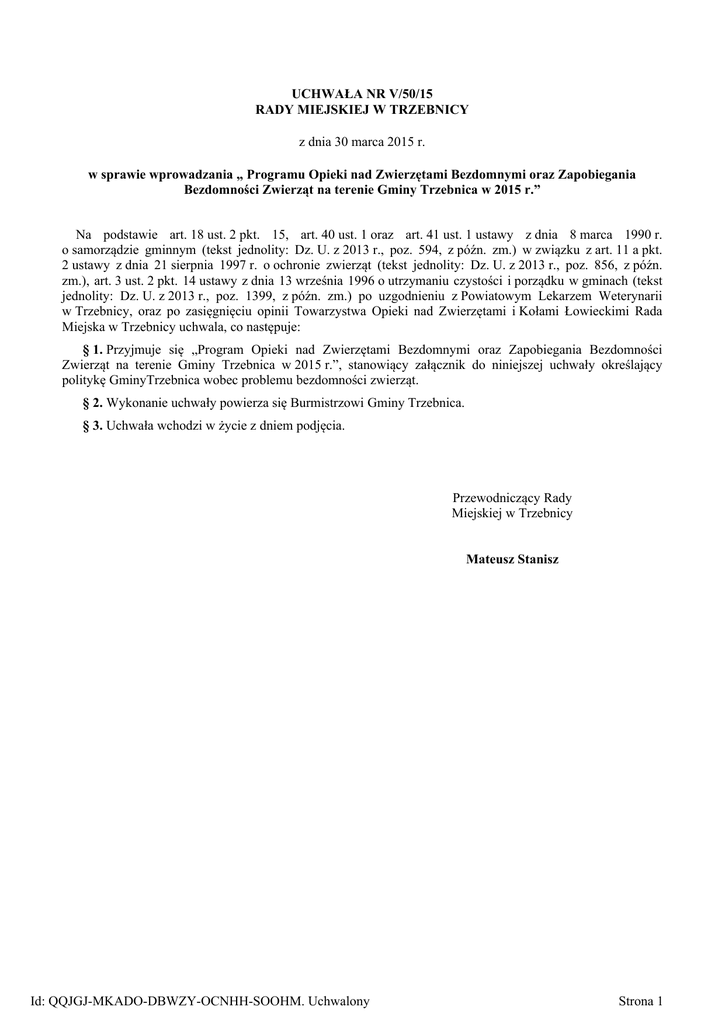 UCHWAŁA NR V/50/15 RADY MIEJSKIEJ W TRZEBNICY z dnia 30 marca 2015 r. w sprawie wprowadzania „ Programu Opieki nad Zwierzętami Bezdomnymi oraz Zapobiegania Bezdomności Zwierząt na terenie Gminy Trzebnica w 2015 r.” Na podstawie art. 18 ust. 2 pkt. 15, art. 40 ust. 1 oraz art. 41 ust. 1 ustawy z dnia 8 marca 1990 r. o samorządzie gminnym (tekst jednolity: Dz. U. z 2013 r., poz. 594, z późn. zm.) w związku z art. 11 a pkt. 2 ustawy z dnia 21 sierpnia 1997 r. o ochronie zwierząt (tekst jednolity: Dz. U. z 2013 r., poz. 856, z późn. zm.), art. 3 ust. 2 pkt. 14 ustawy z dnia 13 września 1996 o utrzymaniu czystości i porządku w gminach (tekst jednolity: Dz. U. z 2013 r., poz. 1399, z późn. zm.) po uzgodnieniu z Powiatowym Lekarzem Weterynarii w Trzebnicy, oraz po zasięgnięciu opinii Towarzystwa Opieki nad Zwierzętami i Kołami Łowieckimi Rada Miejska w Trzebnicy uchwala, co następuje: § 1. Przyjmuje się „Program Opieki nad Zwierzętami Bezdomnymi oraz Zapobiegania Bezdomności Zwierząt na terenie Gminy Trzebnica w 2015 r.”, stanowiący załącznik do niniejszej uchwały określający politykę GminyTrzebnica wobec problemu bezdomności zwierząt. § 2. Wykonanie uchwały powierza się Burmistrzowi Gminy Trzebnica. § 3. Uchwała wchodzi w życie z dniem podjęcia. Przewodniczący Rady Miejskiej w Trzebnicy Mateusz Stanisz Id: QQJGJ-MKADO-DBWZY-OCNHH-SOOHM. Uchwalony Strona 1 Załącznik do Uchwały Nr V/50/15 Rady Miejskiej w Trzebnicy z dnia 30 marca 2015 r. „Program Opieki nad Zwierzętami Bezdomnymi oraz Zapobiegania Bezdomności Zwierząt na terenie Gminy Trzebnica w 2015 r.” § 1. Celami Programu są: 1) zapewnienie opieki nad zwierzętami bezdomnymi w rozumieniu art. 4 pkt. 16 ustawy o ochronie zwierząt, 2) zapobieganie bezdomności zwierząt, 3) edukacja mieszkańców Gminy Trzebnica w zakresie humanitarnego traktowania zwierząt. § 2. 1. Wykonawcami Programu są : 1) Gmina Trzebnica, 2) Schronisko dla Zwierząt (Schronisko dla Bezdomnych Zwierząt w Ruścu k/Węgrowca, Rusiec 15, 62-120 Wapno, prowadzonym przez Fundację "Radośc Psiaka" na podstawie umowy podpisanej z Gminą Trzebnica oraz innym Schroniskiem z którym Gmina Trzebnica będzie miała podpisaną umowę), 3) Straż Miejska, Policja, organizacje społeczne, stowarzyszenia, fundacje, których statusowym celem działania jest przeciwdziałanie bezdomności zwierząt we współpracy z organami gminy oraz przedsiębiorca, którego przedmiot działalności gospodarczej obejmuje wyłapywanie bezdomnych zwierząt. 2. Funkcję koordynatora działań podejmowanych w ramach Programu pełni Wydział Rolnictwa i Ochrony Środowiska Urzędu Miejskiego przy pomocy pracowników tego Wydziału, współpracującym w tym zakresie z organizacjami Inspekcji Weterynaryjnej i lekarzami weterynarii. § 3. Zadanie polegające na zapewnieniu bezdomnym zwierzętom domowym miejsca w schronisku dla zwierząt, gmina realizuje poprzez umieszczanie bezdomnych zwierząt domowych w schroniskach prowadzonych przez organizacje społeczne lub jednostki samorządu terytorialnego na podstawie umów podpisanych przez Gminę z tymi podmiotami. § 4. Opieka nad kotami wolno żyjącymi realizowana jest przez: 1. ustalenie miejsc w których przebywają koty, 2. szukanie społecznych opiekunów, którzy zajmą się dokarmianiem wolno żyjących kotów oraz zapewnią tygodniową opiekę kotom wolno żyjącym, które zostały poddane zabiegom sterylizacji, 3. w miarę możliwości zapewnienie miejsca schronienia, w szczególności na okres zimowy, 4. każdy karmiciel, który zgłosi bytowanie bezdomnych kotów na terenie Gminy Trzebnica, będzie miał możliwość poddaniu zabiegowi sterylizacji kotek u lekarzy weterynarii z którymi Gmina Trzebnica ma podpisane umowy. § 5. 1. Na terenie Gminy Trzebnica wprowadza się wyłapywanie bezdomnych zwierząt: 1) stałe na interwencję, 2) okresowe po wcześniejszym ogłoszeniu. 2. Wyłapaniem będą objęte bezdomne zwierzęta pozostawione bez opieki, w stosunku, do których nie istnieje możliwość ustalenia ich właściciela lub innej osoby, pod której opieką dotychczas pozostały, a w szczególności chore lub zagrażające życiu, zdrowiu i bezpieczeństwu ludzi. Id: QQJGJ-MKADO-DBWZY-OCNHH-SOOHM. Uchwalony Strona 1 3. Celem zapewnienia dalszej opieki nad bezdomnymi zwierzętami Gmina Trzebnica ma podpisaną umowę z podmiotem prowadzącym działalność w tym zakresie. 4. Odławianie bezdomnych zwierząt będzie prowadzone wyłącznie przy użyciu specjalistycznego sprzętu przeznaczonego do wyłapywania zwierząt, który nie stwarza zagrożenia dla życia i zdrowia zwierząt, a także nie będzie zadawał im cierpienia. 5. Informacje o akcji wyłapania bezdomnych zwierząt podawane będą do publicznej wiadomości poprzez ogłoszenie na tablicy ogłoszeń, stronie internetowej www.eko.trzebnica.pl, oraz za pośrednictwem sołtysów. 6. Transport bezdomnych zwierząt będzie odbywał się środkiem transportu przystosowanym do bezpiecznego i humanitarnego przewozu zwierząt. § 6. 1. Gmina Trzebnica realizuje obligatoryjną sterylizację i kastrację zwierząt w schroniskach dla zwierząt na zasadach ustalonych z jednostką prowadzącą schronisko. 2. Zabiegi sterylizacji i kastracji mogą być przeprowadzone wyłącznie przez lekarza weterynarii. 3. Zabiegom, o których mowa w ust. 1, nie podlegają zwierzęta w okresie 14 dni od umieszczenia z uwagi na możliwość zgłaszania się właściciela lub opiekuna, oraz przeznaczone do adopcji w terminie określonym w poszukiwaniu nowych właścicieli. § 7. Poszukiwanie właścicieli dla bezdomnych zwierząt realizowane jest przez: 1. Informowanie o możliwości adopcji zwierząt bezdomnych w sposób zwyczajowo przyjęty na terenie Gminy w tym na stronach internetowych. 2. Współdziałanie z organizacjami społecznymi w zakresie poszukiwania nowych właścicieli dla zwierząt. § 8. Usypianie ślepych miotów: 1. Usypianie ślepyc