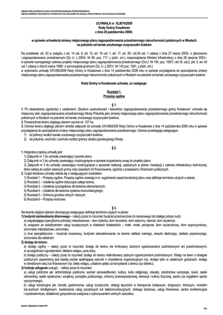 ZMIANA MIEJSCOWEGO PLANU ZAGOSPODAROWANIA PRZESTRZENNEGO NIERUCHOMOŚCI POŁOśONYCH W MOSTACH NA POŁUDNIE OD KANAŁU ZRZUTOWEGO OCZYSZCZALNI ŚCIEKÓW UCHWAŁA nr XLIII/74/2009 Rady Gminy Kosakowo z dnia 28 października 2009r. w sprawie uchwalenia zmiany miejscowego planu zagospodarowania przestrzennego nieruchomości połoŜonych w Mostach na południe od kanału zrzutowego oczyszczalni ścieków Na podstawie: art. 20 w związku z art. 14 ust. 8, art. 15, art. 16 ust. 1, art. 17, art. 29 i art.34 ust. 1 ustawy z dnia 27 marca 2003r. o planowaniu i zagospodarowaniu przestrzennym (Dz. U. z 2003r. Nr 80, poz. 717, z późn. zm.), rozporządzenia Ministra Infrastruktury z dnia 26 sierpnia 2003 r. w sprawie wymaganego zakresu projektu miejscowego planu zagospodarowania przestrzennego (Dz.U. Nr 164, poz. 1587) i art.18, ust.2, pkt. 5, art. 40 ust.1 ustawy z dnia 8 marca 1990r. o samorządzie gminnym (Dz. U. z 2001r. Nr 142 poz. 1591, z późn. zm.) w wykonaniu uchwały XXV/86/2008 Rady Gminy w Kosakowie z dnia 14 października 2008 roku w sprawie przystąpienia do sporządzenia zmiany miejscowego planu zagospodarowania przestrzennego nieruchomości połoŜonych w Mostach na południe od kanału zrzutowego oczyszczalni ścieków Rada Gminy w Kosakowie uchwala, co następuje: Rozdział 1. Przepisy ogólne § 1. 1. Po stwierdzeniu zgodności z ustaleniami „Studium uwarunkowań i kierunków zagospodarowania przestrzennego gminy Kosakowo” uchwala się miejscowy plan zagospodarowania przestrzennego Mosty Południe jako zmianę miejscowego planu zagospodarowania przestrzennego nieruchomości połoŜonych w Mostach na południe od kanału zrzutowego oczyszczalni ścieków, 2. Powierzchnia terenu objętego planem wynosi ok. 137 ha. 3. Granice terenu objętego planem określa załącznik do uchwały XXV/86/2008 Rady Gminy w Kosakowie z dnia 14 października 2008 roku w sprawie przystąpienia do sporządzenia zmiany miejscowego planu zagospodarowania przestrzennego. Granice przebiegają następująco: 1) od północy wzdłuŜ kanału zrzutowego oczyszczalni ścieków; 2) od południa, wschodu i zachodu wzdłuŜ granicy obrębu geodezyjnego Mosty. § 2. 1. Integralną częścią uchwały jest: 1) Załącznik nr 1 do uchwały zawierający rysunek planu. 2) Załącznik nr 2 do uchwały zawierający rozstrzygnięcie w sprawie rozpatrzenia uwag do projektu planu. 3) Załącznik nr 3 do uchwały zawierający rozstrzygnięcie o sposobie realizacji, zapisanych w planie, inwestycji z zakresu infrastruktury technicznej, które naleŜą do zadań własnych gminy oraz zasadach ich finansowania, zgodnie z przepisami o finansach publicznych. 2. Część tekstowa uchwały składa się z następujących rozdziałów: 1) Rozdział 1 – Przepisy ogólne. Przepisy ogólne zwierają m.in. wyjaśnienie zasad konstrukcji planu oraz definicje terminów uŜytych w planie; 2) Rozdział 2 – Ustalenia ogólne dotyczące całego terenu; 3) Rozdział 3 – Ustalenia szczegółowe dla terenów elementarnych; 4) Rozdział 4 – Ustalenia dla terenów systemu komunikacyjnego; 5) Rozdział 5 – Ochrona gruntów rolnych i leśnych; 6) Rozdział 6 – Przepisy końcowe. § 3. Na terenie objętym planem obowiązują następujące definicje terminów uŜytych w planie: 1) budynki zamieszkania zbiorowego – naleŜy przez to rozumieć budynki przeznaczone do okresowego lub stałego pobytu ludzi: a) zaspakajające specyficzne potrzeby mieszkaniowe – dom dziecka, dom rencistów, dom zakonny, internat, dom studencki, b) związane ze świadczeniem usług turystycznych w obiektach hotelarskich – hotel, motel, pensjonat, dom wycieczkowy, dom wypoczynkowy, schronisko młodzieŜowe, schronisko, c) inne specjalistyczne – budynek koszarowy, budynek zakwaterowania na terenie zakładu karnego, aresztu śledczego, zakładu poprawczego, schroniska dla nieletnich; 2) dostęp do terenu: a) dostęp ogólny – naleŜy przez to rozumieć dostęp do terenu nie limitowany Ŝadnymi ograniczeniami podmiotowymi ani przedmiotowymi, w szczególności ogrodzeniami, biletami wstępu, porą doby, b) dostęp publiczny – naleŜy przez to rozumieć dostęp do terenu nielimitowany Ŝadnymi ograniczeniami podmiotowymi. Wstęp na teren o dostępie publicznym zapewniony jest kaŜdej osobie spełniającej warunki o charakterze organizacyjnym (np. dostęp tylko w ustalonych godzinach, dostęp w określonym celu) lub finansowym (np. bilety wstępu, ustalone opłaty za korzystanie z terenu czy obiektu); 3) funkcje usługowe (usługi) – naleŜy przez to rozumieć: a) usługi publiczne jak: administracja publiczna, wymiar sprawiedliwości, kultury, kultu religijnego, oświaty, szkolnictwa wyŜszego, nauki, opieki zdrowotnej, opieki społecznej i socjalnej, porządku publicznego, ochrony przeciwpoŜarowej, rekreacji i kultury fizycznej, sportu (za wyjątkiem sportu wyczynowego), b) usługi komercyjne jak: handel, gastronomia, usługi turystyczne, obsługi łączności w transporcie kolejowym, drogowym, lotniczym, morskim lub wodnym śródlądowym, świadczenia usług pocztowych lub telekomunikacyjnych, obsługa bankowa, usługi finansowe, centra konferencyjne i wystawiennicze, działalność gospodarcza związana z wykonywaniem wolnych zawodów, BIURO URBANISTYCZNE PPP 1/62 ZMIANA MIEJSCOWEGO PLANU ZAGOSPODAROWANIA PRZESTRZENNEGO NIERUCHOMOŚCI POŁOśONYCH W MOSTACH NA POŁUDNIE OD KANAŁU ZRZUTOWEGO OCZYSZCZALNI ŚCIEKÓW c) rzemiosło usługowe – rozumiane jako działalność usługowa a nie produkcyjna, jak np. szewc, krawiec, fryzjer, zakład naprawy sprzętu RTV, tapicer, itp. oraz inna działalność usługowa na zbliŜonej zasadzie do wymienionych powyŜej, niepowodująca ponadnormatywnych zanieczyszczeń środowiska, jak równieŜ powstawania odorów i niezorganizowanej emisji zanieczyszczeń, oraz inna działalność usługowa na zbliŜonej zasadzie do wymienionych powyŜej; 4) funkcje usług turystycznych (usługi turystyczne) – naleŜy przez to 