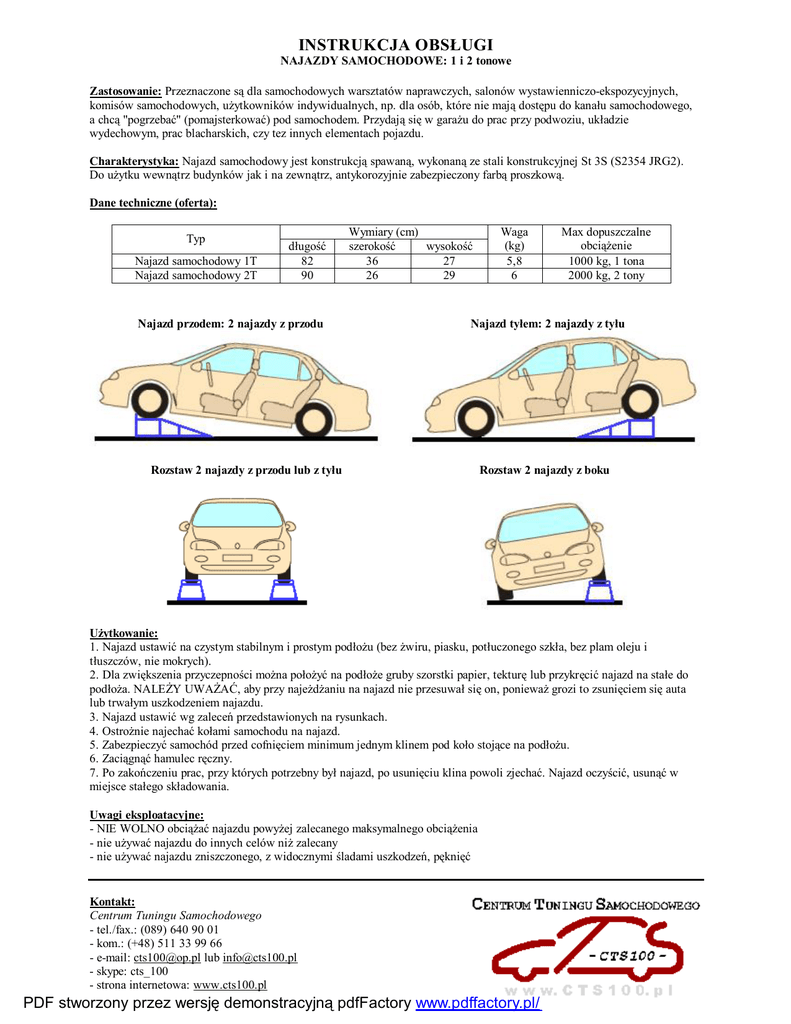 INSTRUKCJA OBSŁUGI NAJAZDY SAMOCHODOWE: 1 i 2 tonowe Zastosowanie: Przeznaczone są dla samochodowych warsztatów naprawczych, salonów wystawienniczo-ekspozycyjnych, komisów samochodowych, użytkowników indywidualnych, np. dla osób, które nie mają dostępu do kanału samochodowego, a chcą "pogrzebać" (pomajsterkować) pod samochodem. Przydają się w garażu do prac przy podwoziu, układzie wydechowym, prac blacharskich, czy tez innych elementach pojazdu. Charakterystyka: Najazd samochodowy jest konstrukcją spawaną, wykonaną ze stali konstrukcyjnej St 3S (S2354 JRG2). Do użytku wewnątrz budynków jak i na zewnątrz, antykorozyjnie zabezpieczony farbą proszkową. Dane techniczne (oferta): Typ Najazd samochodowy 1T Najazd samochodowy 2T długość 82 90 Najazd przodem: 2 najazdy z przodu Wymiary (cm) szerokość wysokość 36 27 26 29 Waga (kg) 5,8 6 Max dopuszczalne obciążenie 1000 kg, 1 tona 2000 kg, 2 tony Najazd tyłem: 2 najazdy z tyłu Rozstaw 2 najazdy z przodu lub z tyłu Rozstaw 2 najazdy z boku Użytkowanie: 1. Najazd ustawić na czystym stabilnym i prostym podłożu (bez żwiru, piasku, potłuczonego szkła, bez plam oleju i tłuszczów, nie mokrych). 2. Dla zwiększenia przyczepności można położyć na podłoże gruby szorstki papier, tekturę lub przykręcić najazd na stałe do podłoża. NALEŻY UWAŻAĆ, aby przy najeżdżaniu na najazd nie przesuwał się on, ponieważ grozi to zsunięciem się auta lub trwałym uszkodzeniem najazdu. 3. Najazd ustawić wg zaleceń przedstawionych na rysunkach. 4. Ostrożnie najechać kołami samochodu na najazd. 5. Zabezpieczyć samochód przed cofnięciem minimum jednym klinem pod koło stojące na podłożu. 6. Zaciągnąć hamulec ręczny. 7. Po zakończeniu prac, przy których potrzebny był najazd, po usunięciu klina powoli zjechać. Najazd oczyścić, usunąć w miejsce stałego składowania. Uwagi eksploatacyjne: - NIE WOLNO obciążać najazdu powyżej zalecanego maksymalnego obciążenia - nie używać najazdu do innych celów niż zalecany - nie używać najazdu zniszczonego, z widocznymi śladami uszkodzeń, pęknięć Kontakt: Centrum Tuningu Samochodowego - tel./fax.: (089) 640 90 01 - kom.: (+48) 511 33 99 66 - e-mail: [email protected] lub [email protected] - skype: cts_100 - strona internetowa: www.cts100.pl PDF stworzony przez wersję demonstracyjną pdfFactory www.pdffactory.pl/