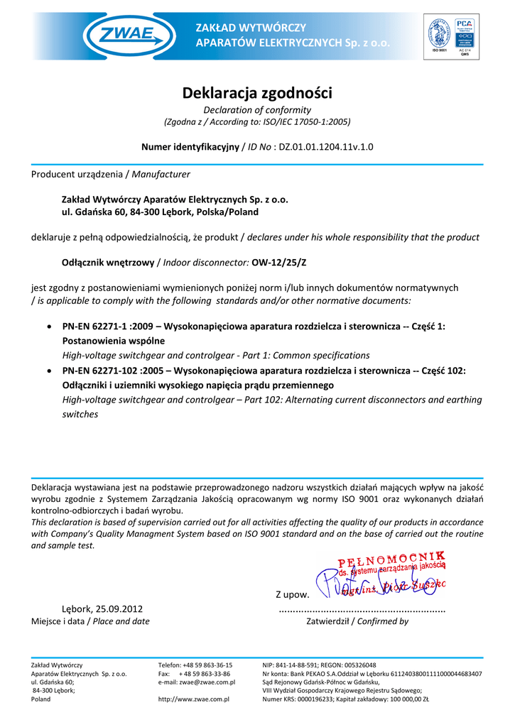 ZAKŁAD WYTWÓRCZY APARATÓW ELEKTRYCZNYCH Sp. z o.o. Deklaracja zgodności Declaration of conformity (Zgodna z / According to: ISO/IEC 17050-1:2005) Numer identyfikacyjny / ID No : DZ.01.01.1204.11v.1.0 Producent urządzenia / Manufacturer Zakład Wytwórczy Aparatów Elektrycznych Sp. z o.o. ul. Gdańska 60, 84-300 Lębork, Polska/Poland deklaruje z pełną odpowiedzialnością, że produkt / declares under his whole responsibility that the product Odłącznik wnętrzowy / Indoor disconnector: OW-12/25/Z jest zgodny z postanowieniami wymienionych poniżej norm i/lub innych dokumentów normatywnych / is applicable to comply with the following standards and/or other normative documents: • • PN-EN 62271-1 :2009 – Wysokonapięciowa aparatura rozdzielcza i sterownicza -- Część 1: Postanowienia wspólne High-voltage switchgear and controlgear - Part 1: Common specifications PN-EN 62271-102 :2005 – Wysokonapięciowa aparatura rozdzielcza i sterownicza -- Część 102: Odłączniki i uziemniki wysokiego napięcia prądu przemiennego High-voltage switchgear and controlgear – Part 102: Alternating current disconnectors and earthing switches Deklaracja wystawiana jest na podstawie przeprowadzonego nadzoru wszystkich działań mających wpływ na jakość wyrobu zgodnie z Systemem Zarządzania Jakością opracowanym wg normy ISO 9001 oraz wykonanych działań kontrolno-odbiorczych i badań wyrobu. This declaration is based of supervision carried out for all activities affecting the quality of our products in accordance with Company’s Quality Managment System based on ISO 9001 standard and on the base of carried out the routine and sample test. Z upow. …………………………………………………… Lębork, 25.09.2012 Miejsce i data / Place and date Zakład Wytwórczy Aparatów Elektrycznych Sp. z o.o. ul. Gdańska 60; 84-300 Lębork; Poland Zatwierdził / Confirmed by Telefon: +48 59 863-36-15 Fax: + 48 59 863-33-86 e-mail: [email protected] http://www.zwae.com.pl NIP: 841-14-88-591; REGON: 005326048 Nr konta: Bank PEKAO S.A.Oddział w Lęborku 61124038001111000044683407 Sąd Rejonowy Gdańsk-Północ w Gdańsku, VIII Wydział Gospodarczy Krajowego Rejestru Sądowego; Numer KRS: 0000196233; Kapitał zakładowy: 100 000,00 ZŁ ZAKŁAD WYTWÓRCZY APARATÓW ELEKTRYCZNYCH Sp. z o.o. Deklaracja zgodności Declaration of conformity (Zgodna z / According to: ISO/IEC 17050-1:2005) Numer identyfikacyjny / ID No : DZ.01.01.1205.11v.1.0 Producent urządzenia / Manufacturer Zakład Wytwórczy Aparatów Elektrycznych Sp. z o.o. ul. Gdańska 60, 84-300 Lębork, Polska/Poland deklaruje z pełną odpowiedzialnością, że produkt / declares under his whole responsibility that the product Odłącznik wnętrzowy / Indoor disconnector: OW-12/40/Z jest zgodny z postanowieniami wymienionych poniżej norm i/lub innych dokumentów normatywnych / is applicable to comply with the following standards and/or other normative documents: • • PN-EN 62271-1 :2009 – Wysokonapięciowa aparatura rozdzielcza i sterownicza -- Część 1: Postanowienia wspólne High-voltage switchgear and controlgear - Part 1: Common specifications PN-EN 62271-102 :2005 – Wysokonapięciowa aparatura rozdzielcza i sterownicza -- Część 102: Odłączniki i uziemniki wysokiego napięcia prądu przemiennego High-voltage switchgear and controlgear – Part 102: Alternating current disconnectors and earthing switches Deklaracja wystawiana jest na podstawie przeprowadzonego nadzoru wszystkich działań mających wpływ na jakość wyrobu zgodnie z Systemem Zarządzania Jakością opracowanym wg normy ISO 9001 oraz wykonanych działań kontrolno-odbiorczych i badań wyrobu. This declaration is based of supervision carried out for all activities affecting the quality of our products in accordance with Company’s Quality Managment System based on ISO 9001 standard and on the base of carried out the routine and sample test. Z upow. …………………………………………………… Lębork, 25.09.2012 Miejsce i data / Place and date Zakład Wytwórczy Aparatów Elektrycznych Sp. z o.o. ul. Gdańska 60; 84-300 Lębork; Poland Zatwierdził / Confirmed by Telefon: +48 59 863-36-15 Fax: + 48 59 863-33-86 e-mail: [email protected] http://www.zwae.com.pl NIP: 841-14-88-591; REGON: 005326048 Nr konta: Bank PEKAO S.A.Oddział w Lęborku 61124038001111000044683407 Sąd Rejonowy Gdańsk-Północ w Gdańsku, VIII Wydział Gospodarczy Krajowego Rejestru Sądowego; Numer KRS: 0000196233; Kapitał zakładowy: 100 000,00 ZŁ ZAKŁAD WYTWÓRCZY APARATÓW ELEKTRYCZNYCH Sp. z o.o. Deklaracja zgodności Declaration of conformity (Zgodna z / According to: ISO/IEC 17050-1:2005) Numer identyfikacyjny / ID No : DZ.01.01.3602.03v.1.0 Producent urządzenia / Manufacturer Zakład Wytwórczy Aparatów Elektrycznych Sp. z o.o. ul. Gdańska 60, 84-300 Lębork, Polska/Poland deklaruje z pełną odpowiedzialnością, że produkt / declares under his whole responsibility that the product Odłącznik wnętrzowy / Indoor disconnector: OW-36/25/Z jest zgodny z postanowieniami wymienionych poniżej norm i/lub innych dokumentów normatywnych / is applicable to comply with the following standards and/or other normative documents: • PN-EN 60129 :2002 – Odłączniki i uziemniki prądu przemiennego Alternating current disconnectors and earthing switches Deklaracja wystawiana jest na podstawie przeprowadzonego nadzoru wszystkich działań mających wpływ na jakość wyrobu zgodnie z Systemem Zarządzania Jakością opracowanym wg normy ISO 9001 oraz wykonanych działań kontrolno-odbiorczych i badań wyrobu. This declaration is based of supervision carried out for all activities affecting the quality of our products in accordance with Company’s Quality Managment System based on ISO 9001 standard and on the base of carried out the routine and sample test. Z upow. …………………………………………………… Lębork, 25.09.2012 Miejs