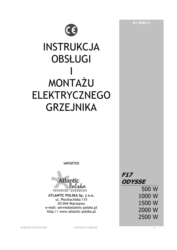 ATL/INS/2008/2/GRZEJNIKI DT 2009/2 INSTRUKCJA OBSŁUGI I MONTAŻU ELEKTRYCZNEGO GRZEJNIKA IMPORTER F17 ODYSSE ATLANTIC POLSKA Sp. z o.o. ul. Płochocińska 115 03-044 Warszawa e-mail: [email protected] http:// www.atlantic-polska.pl GRZEJNIKI ELEKTRYCZNE INSTRUKCJA OBSŁUGI 500 1000 1500 2000 2500 W W W W W - 1- ATL/INS/2008/2/GRZEJNIKI PRZED ROZPOCZĘCIEM MONTAŻU URZĄDZENIA NALEŻY ZAPOZNAĆ SIĘ Z NINIEJSZĄ INSTRUKCJĄ NALEŻY ZACHOWAĆ NINIEJSZĄ INSTRUKCJĘ OBSŁUGI MONTAŻ URZĄDZENIA (POD RYGOREM UTRATY GWARANCJI) NALEŻY PRZEPROWADZAĆ W OPARCIU O NORMY OBOWIĄZUJĄCE W DANYM KRAJU ORAZ INFORMACJE ZAWARTE W NINIEJSZEJ INSTRUKCJI I - GDZIE ZAINSTALOWAĆ URZĄDZENIE ? Urządzenie, które Państwo nabyli, zostało zaprojektowane do ogrzewania pomieszczeń mieszkalnych, biurowych, hotelowych itp. W przypadku montażu urządzenia w miejscu o innym przeznaczeniu, należy zasięgnąć opinii producenta. Urządzenie zostało wyposażone w zabezpieczenia wykonane w 2 klasie ochronności – CLASSE II, posiada również zabezpieczenie przeciwbryzgowe umożliwiające montaż urządzenia w 2 strefie pomieszczenia łazienki. (rys.) Wybierając miejsce montażu urządzenia, konieczne jest zachowanie minimalnych odległości pomiędzy urządzeniem a innymi przedmiotami znajdującymi się w danym pomieszczeniu. (rys.) Lekka konstrukcja urządzenia umożliwia jego montaż praktycznie na wszystkich rodzajach ścian. Jeżeli ściany pomieszczenia wykonane są z drewna lub powierzchnia pomieszczenia pokryta jest tapetami o podkładzie piankowym, pomiędzy ścianę danego pomieszczenia a stelaż urządzenia należy włożyć specjalną podkładkę izolacyjną.     NIE WOLNO INSTALOWAĆ URZĄDZENIA: W MIEJSCU WYSTĘPOWANIA PRZECIĄGÓW, GDYŻ MOGŁOBY TO ZAKŁÓCIĆ PRAWIDŁOWĄ JEGO REGULACJĘ, W BEZPOŚREDNIM SĄSIEDZTWIE OTWORÓW LUB URZĄDZEŃ KONTROLUJĄCYCH WENTYLACJĘ I KLIMATYZACJĘ, PONIŻEJ GNIAZDEK ELEKTRYCZNYCH BĘDĄCYM STALE POD NAPIĘCIEM, NA WYSOKOŚCI POWYŻEJ 1000 M N.P.M., GDYŻ NA TAKIEJ WYSOKOŚCI NATURALNE POWIETRZE JEST ZBYT ROZRZEDZONE II – MONTAŻ URZĄDZENIA 2.1 MONTAŻ UCHWYTU MONTAŻOWEGO: Aby prawidłowo wykonać mocowanie należy:  zdjąć stelaż z urządzenia,  postawić stelaż na podłodze (rys.1),  zaznaczyć i wywiercić 2 otwory (rys.2),  podnieść stelaż i umieścić śruby w uprzednio wywierconych otworach,  wywiercić pozostałe 2 otwory (rys.2),  przyłożyć i zamontować stelaż do ściany danego pomieszczenia. GRZEJNIKI ELEKTRYCZNE INSTRUKCJA OBSŁUGI - 2- ATL/INS/2008/2/GRZEJNIKI 2.2 – MONTAŻ URZĄDZENIA Aby prawidłowo zamontować urządzenia na stelażu, należy:  umieścić grzejnik na specjalnych języczkach (S1) wystających ze stelażu ( rys),  ułożyć grzejnik w pozycji pionowej,  równomiernie opuścić grzejnik dołu,  zatrzasnąć (zablokować) klipy. (S2) Aby urządzenie zdemontować należy powyższe czynności wykonać w odwrotnej kolejności. 2.3 – PODŁĄCZENIE ELEKTRYCZNE URZĄDZENIE PRZEWIDZIANE JEST DO WSPÓŁPRACY Z NAPIĘCIEM 230 V , 50 HZ URZĄDZENIE NIE WYMAGA I NIE POSIADA PRZEWODU UZIEMIENIA, DLATEGO ZABRANIA SIĘ JAKIEJ KOLWIEK PRÓBY UZIEMIENIA URZĄDZENIA Aby podłączyć urządzenie pod napięcie elektryczne, należy:  sprawdzić czy wartość napięcia w sieci odpowiada wartości podanej na tabliczce znamionowej,  włączyć wtyczkę Euro, którą zakończony jest przewód elektryczny do gniazdka sieciowego   Jeśli instalacja elektryczna posiada podłączenia stałe ( puszki elektryczne), wówczas możliwe jest ucięcie przewodu elektrycznego i wpięcie grzejnika bezpośrednio do puszki podłączeniowej obowiązkowo należy zachować prawidłową biegunowość przewodów, puszkę przyłączeniową lub gniazdko sieciowe należy zamontować przynajmniej 10 cm nad podłogą. W pomieszczeniach o dużej wilgotności tj. łazienki, czy kuchnie, instalacja elektryczna powinna być wyposażona w mechanizm odcięcia zasilania na wszystkich biegunach (bezpiecznik różnicowy). Wymiana zbyt krótkiego lub uszkodzonego przewodu zasilania elektrycznego, może dokonać jedynie wykwalifikowany specjalista z użyciem specjalistycznych narzędzi. GRZEJNIKI ELEKTRYCZNE INSTRUKCJA OBSŁUGI - 3- ATL/INS/2008/2/GRZEJNIKI 2.4 – PRACA W SIECI Tabela poleceń jakie urządzenie może odbierać za pośrednictwem przewodu sterującego (do zmierzenia między przewodem sterującym a punktem zerowym) Polecenia te są zgodne z wymogami DOMERGIE, EDF, GIFAM (bezpieczeństwo działania systemów sterowanych przewodem sterującym) z dn. 07/07/1997. odbierane polecenia brak prądu oscyloskop _________ uzyskany tryb CONFORT przemienność, brak prądu (4’57”), faza 230V (3”) przemienność, brak prądu (4’53”) faza 230V (7”) CONFORT -1ºC CONFORT -2ºC przemienność całkowita 230V półprzemienność ujemna -115V półprzemienność dodatnia +115V ECO ANTYZAMARZANIEL STOP III – UŻYTKOWANIE PRZY PIERWSZYM URUCHOMIENIU MOŻE DOJŚĆ DO WYDZIELANIA SIĘ Z GRZEJNIKA SPECYFICZNEGO ZAPACHU JEST TO ZJAWISKO NORMALNE, BĘDĄCE WYNIKIEM WYPALANIA SIĘ SMARU Z ELEMENTU GRZEWCZEGO W TAKIM PRZYPADKU NALEŻY INTENSYWNIE PRZEWIETRZYĆ DANE POMIESZCZENIE Prace, przy których mogą powstawać łatwopalne opary tj. lakierowanie parkietów, układanie wykładzin z PCV albo stosowanie pasty do podłóg w sprayu, z dodatkiem benzyny itp. należy wykonywać przy wyłączonym grzejniku. 3.1 - WŁĄCZENIE URZĄDZENIA Do włączenia urządzenia lub jego wyłączenia służy przełącznik (1) umieszczony z prawej strony termostatu temperatury (rys.). Przycisk ten należy przełączyć w położenie ( I ). . Aby urządzenie wyłączyć przycisk (1) należy przełączyć w położenie ( O ) przełącznik (1) pokrętło temperatury 3.2 - USTAWIENIE TEMPERATURY KOMFORT Mówiąc o temperaturze KOMFORTOWEJ mamy na myśli temperaturę, jaką powinno osiągnąć dane pomieszczenie w chwili, gdy przebywają w nim mieszkańcy. W tym celu należy po