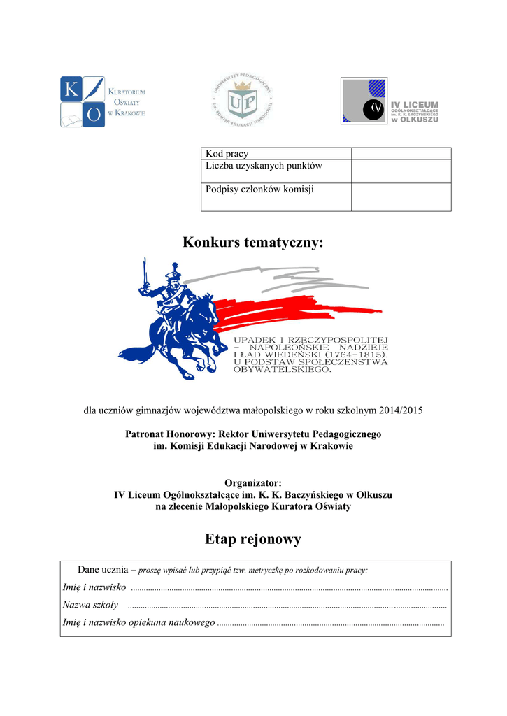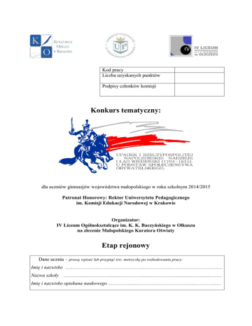 Kod pracy Liczba uzyskanych punktów Podpisy członków komisji Konkurs tematyczny: dla uczniów gimnazjów województwa małopolskiego w roku szkolnym 2014/2015 Patronat Honorowy: Rektor Uniwersytetu Pedagogicznego im. Komisji Edukacji Narodowej w Krakowie Organizator: IV Liceum Ogólnokształcące im. K. K. Baczyńskiego w Olkuszu na zlecenie Małopolskiego Kuratora Oświaty Etap rejonowy Dane ucznia – proszę wpisać lub przypiąć tzw. metryczkę po rozkodowaniu pracy: Imię i nazwisko ..................................................................................................................................................... Nazwa szkoły ............................................................................................................................. ......................... Imię i nazwisko opiekuna naukowego ........................................................................................................... Konkurs tematyczny: Upadek I Rzeczypospolitej. Napoleońskie nadzieje i ład wiedeński (1764-1815). U podstaw społeczeństwa obywatelskiego Szanowny Gimnazjalisto! Przed Tobą znajduje się test zawierający 14 zadań konkursowych poświęconych upadkowi I Rzeczypospolitej oraz czasom napoleońskim. Zanim przystąpisz do udzielania odpowiedzi przeczytaj uważnie pytania. Wykonuj zadania zgodnie z poleceniami. Pamiętaj, pisz wyraźnie oraz nie używaj korektora i ołówka. Staraj się nie popełniać błędów przy zaznaczaniu odpowiedzi, ale jeśli się pomylisz, błędne zaznaczenie otocz kółkiem i zaznacz inną odpowiedź. Powodzenia ☺ Czas trwania testu – 90 minut Maksymalna liczba punktów do zdobycia – 120 2 Konkurs tematyczny: Upadek I Rzeczypospolitej. Napoleońskie nadzieje i ład wiedeński (1764-1815). U podstaw społeczeństwa obywatelskiego I. Wskaż jedną prawidłową odpowiedź na poniższe pytania. (0-15 pkt.) 1. W 1763 roku stronnictwo polityczne Familia prowadziło politykę zagraniczną: a. prorosyjską b. proaustriacką c. propruską 2. Szkoła Rycerska została założona w: a. 1765 roku b. 1773 roku c. 1788 roku 3. Kopalnie soli w Bochni i Wieliczce zostały włączone do zaboru austriackiego w: a. 1768 roku b. 1772 roku c. 1795 roku 4. Ostatnim Naczelnikiem Powstania Kościuszkowskiego był: a. Jakub Jasiński b. Tomasz Wawrzecki c. Jan Kiliński 5. W bitwie pod Szczekocinami Tadeusz Kościuszko walczył z połączonymi wojskami: a. rosyjsko-austriackimi b. rosyjsko-pruskimi c. prusko-austriackimi 6. Prawo o miastach królewskich sejm przyjął w: a. kwietniu 1790 roku b. kwietniu 1791 roku c. kwietniu 1792 roku 3 Konkurs tematyczny: Upadek I Rzeczypospolitej. Napoleońskie nadzieje i ład wiedeński (1764-1815). U podstaw społeczeństwa obywatelskiego 7. Grzegorz Piramowicz był: a. Sekretarzem w Szkole Rycerskiej b. Sekretarzem Komisji Edukacji Narodowej c. Sekretarzem Towarzystwa do Ksiąg Elementarnych 8. Założycielem i wieloletnim dyrektorem Teatru Narodowego był: a. Adam Naruszewicz b. Wojciech Bogusławski c. Julian Ursyn Niemcewicz 9. Napoleon Bonaparte został pierwszym konsulem w: a. 1799 roku b. 1800 roku c. 1801 roku 10. Na czele Legii Naddunajskiej stał: a. gen. Karol Kniaziewicz b. gen. Jan Henryk Dąbrowski c. gen. Jan Kozietulski 11. IV koalicja antyfrancuska powstała w: a. w lecie 1805 roku b. w lecie 1806 roku c. w lecie 1809 roku 12. „Drugą wojnę polską” Napoleon rozpoczął z: a. Prusami b. Austrią c. Rosją 4 Konkurs tematyczny: Upadek I Rzeczypospolitej. Napoleońskie nadzieje i ład wiedeński (1764-1815). U podstaw społeczeństwa obywatelskiego 13. Księstwo Warszawskie powiększono o cztery nowe departamenty na mocy traktatu w: a. Schᴕnbrunn b. Tylży c. Preszburgu 14. W bitwie pod Waterloo Napoleon został pokonany przez wojska: a. rosyjsko-pruskie b. angielsko-pruskie c. austriacko-pruskie 15. Prusy w czasie obrad kongresu wiedeńskiego reprezentował: a. Fryderyk II b. Wilhelm II c. Fryderyk Wilhelm III II. Ułóż w kolejności chronologicznej podane poniżej wydarzenia, rozpoczynając od wydarzenia najwcześniejszego. Wpisz je do tabeli. (0-3 pkt.) a. konsulat b. monarchia c. dyrektoriat d. cesarstwo e. republika 1 2 3 4 5 5 Konkurs tematyczny: Upadek I Rzeczypospolitej. Napoleońskie nadzieje i ład wiedeński (1764-1815). U podstaw społeczeństwa obywatelskiego a. bitwa pod Austerlitz b. bitwa pod Hohenlinden c. bitwa pod Borodino d. bitwa pod Frydlandem e. bitwa pod Wagram 1 2 3 4 5 3 4 5 a. Czarna procesja w Warszawie b. bitwa pod Racławicami c. konfederacja barska d. II rozbiór Polski e. bitwa pod Zieleńcami 1 III. 2 Uzupełnij tabelę, wpisując po 3 państwa, w odniesieniu do których uczestnicy kongresu wiedeńskiego zastosowali zasadę legitymizmu i równowagi europejskiej. Wyjaśnij na czym polegały te zasady. (0-10 pkt.) Kongres Wiedeński 1815 rok Legitymizm Zasada równowagi europejskiej 6 Konkurs tematyczny: Upadek I Rzeczypospolitej. Napoleońskie nadzieje i ład wiedeński (1764-1815). U podstaw społeczeństwa obywatelskiego 1. Zasada legitymizmu (0-2 pkt.) ………………………………………………………………………………………………… ………………………………………………………………………………………………… 2. Zasada równowagi europejskiej (0-2 pkt.) ………………………………………………………………………………………………...… ……………………………………………………………………………………………...…… IV. Jakiego wydarzenia dotyczą poniższe nagłówki prasowe: (0-1 pkt.) a. „Potwór uszedł z wygnania” b. „Korsykański wilkołak wkroczył do kraju” c. „Tyran zatrzymał się w Lyonie” d. „Cesarz jest w Fontainebleau” ………………………………………………………………………………………………………………. V. Spośród przytoczonych poniżej postanow