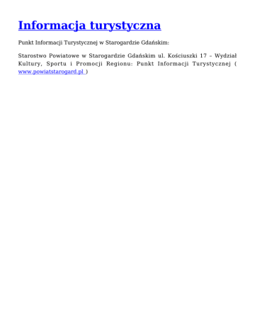Informacja turystyczna Punkt Informacji Turystycznej w Starogardzie Gdańskim: Starostwo Powiatowe w Starogardzie Gdańskim ul. Kościuszki 17 – Wydział Kultury, Sportu i Promocji Regionu: Punkt Informacji Turystycznej ( www.powiatstarogard.pl )